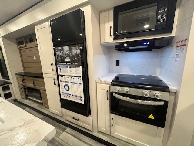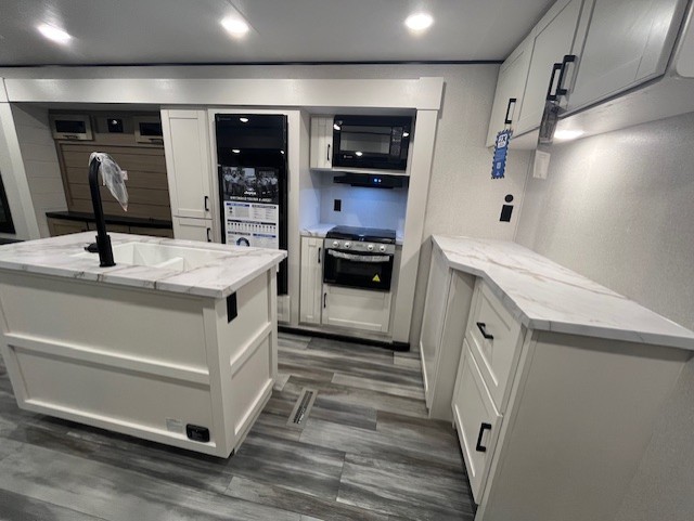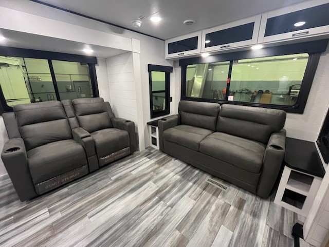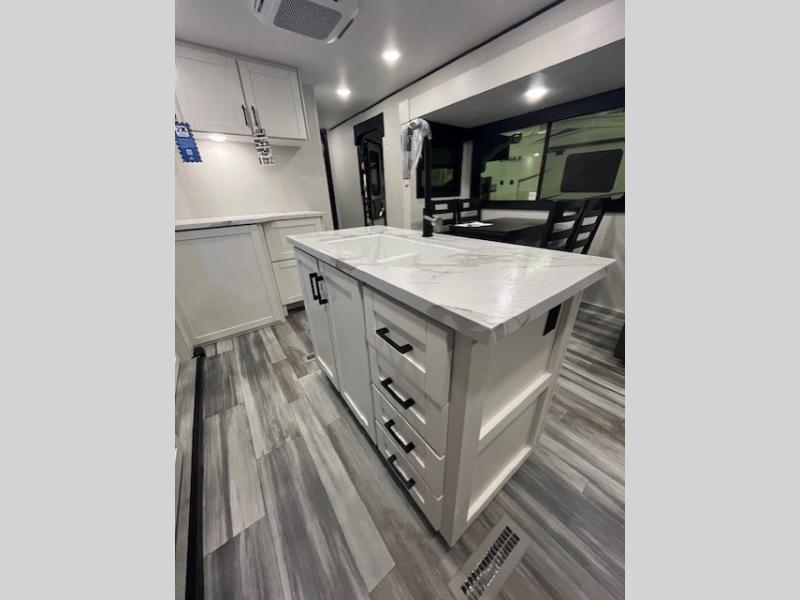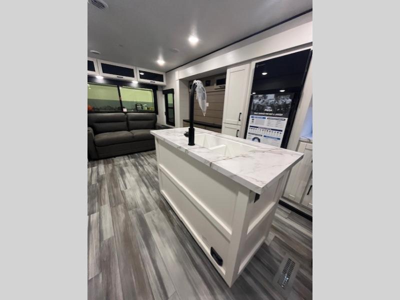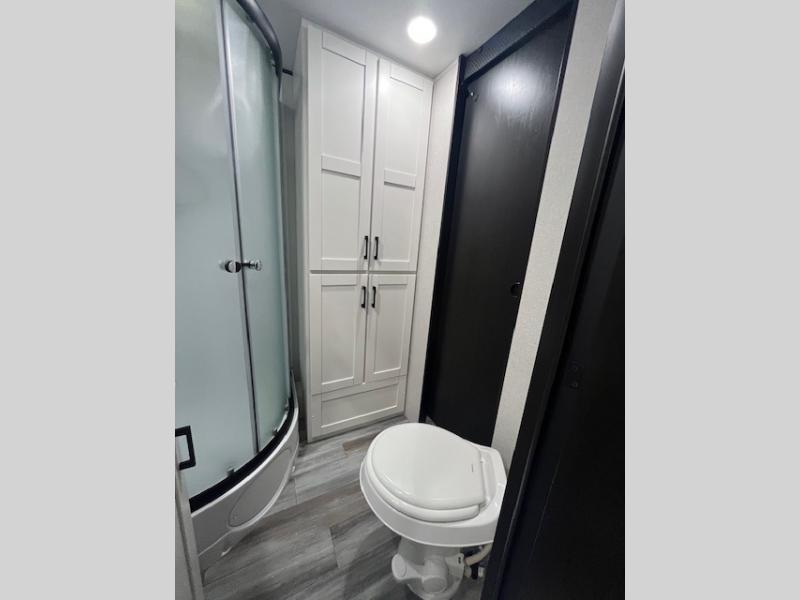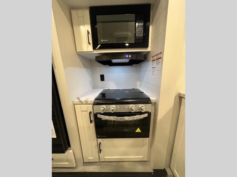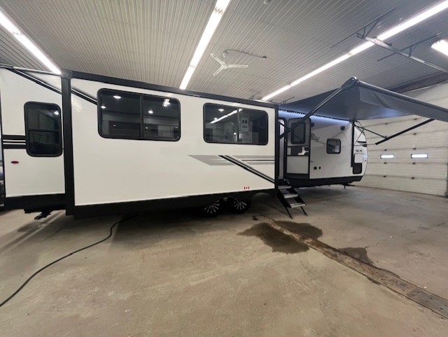 Enjoy a relaxing weekend getaway in this travel trailer! The dual entry bathroom with radius shower creates a front master suite with a queen bed slide, a dresser, and a front large wardrobe with storage space plus washer and dryer prep. The chef will have an easy time preparing their best home cooked meals with the kitchen island, hutch, three burner cooktop, and 12V refrigerator. Enjoy your meals at the booth dinette then play a card game or transform it into an extra sleeping space. The rear living area has a rear Jack-knife sofa for a quick afternoon nap and theater seating across from the entertainment center with a fireplace for the perfect spot on movie night!