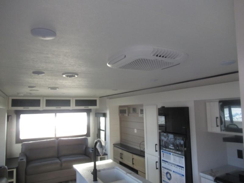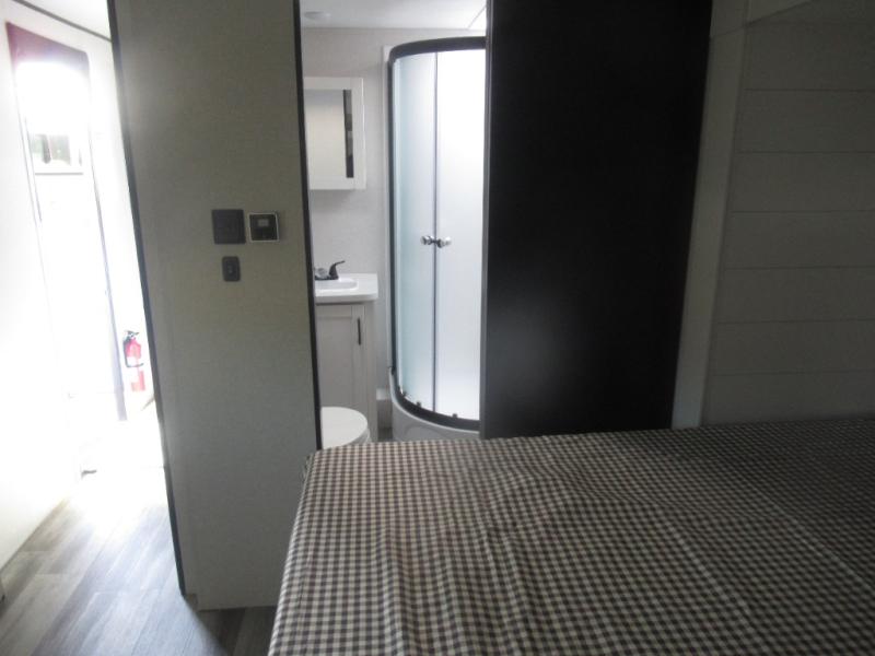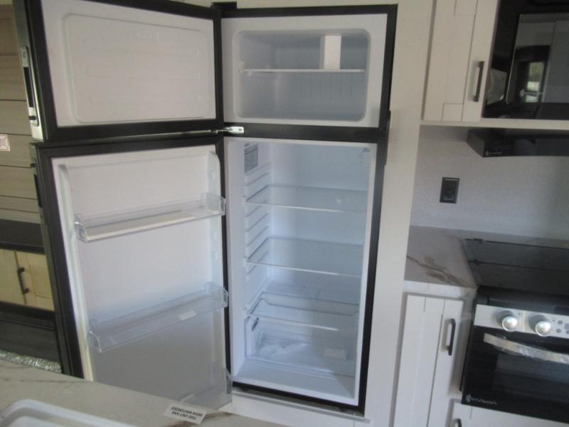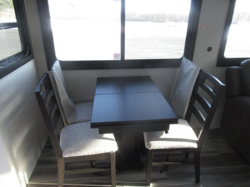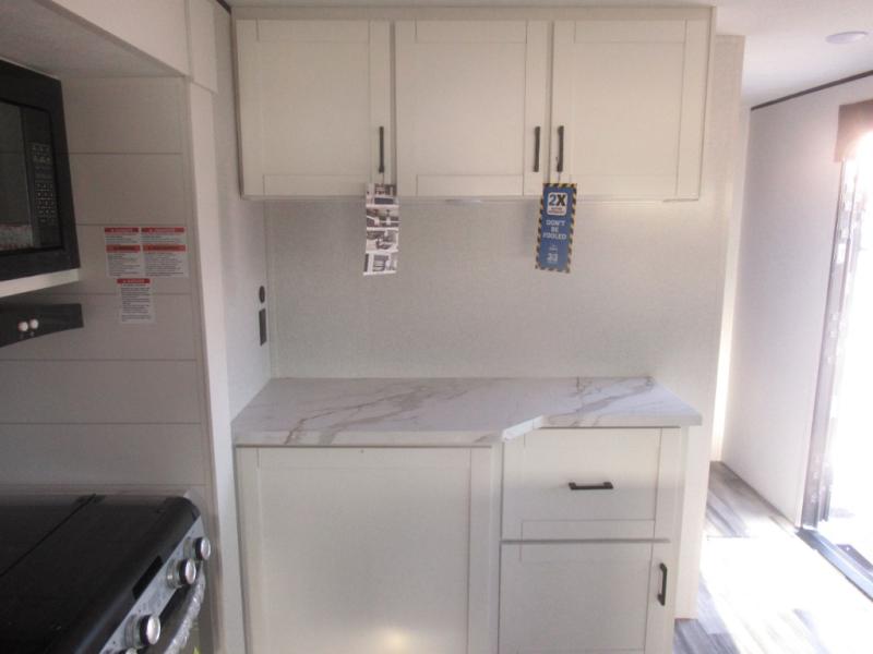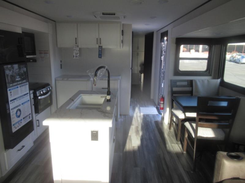 Enjoy a relaxing weekend getaway in this travel trailer! The dual entry bathroom with radius shower creates a front master suite with a queen bed slide, a dresser, and a front large wardrobe with storage space plus washer and dryer prep. The chef will have an easy time preparing their best home cooked meals with the kitchen island, hutch, three burner cooktop, and 12V refrigerator. Enjoy your meals at the booth dinette then play a card game or transform it into an extra sleeping space. The rear living area has a rear Jack-knife sofa for a quick afternoon nap and theater seating across from the entertainment center with a fireplace for the perfect spot on movie night!