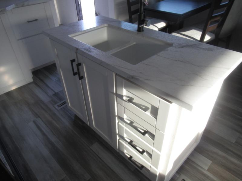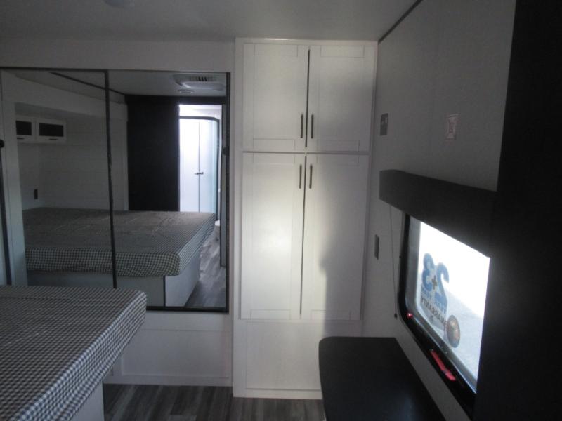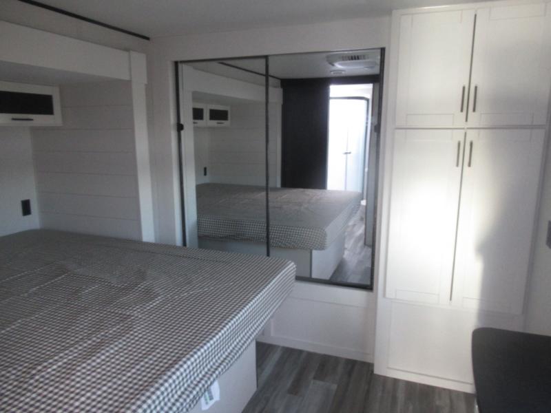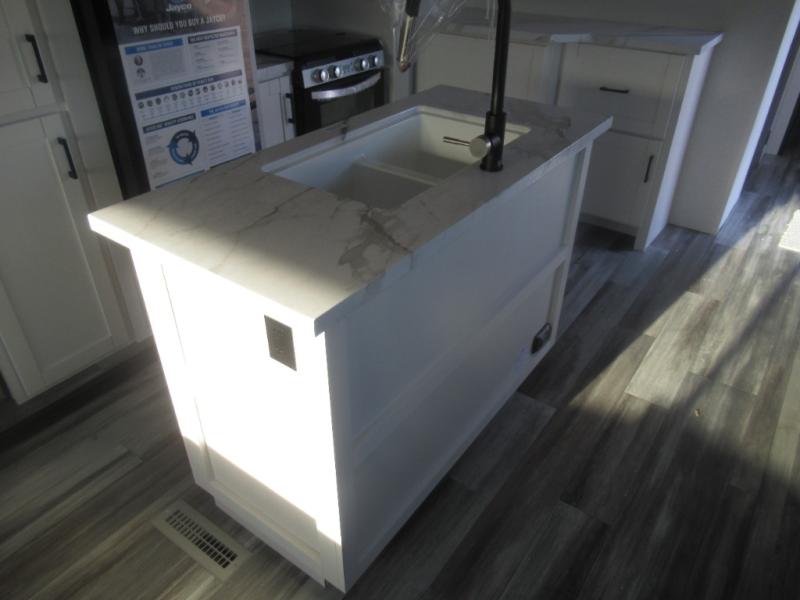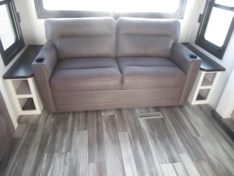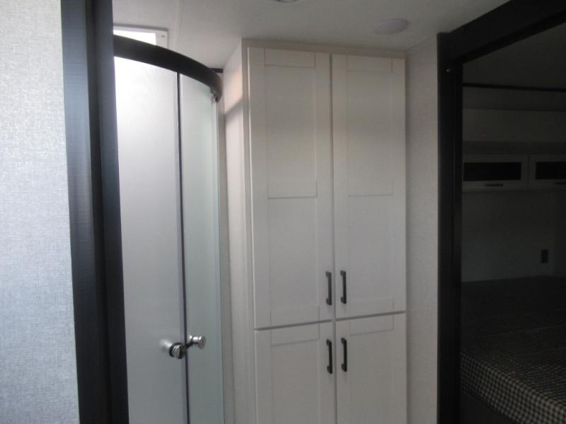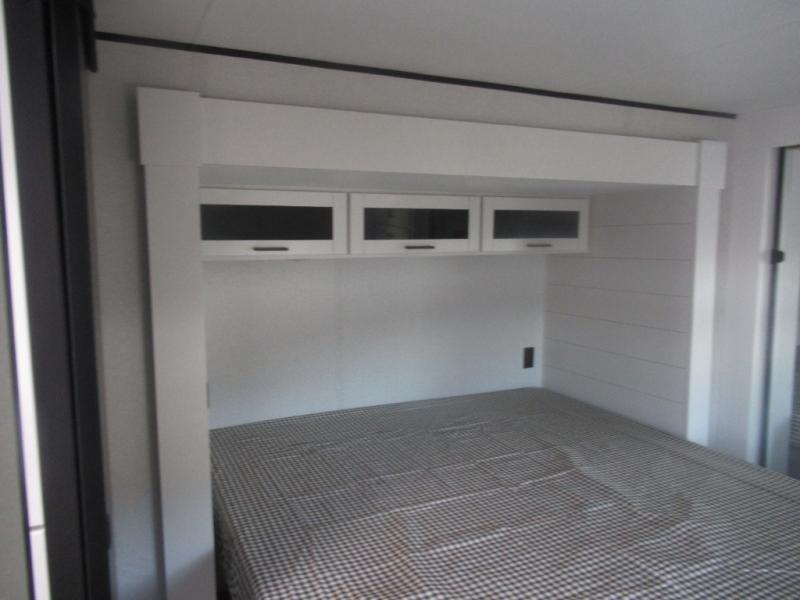 Enjoy a relaxing weekend getaway in this travel trailer! The dual entry bathroom with radius shower creates a front master suite with a queen bed slide, a dresser, and a front large wardrobe with storage space plus washer and dryer prep. The chef will have an easy time preparing their best home cooked meals with the kitchen island, hutch, three burner cooktop, and 12V refrigerator. Enjoy your meals at the booth dinette then play a card game or transform it into an extra sleeping space. The rear living area has a rear Jack-knife sofa for a quick afternoon nap and theater seating across from the entertainment center with a fireplace for the perfect spot on movie night!