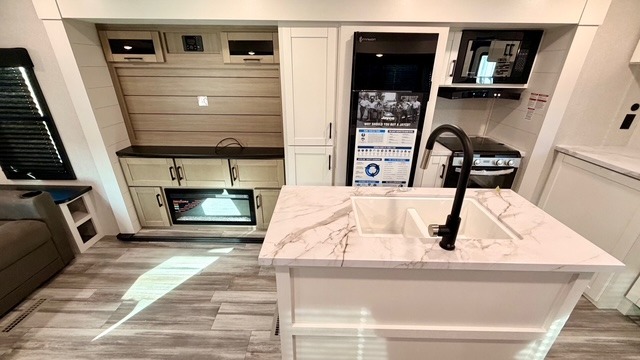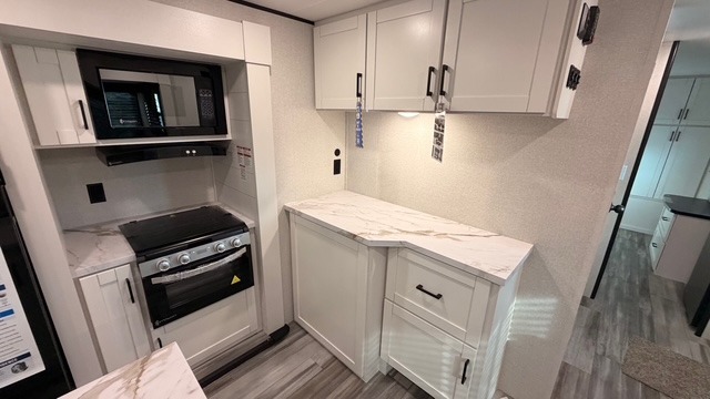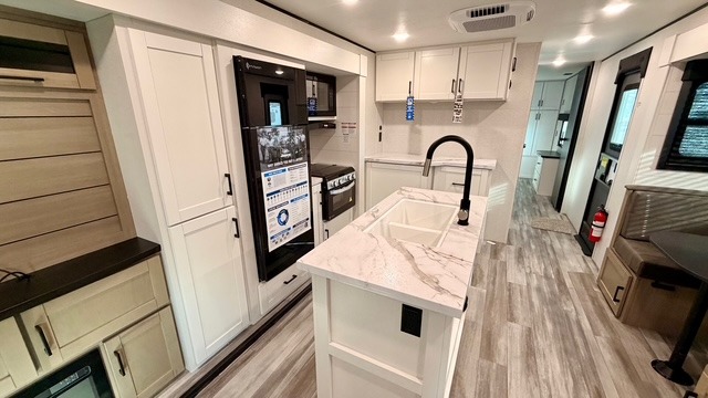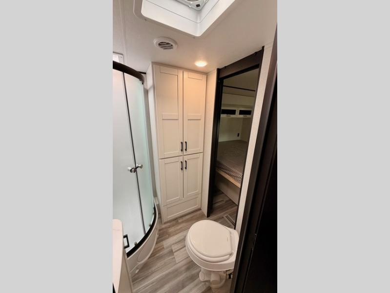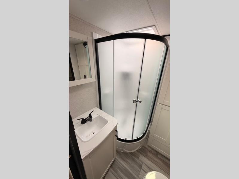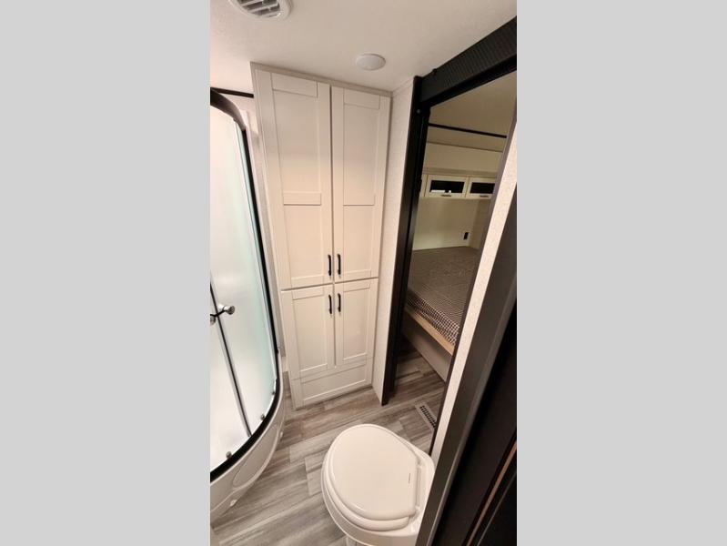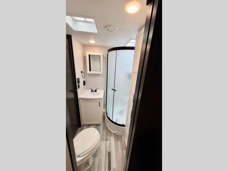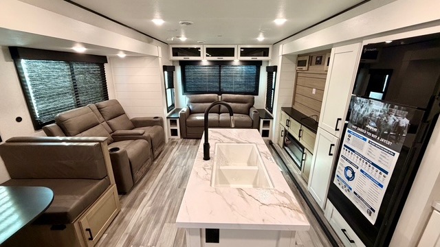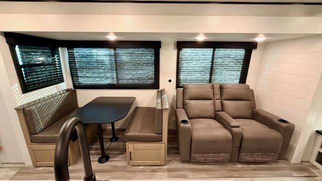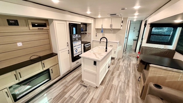 Enjoy a relaxing weekend getaway in this travel trailer! The dual entry bathroom with radius shower creates a front master suite with a queen bed slide, a dresser, and a front large wardrobe with storage space plus washer and dryer prep. The chef will have an easy time preparing their best home cooked meals with the kitchen island, hutch, three burner cooktop, and 12V refrigerator. Enjoy your meals at the booth dinette then play a card game or transform it into an extra sleeping space. The rear living area has a rear Jack-knife sofa for a quick afternoon nap and theater seating across from the entertainment center with a fireplace for the perfect spot on movie night!