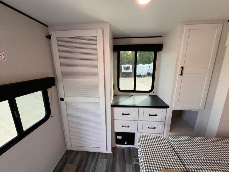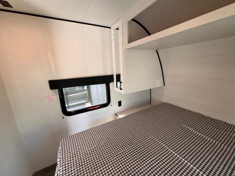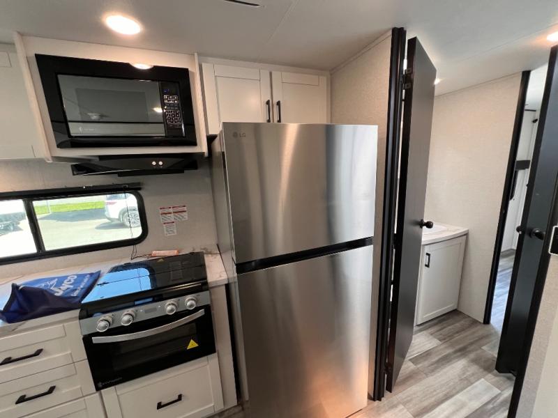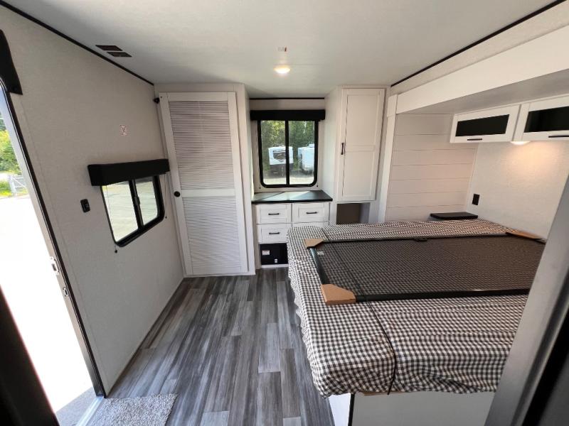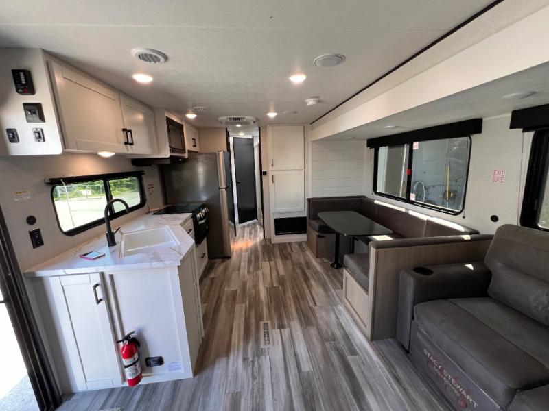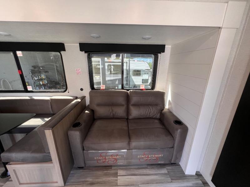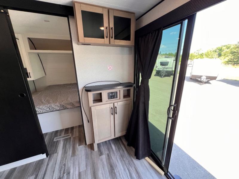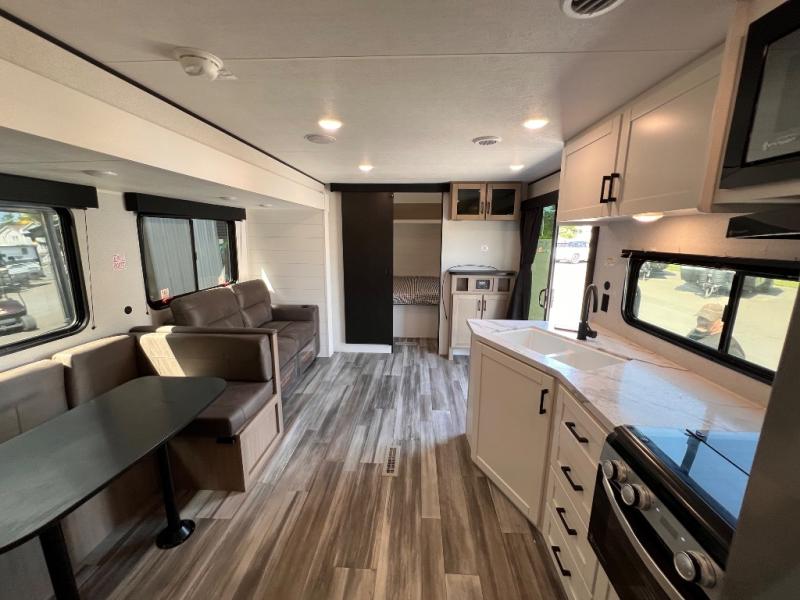 With two private bedrooms, everyone will have a comfortable place to sleep in this travel trailer! The front private bedroom has a 60" x 75" queen bed with wardrobes on either side and the rear private bedroom has a 60" x 80" queen bed slide with a dresser, a wardrobe, one of the exit/entrance doors, and an entrance into the walk-through bathroom which has a radius shower for everyone to stay squeaky clean. The patio doors not only make it easy to enter and exit the unit, but also bring in tons of natural lighting. After you have prepared a delicious home cooked meal, you can can head to the U-shaped dinette to enjoy it there comfortably then relax on the Jack-knife sofa across from the entertainment center!