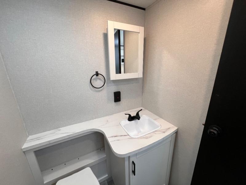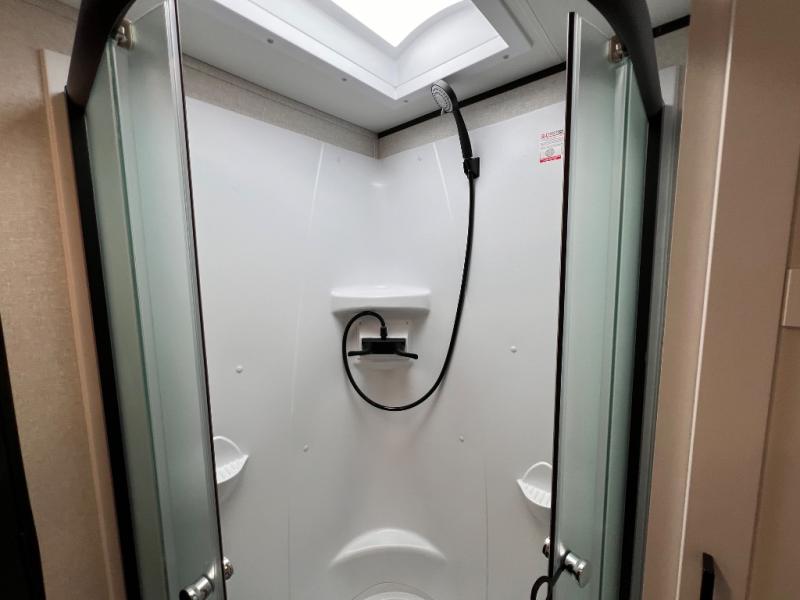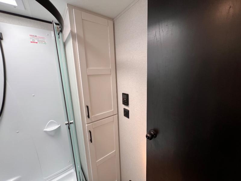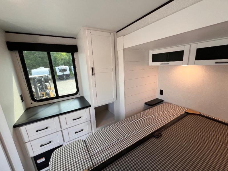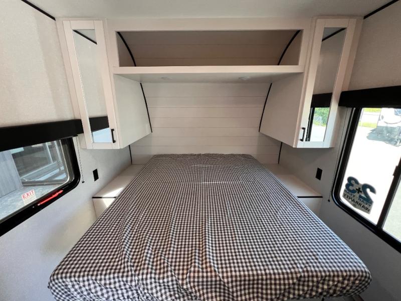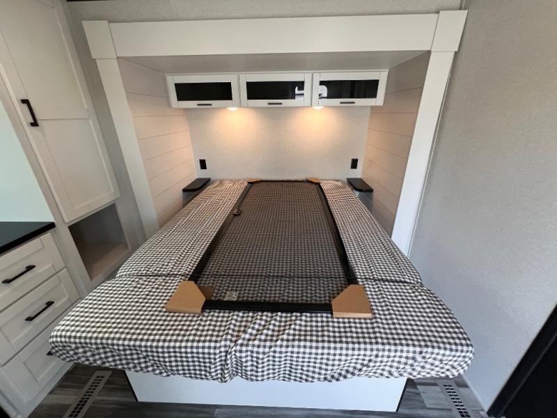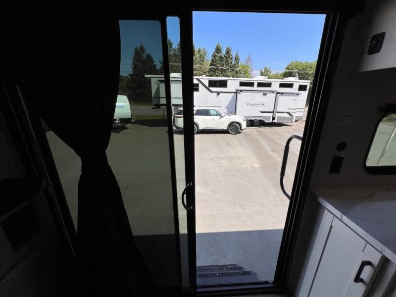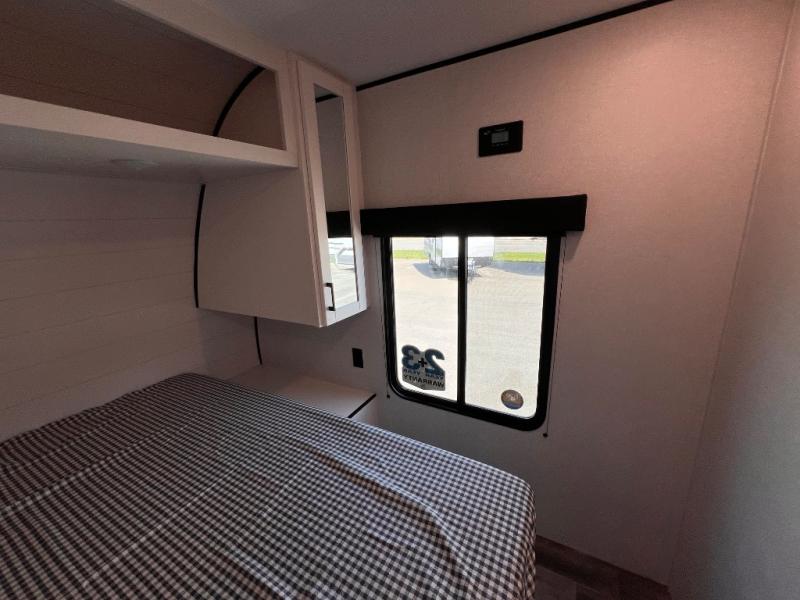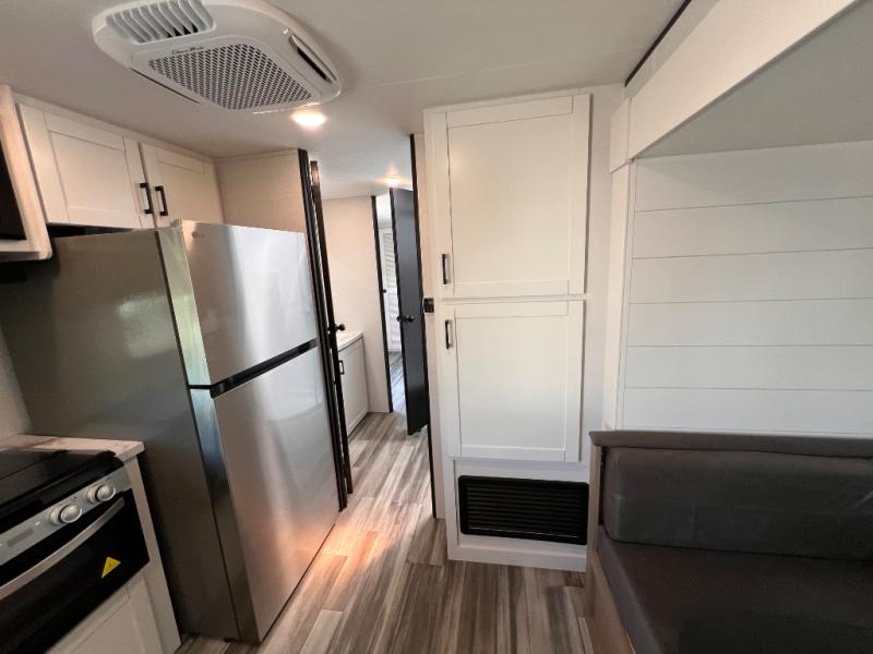 With two private bedrooms, everyone will have a comfortable place to sleep in this travel trailer! The front private bedroom has a 60" x 75" queen bed with wardrobes on either side and the rear private bedroom has a 60" x 80" queen bed slide with a dresser, a wardrobe, one of the exit/entrance doors, and an entrance into the walk-through bathroom which has a radius shower for everyone to stay squeaky clean. The patio doors not only make it easy to enter and exit the unit, but also bring in tons of natural lighting. After you have prepared a delicious home cooked meal, you can can head to the U-shaped dinette to enjoy it there comfortably then relax on the Jack-knife sofa across from the entertainment center!