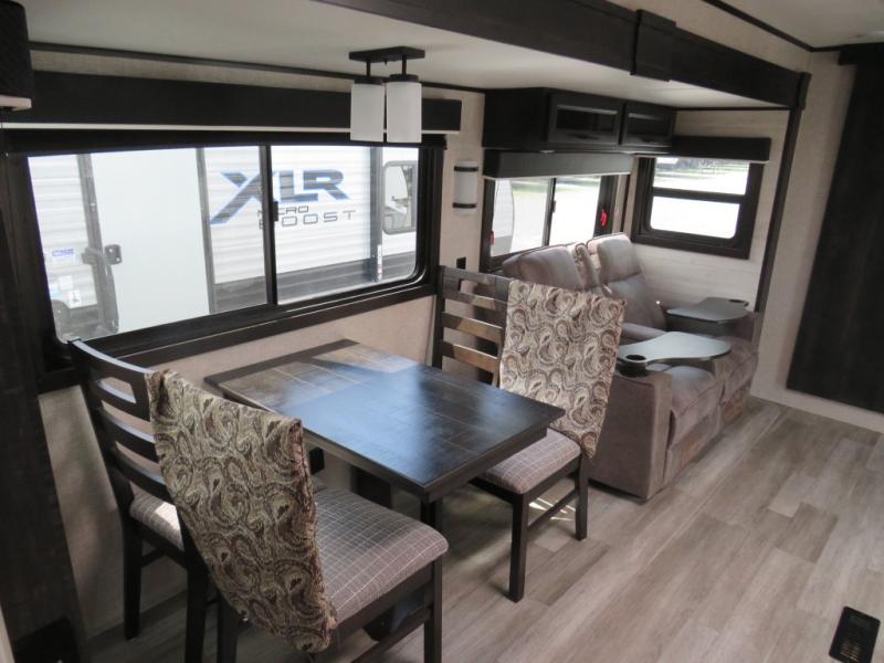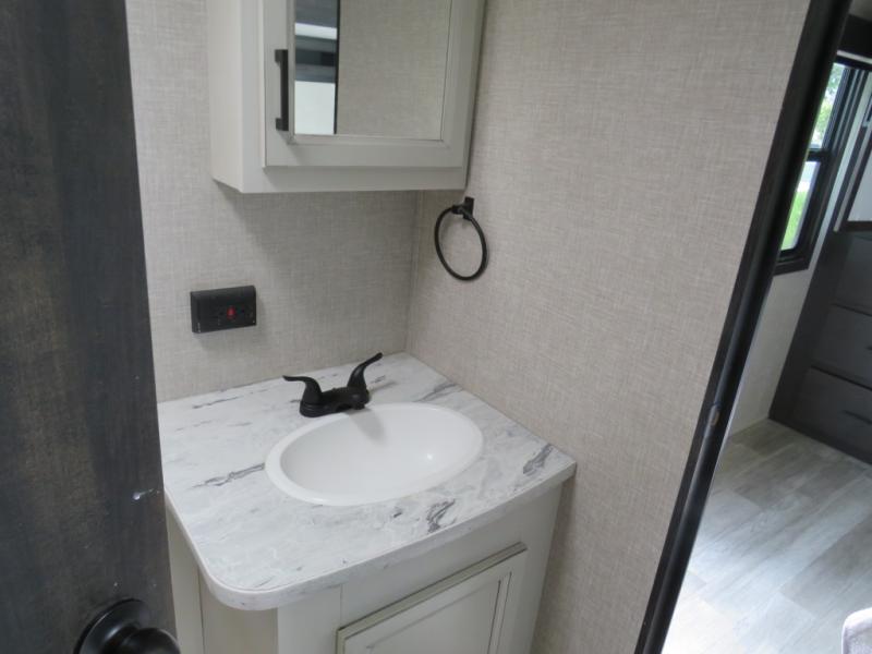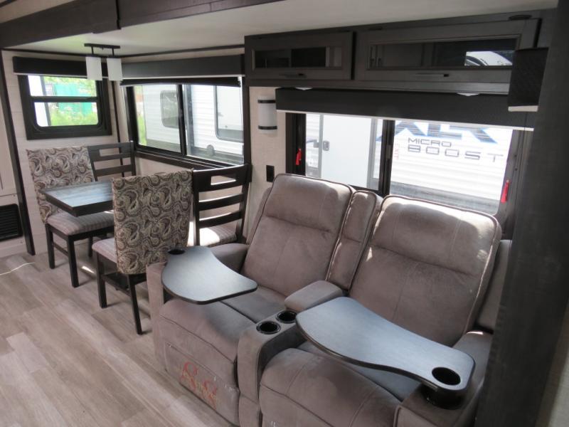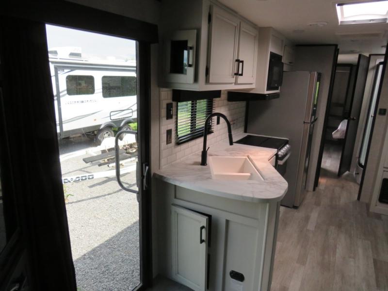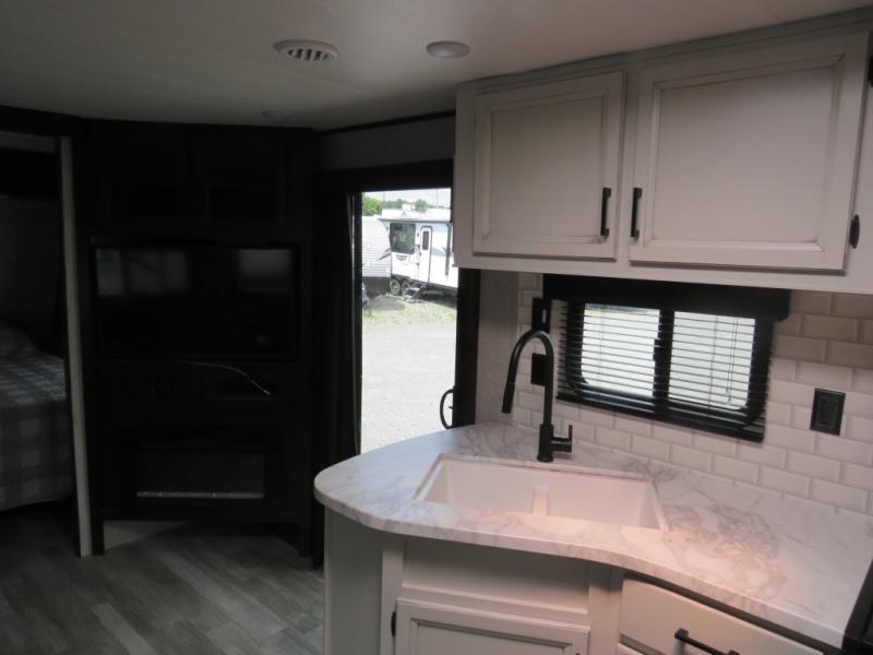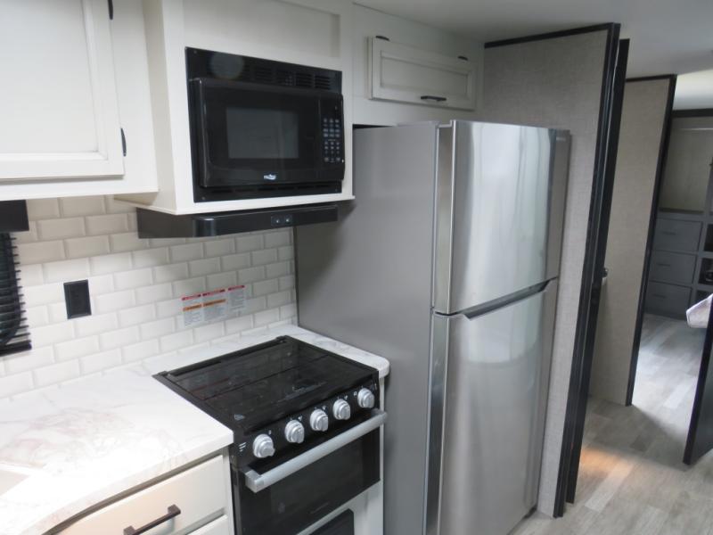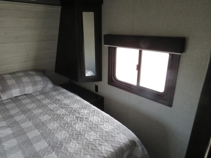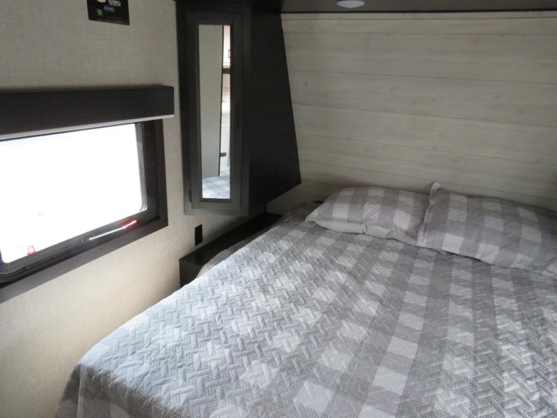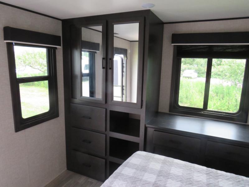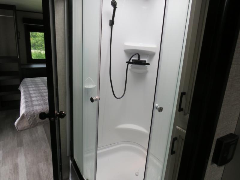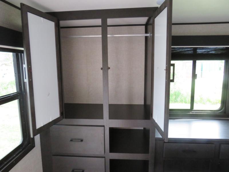 With two private bedrooms, everyone will have a comfortable place to sleep in this travel trailer! The front private bedroom has a 60" x 75" queen bed with wardrobes on either side and the rear private bedroom has a 60" x 80" queen bed slide with a dresser, a wardrobe, one of the exit/entrance doors, and an entrance into the walk-through bathroom which has a radius shower for everyone to stay squeaky clean. The patio doors not only make it easy to enter and exit the unit, but also bring in tons of natural lighting. After you have prepared a delicious home cooked meal, you can can head to the U-shaped dinette to enjoy it there comfortably then relax on the Jack-knife sofa across from the entertainment center!