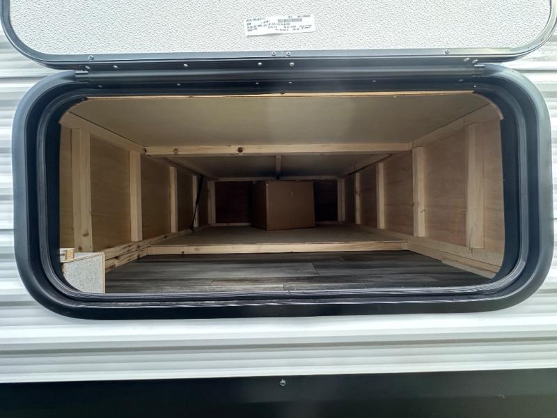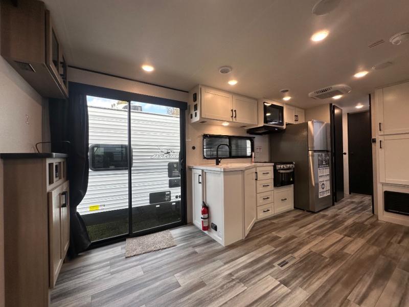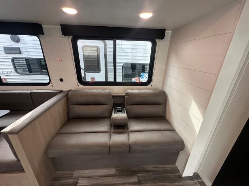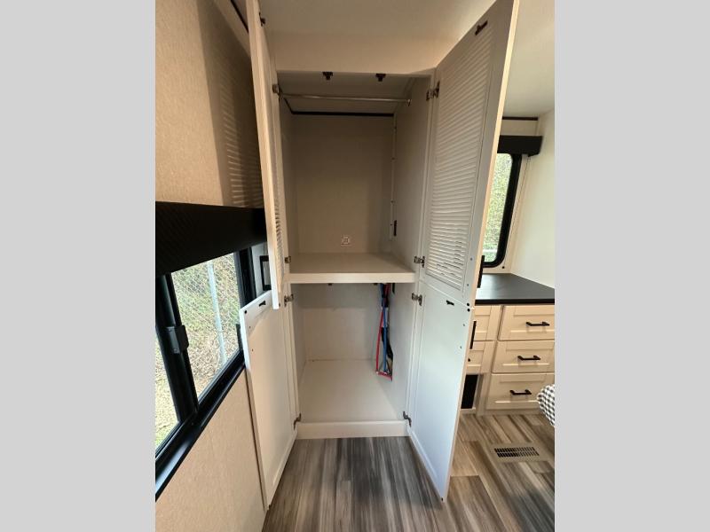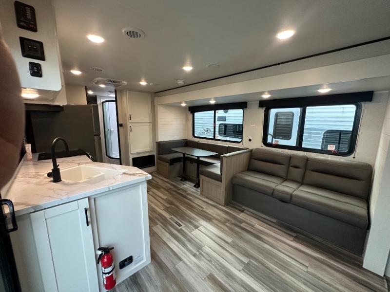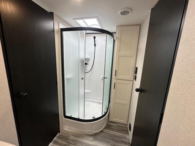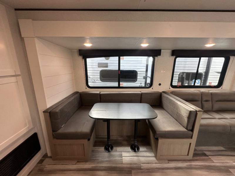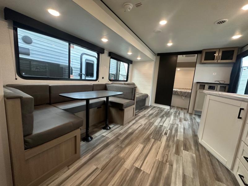 With two private bedrooms, everyone will have a comfortable place to sleep in this travel trailer! The front private bedroom has a 60" x 75" queen bed with wardrobes on either side and the rear private bedroom has a 60" x 80" queen bed slide with a dresser, a wardrobe, one of the exit/entrance doors, and an entrance into the walk-through bathroom which has a radius shower for everyone to stay squeaky clean. The patio doors not only make it easy to enter and exit the unit, but also bring in tons of natural lighting. After you have prepared a delicious home cooked meal, you can can head to the U-shaped dinette to enjoy it there comfortably then relax on the Jack-knife sofa across from the entertainment center!