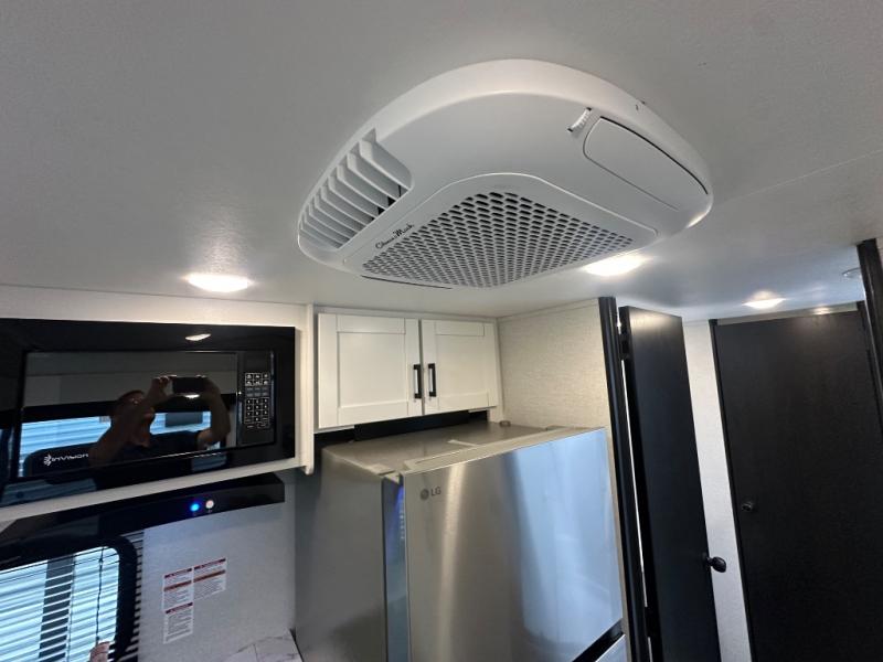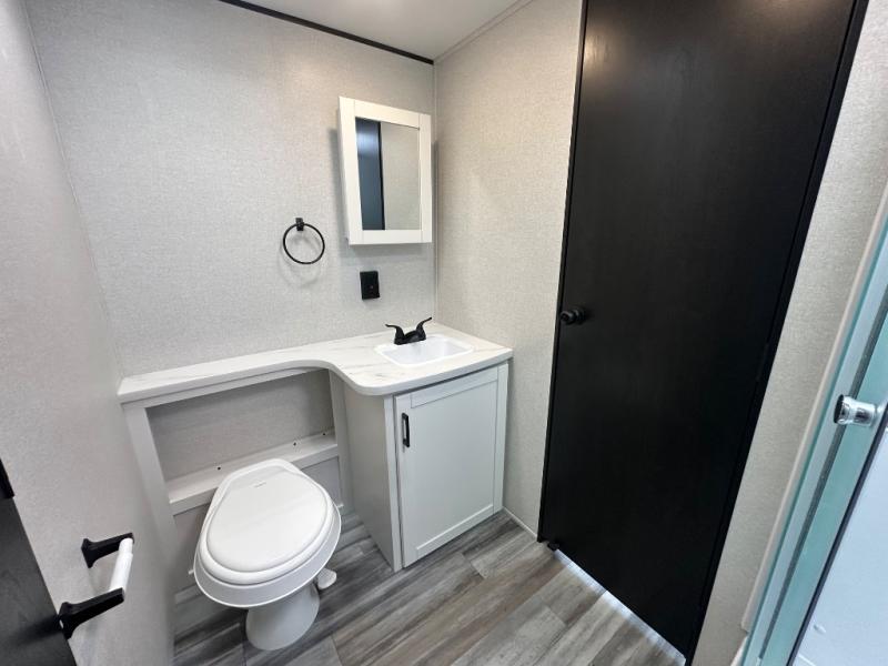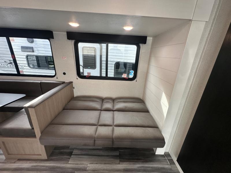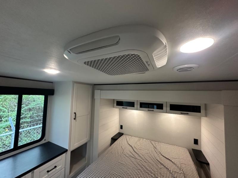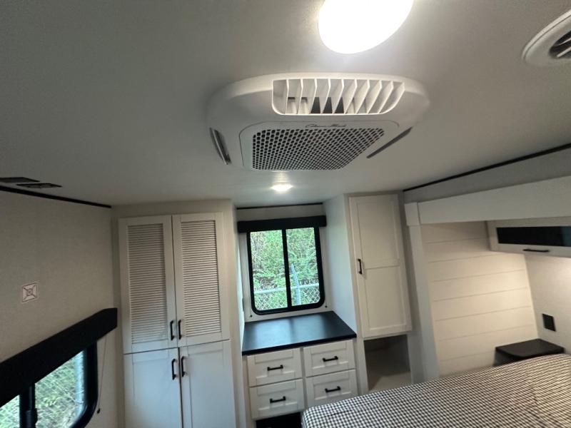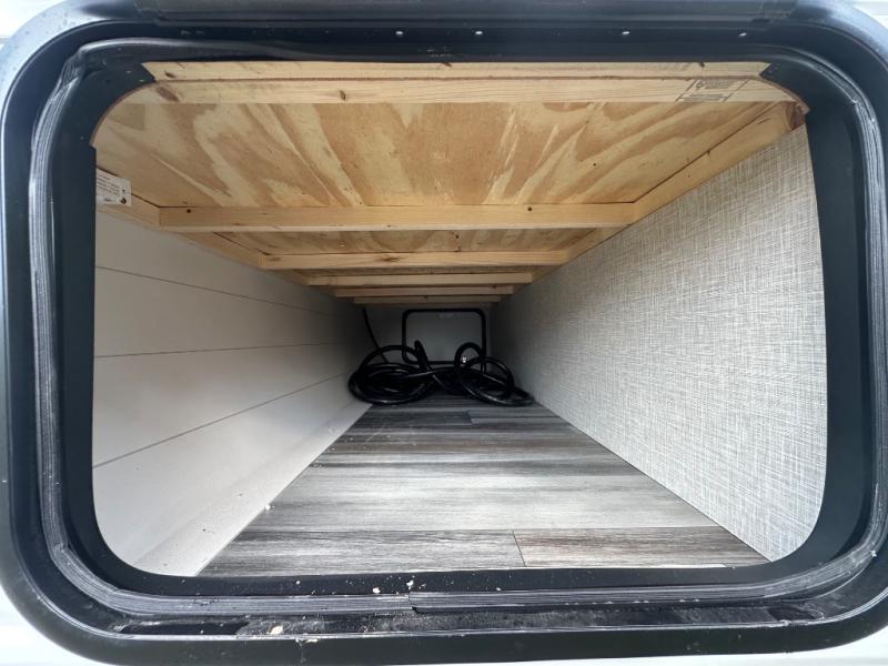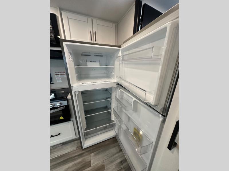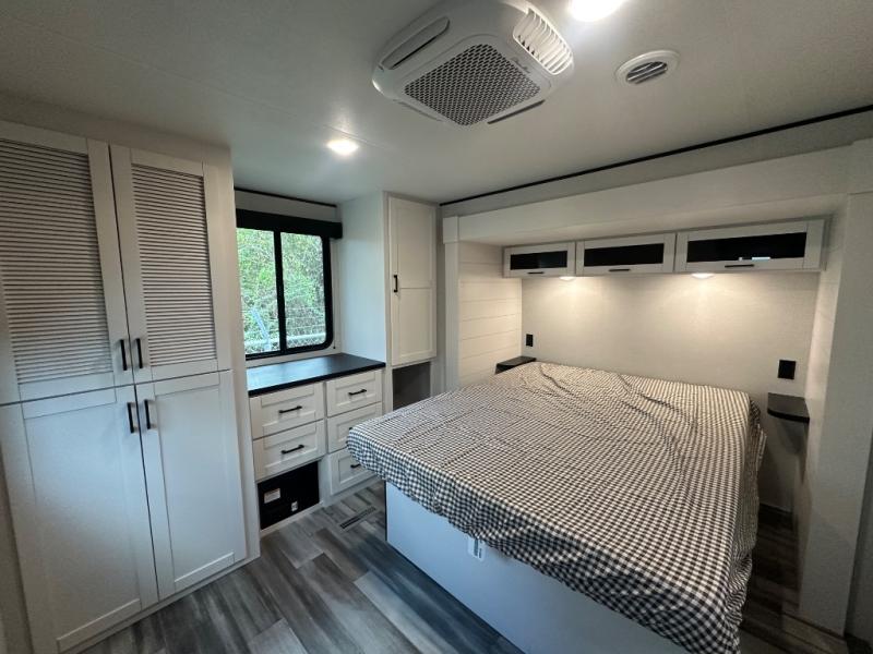 With two private bedrooms, everyone will have a comfortable place to sleep in this travel trailer! The front private bedroom has a 60" x 75" queen bed with wardrobes on either side and the rear private bedroom has a 60" x 80" queen bed slide with a dresser, a wardrobe, one of the exit/entrance doors, and an entrance into the walk-through bathroom which has a radius shower for everyone to stay squeaky clean. The patio doors not only make it easy to enter and exit the unit, but also bring in tons of natural lighting. After you have prepared a delicious home cooked meal, you can can head to the U-shaped dinette to enjoy it there comfortably then relax on the Jack-knife sofa across from the entertainment center!