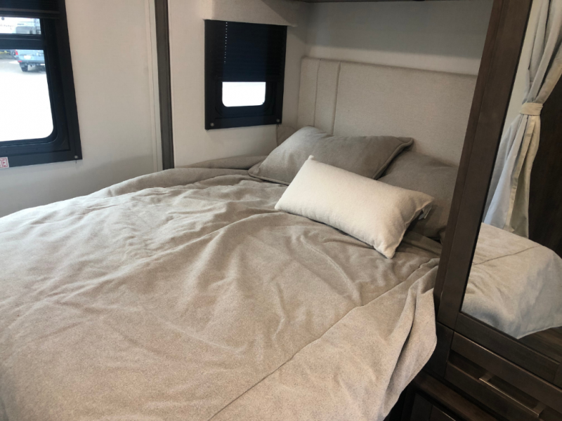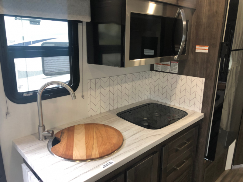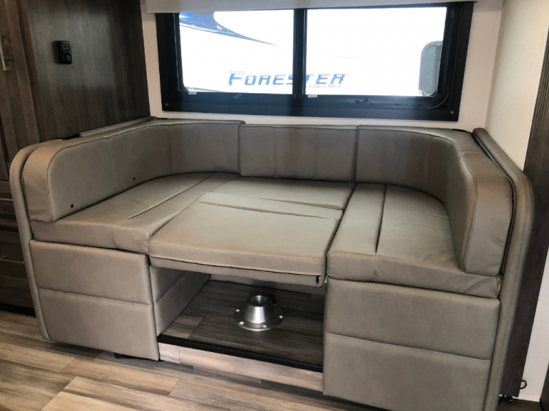 Head across the states in this comfortable coach that can sleep five each night. You will enjoy an RV queen bed just like you have at home, and your guests can sleep on the U-shaped dinette and cab-over bunk. If you're not needing the overhead bunk, just choose the optional front entertainment center with a 32" LED HDTV, and the dinette can also be optioned out for theater seating to make this a couples coach. You can prepare all your meals on the two-burner drop-in cooktop or use the convection microwave. The flip-up counter will provide more counter space, and all your perishables can be stored in the 10-cu. ft. 12V refrigerator.