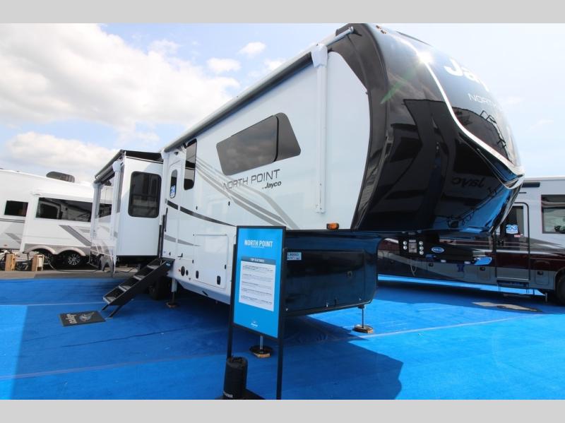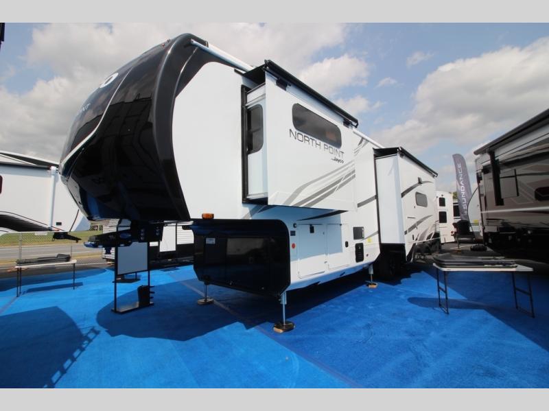 With any North Point fifth wheel by Jayco you begin with a strong foundation with a custom frame, designed and sized specifically to best support each unit. Constructed with Stronghold VBL™ aluminum framed, vacuum bond laminated walls and the Magnum Truss™ XL6™ roof system with an Alpha roof membrane system, which is the strongest tested roof in the industry. The 5-Star Handling package is included with Uniroyal tires, a MORryde rubber pin box, Dexter axles with Nev-R-Adjust brakes, MORryde CRE-3000 rubberized suspension and wet bolt fasteners and bronze bushings. The interior has handcrafted hardwood glazed doors and drawers, vinyl flooring throughout, an integrated under-mount sink in the main bathroom, plus so much more you just have to see one to believe it all!