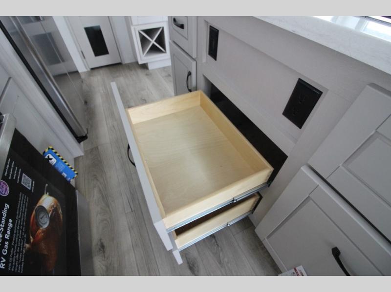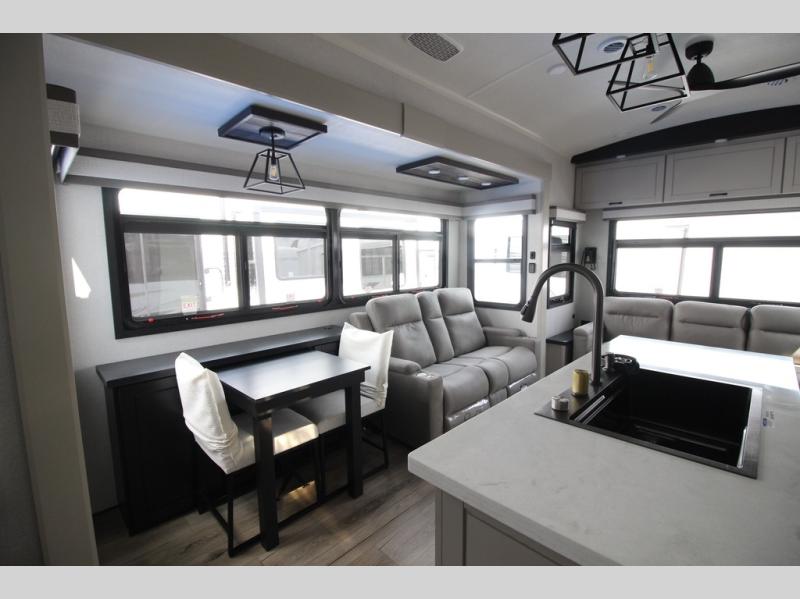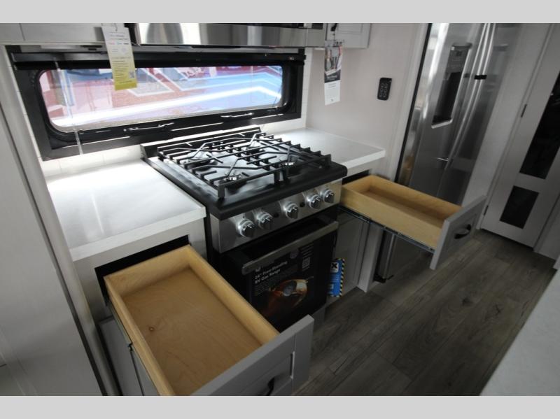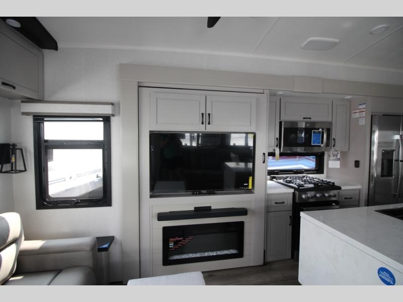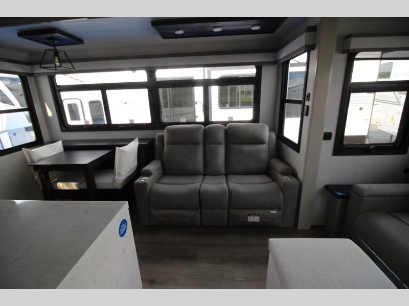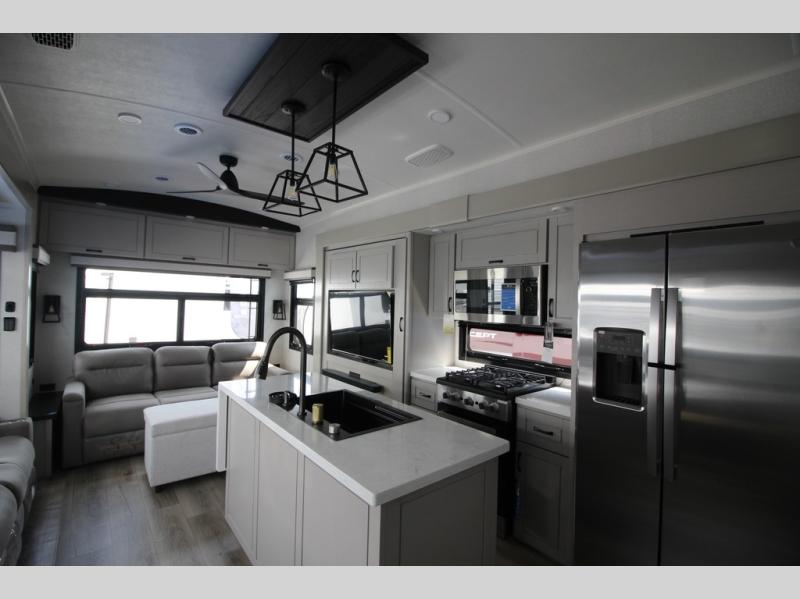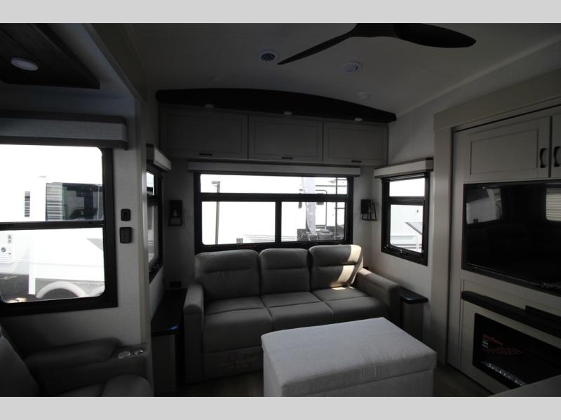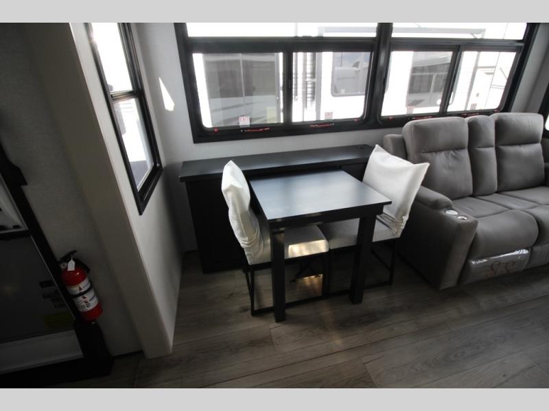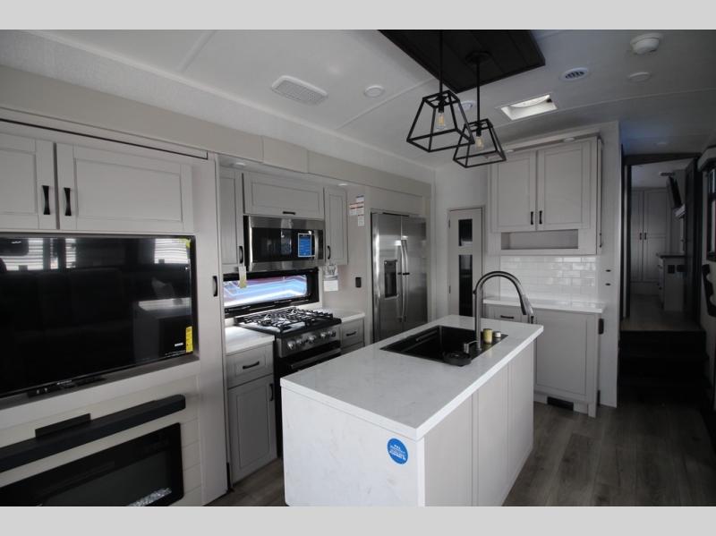 Whether you want to live in this fifth wheel or travel for long periods at a time, you will enjoy the spacious main living and kitchen area with dual slide outs as well as the bedroom with a slide out king bed. You will also find a walk-in closet with hamper and prepped space for a washer/dryer option, and a flip-top dresser with 32" TV. Easily get cleaned up in the full bathroom which also has linen storage. The cook will have a residential refrigerator to store all the cold items and beverages, a kitchen island, a pantry and a residential 24" stove. The 50" Smart LED HDTV with fully digital HDMI output and home entertainment system with subwoofer and fireplace below will provide a cozy place to watch your shows while relaxing on the theater seats, the tri-fold sofa, or the roll-top dinette table.