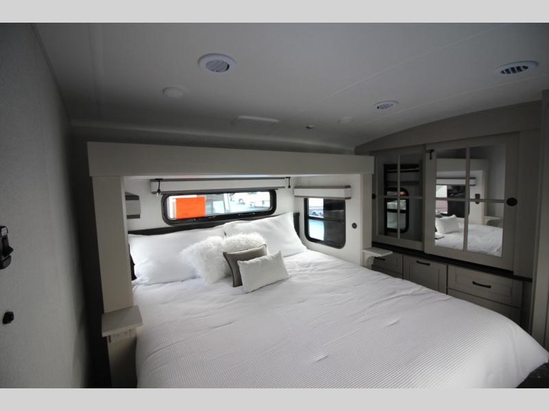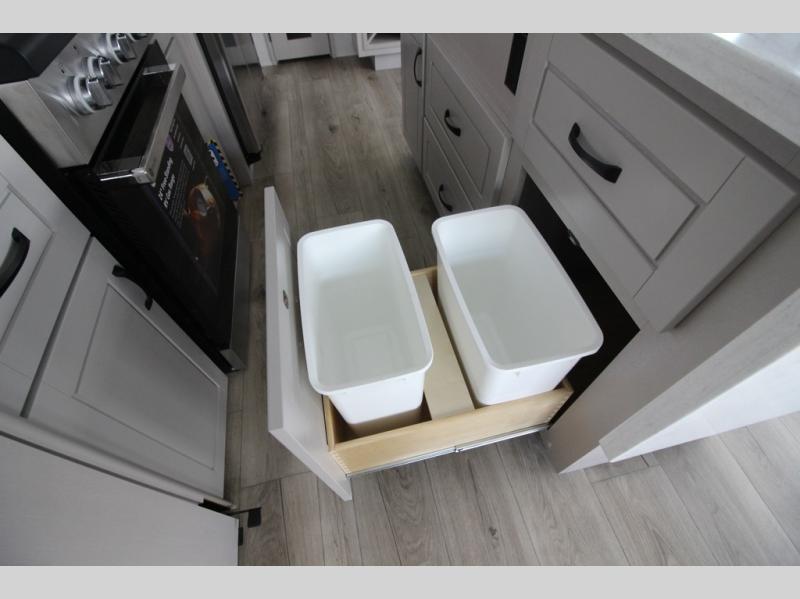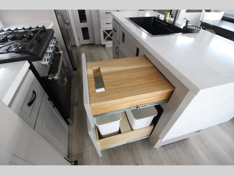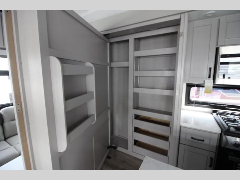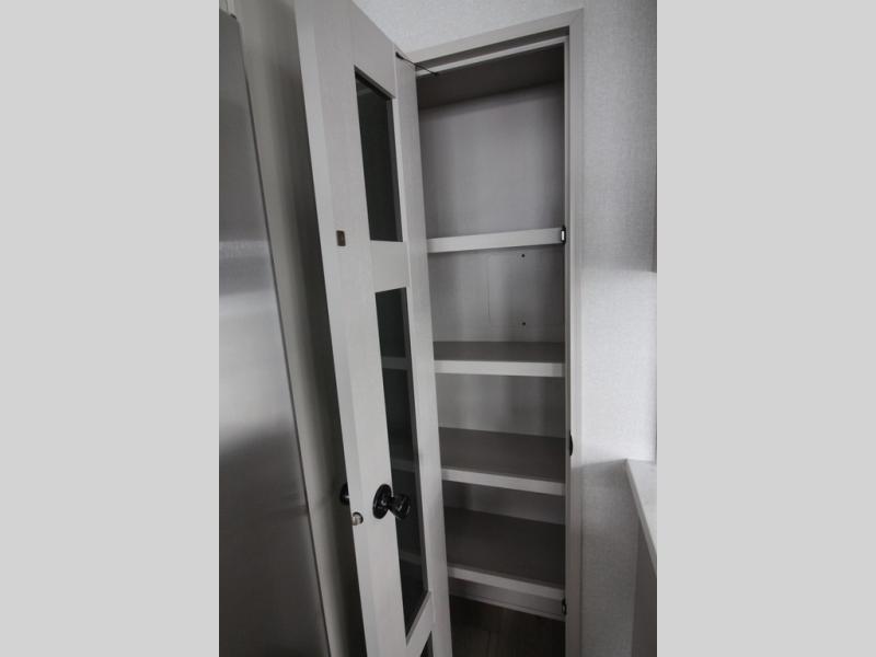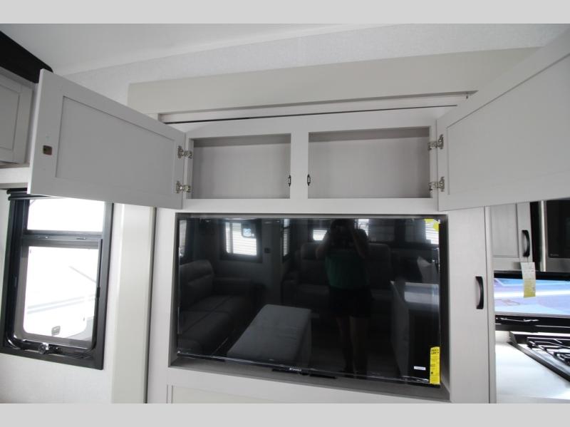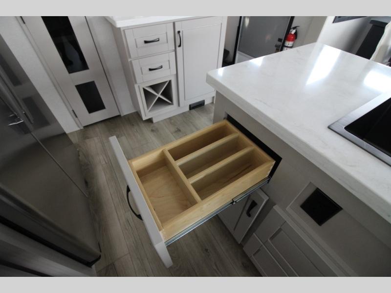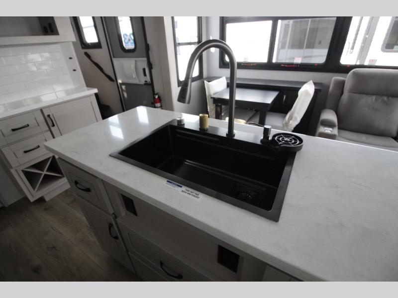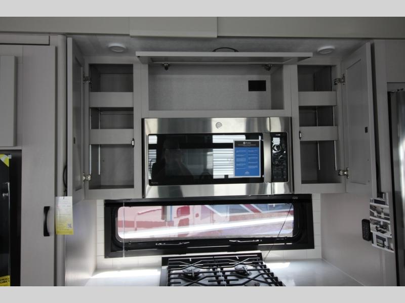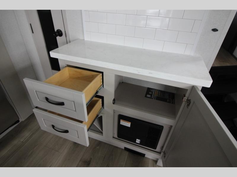 Whether you want to live in this fifth wheel or travel for long periods at a time, you will enjoy the spacious main living and kitchen area with dual slide outs as well as the bedroom with a slide out king bed. You will also find a walk-in closet with hamper and prepped space for a washer/dryer option, and a flip-top dresser with 32" TV. Easily get cleaned up in the full bathroom which also has linen storage. The cook will have a residential refrigerator to store all the cold items and beverages, a kitchen island, a pantry and a residential 24" stove. The 50" Smart LED HDTV with fully digital HDMI output and home entertainment system with subwoofer and fireplace below will provide a cozy place to watch your shows while relaxing on the theater seats, the tri-fold sofa, or the roll-top dinette table.