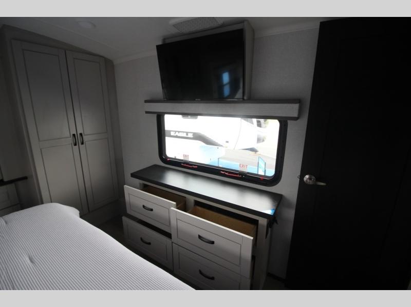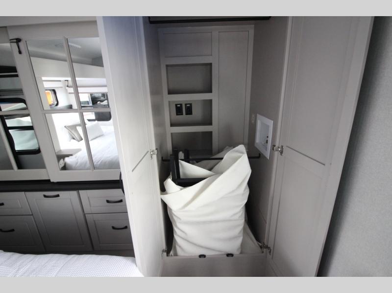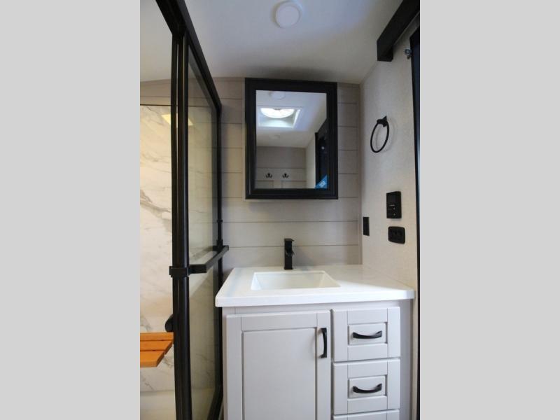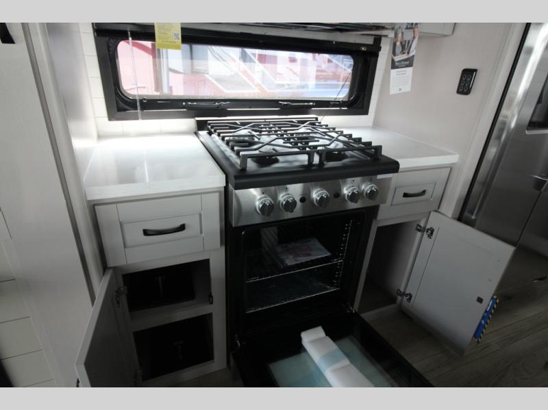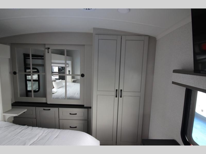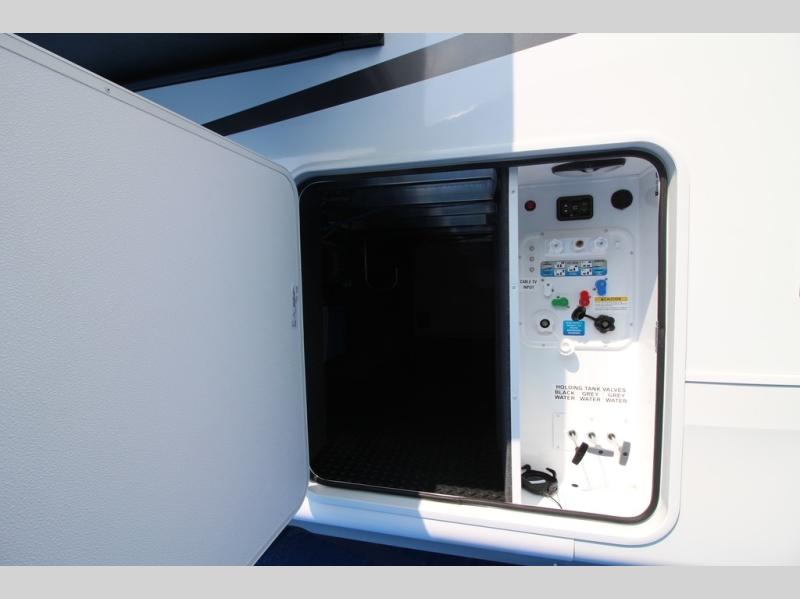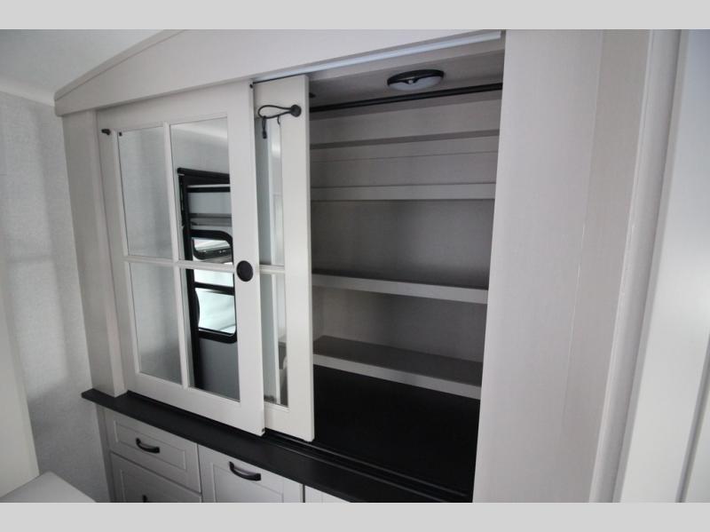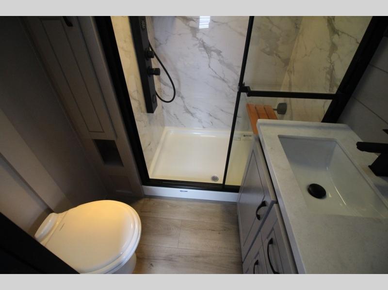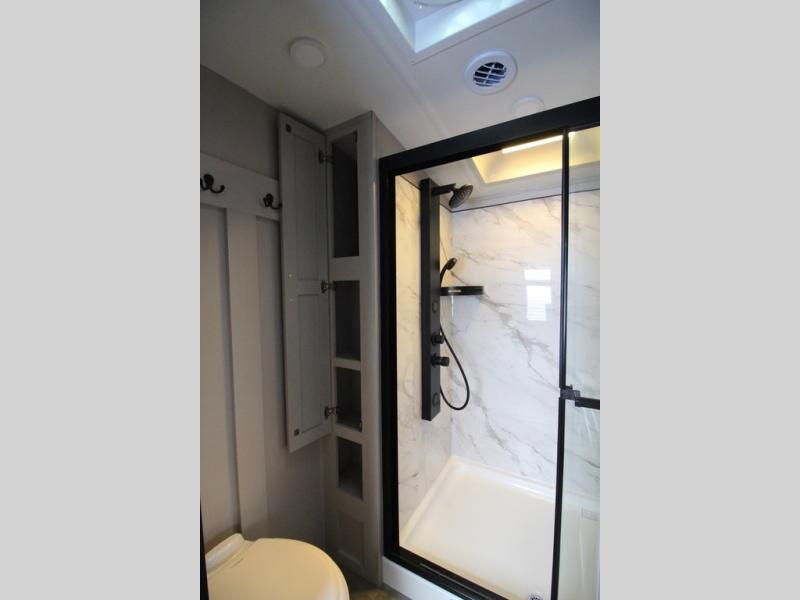Whether you want to live in this fifth wheel or travel for long periods at a time, you will enjoy the spacious main living and kitchen area with dual slide outs as well as the bedroom with a slide out king bed. You will also find a walk-in closet with hamper and prepped space for a washer/dryer option, and a flip-top dresser with 32" TV. Easily get cleaned up in the full bathroom which also has linen storage. The cook will have a residential refrigerator to store all the cold items and beverages, a kitchen island, a pantry and a residential 24" stove. The 50" Smart LED HDTV with fully digital HDMI output and home entertainment system with subwoofer and fireplace below will provide a cozy place to watch your shows while relaxing on the theater seats, the tri-fold sofa, or the roll-top dinette table.