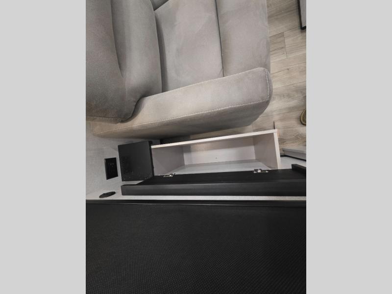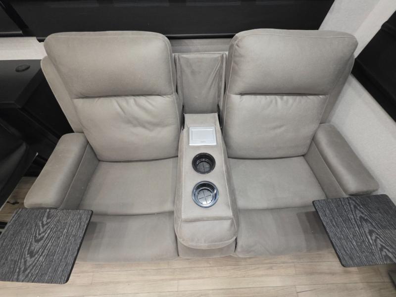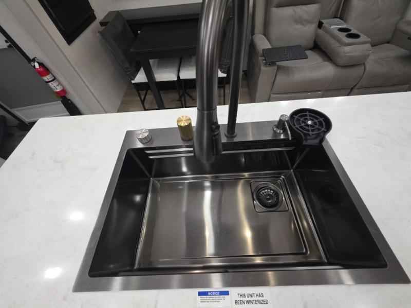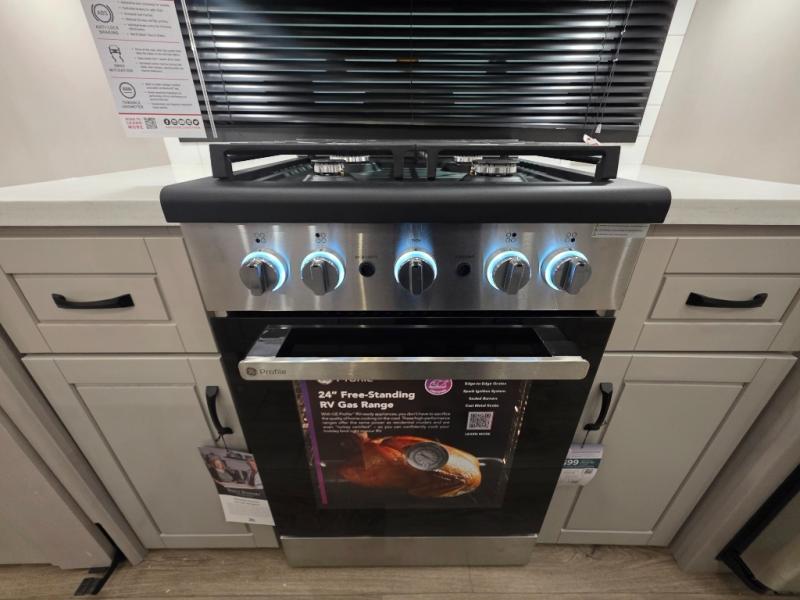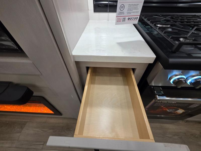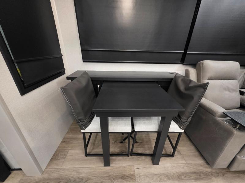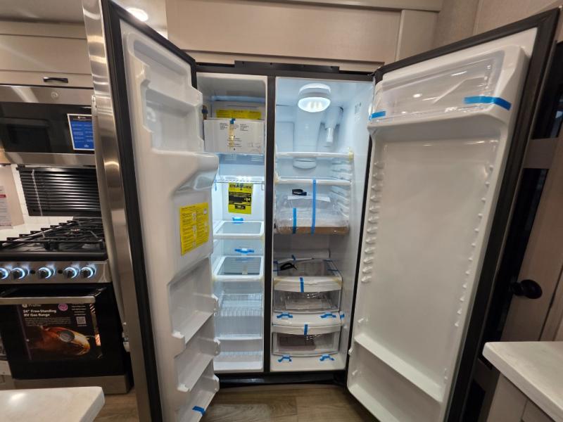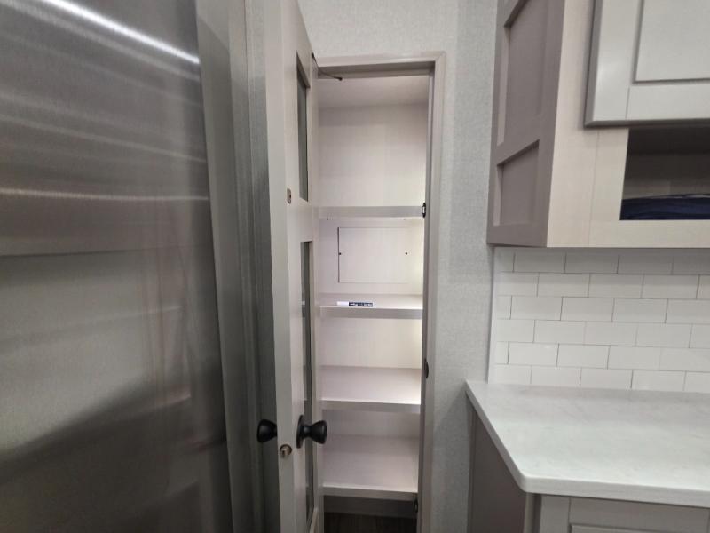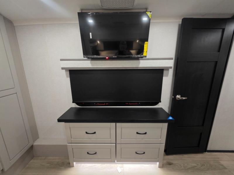 Whether you want to live in this fifth wheel or travel for long periods at a time, you will enjoy the spacious main living and kitchen area with dual slide outs as well as the bedroom with a slide out king bed. You will also find drawers with hamper and prepped space for a washer/dryer option, and a flip-top dresser with 32" TV. Easily get cleaned up in the full bathroom which also has linen storage. The cook will have a residential refrigerator to store all the cold items and beverages, a kitchen island, a pantry and a residential 24" stove. The 4K Smart LED HDTV with fully digital HDMI output and home entertainment system with subwoofer and fireplace below will provide a cozy place to watch your shows while relaxing on the theater seats, the tri-fold sofa, or the roll-top dinette table.