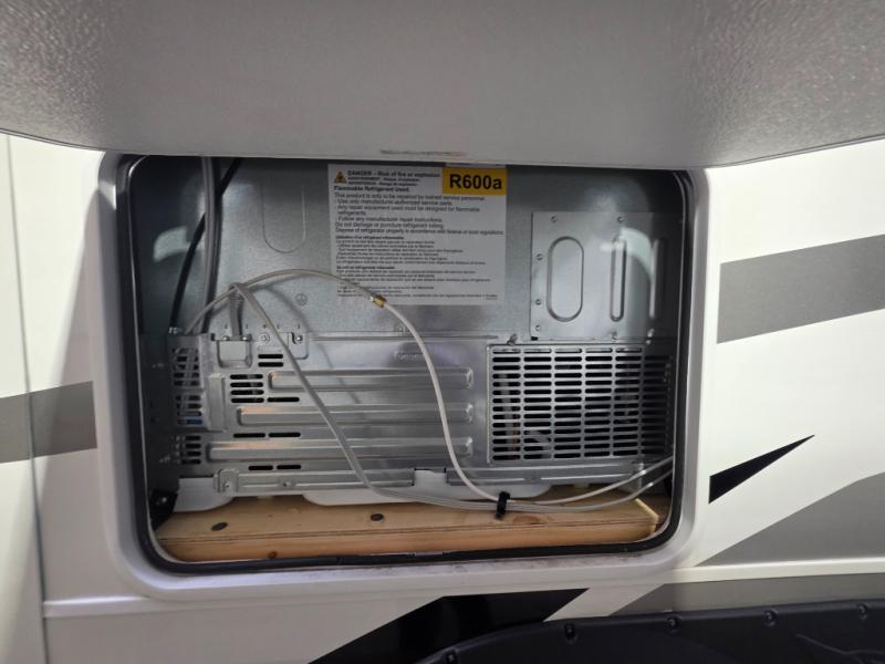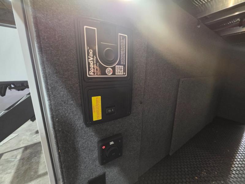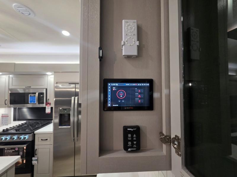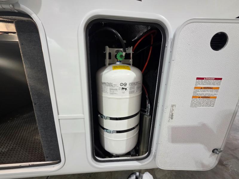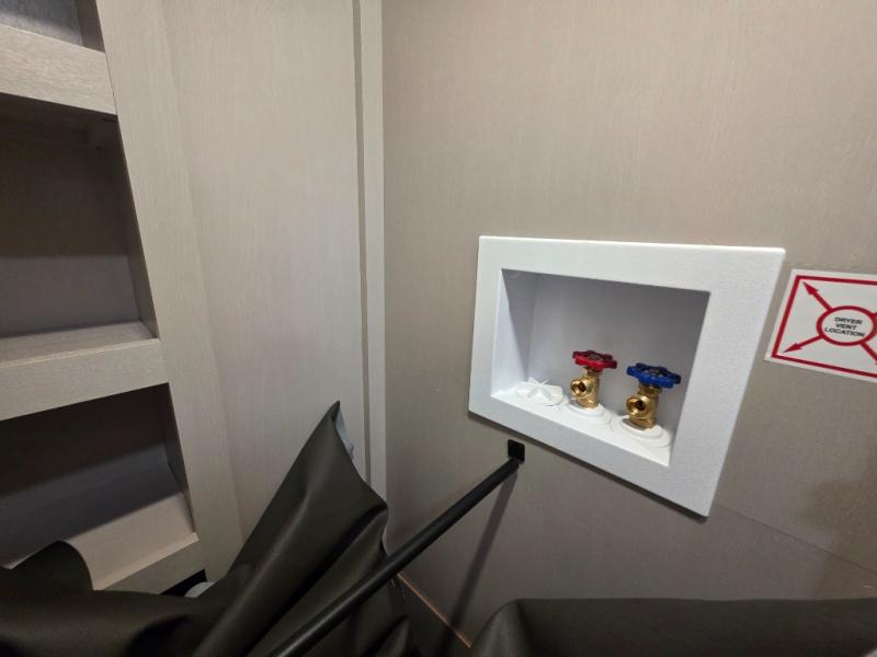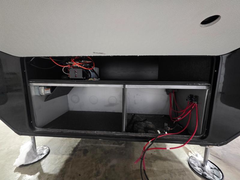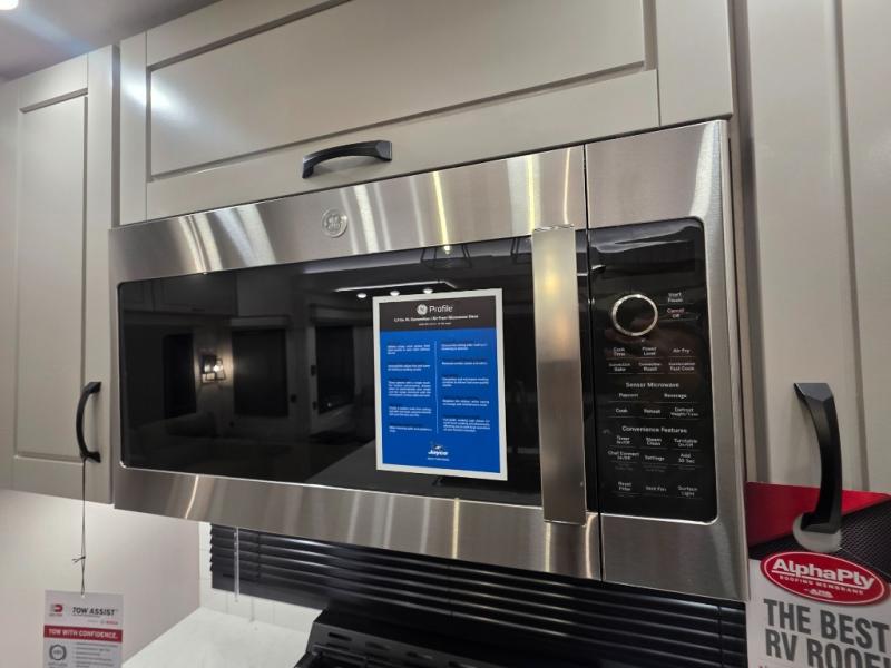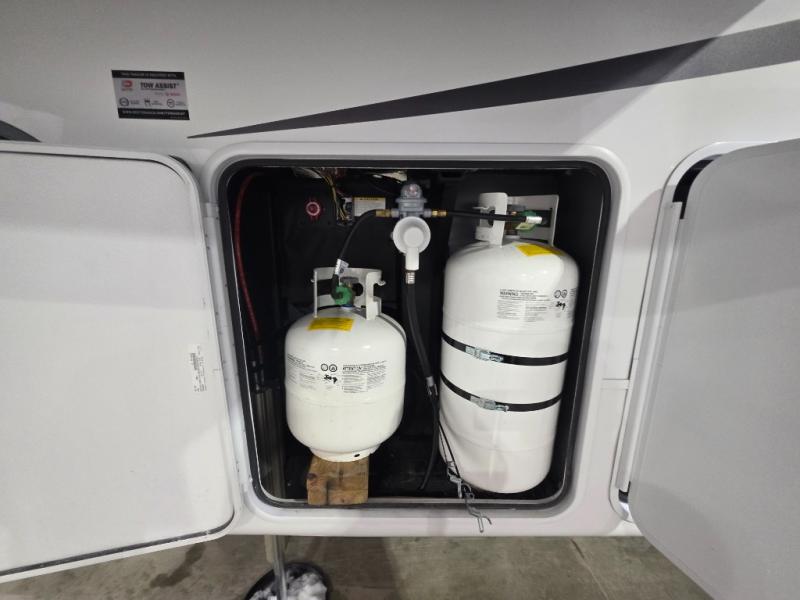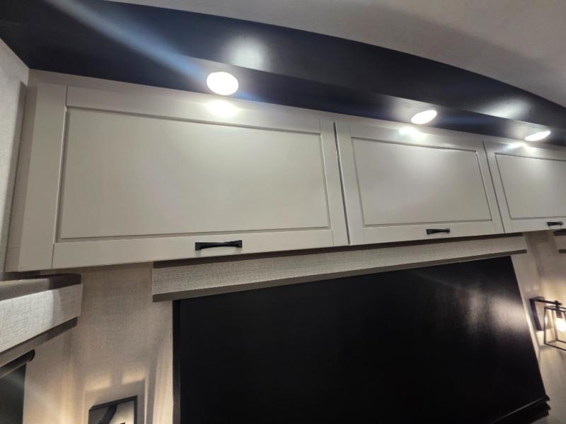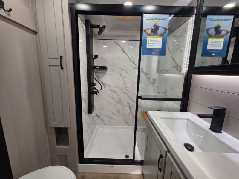 Whether you want to live in this fifth wheel or travel for long periods at a time, you will enjoy the spacious main living and kitchen area with dual slide outs as well as the bedroom with a slide out king bed. You will also find drawers with hamper and prepped space for a washer/dryer option, and a flip-top dresser with 32" TV. Easily get cleaned up in the full bathroom which also has linen storage. The cook will have a residential refrigerator to store all the cold items and beverages, a kitchen island, a pantry and a residential 24" stove. The 4K Smart LED HDTV with fully digital HDMI output and home entertainment system with subwoofer and fireplace below will provide a cozy place to watch your shows while relaxing on the theater seats, the tri-fold sofa, or the roll-top dinette table.