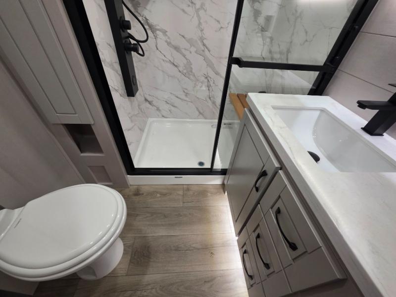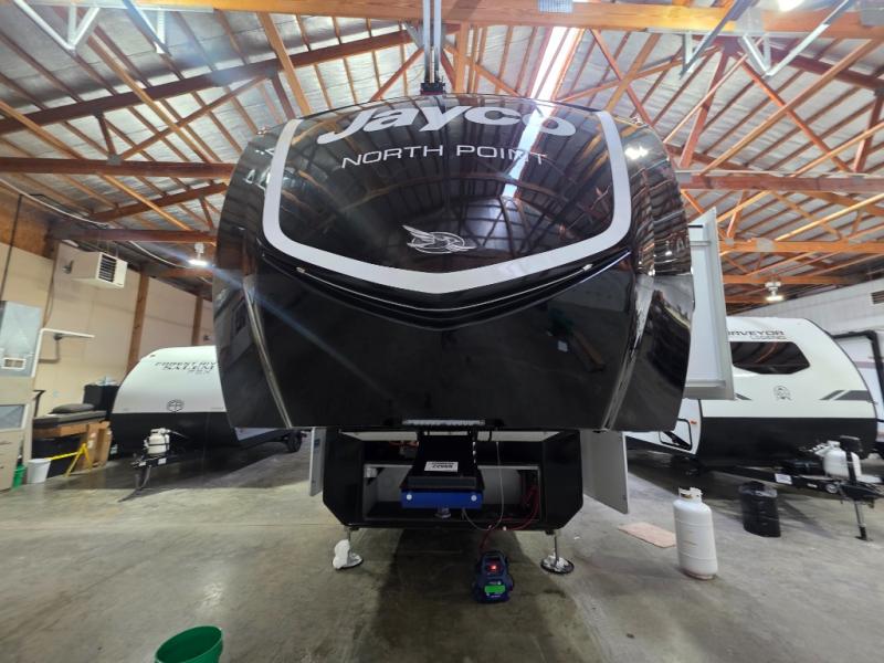 With any North Point fifth wheel by Jayco you begin with a strong foundation with a custom frame, designed and sized specifically to best support each unit. Constructed with Stronghold VBL™ aluminum framed, vacuum bond laminated walls and the Magnum Truss™ XL6™ roof system with an Alpha roof membrane system, which is the strongest tested roof in the industry. The 5-Star Handling package is included with H-rated tires with TPMS, a MORryde rubber pin box, Dexter axles with Nev-R-Adjust brakes, MORryde CRE-3000 rubberized suspension and wet bolt fasteners and bronze bushings. The interior has handcrafted hardwood glazed doors and drawers, vinyl flooring throughout, an integrated under-mount sink in the main bathroom, plus so much more you just have to see one to believe it all!