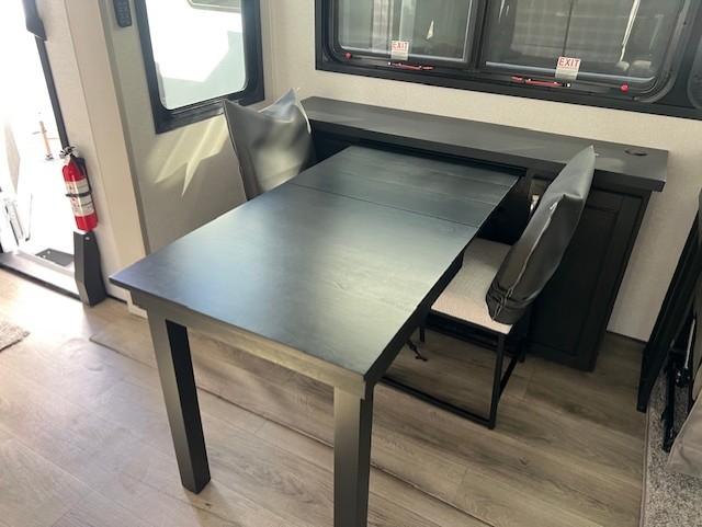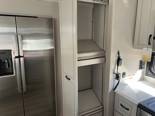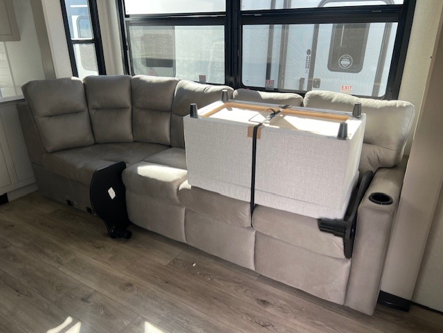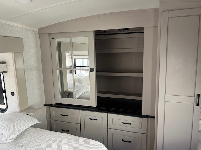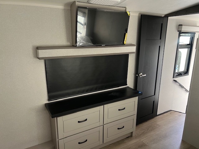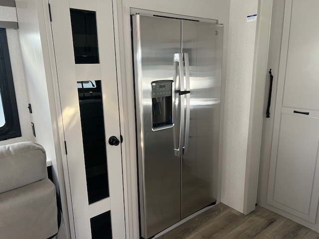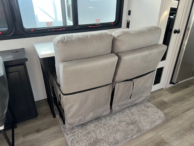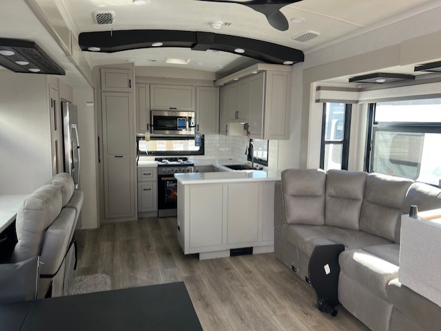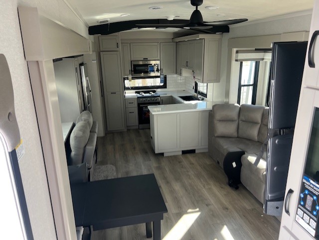 You can't go wrong when camping in this triple slide out fifth wheel! Once you've arrived at your destination and unloaded the pass-through storage, you can make lunch in the rear kitchen with generous counter space. There are also two pantries, one being a pull-out, plus a convenient pull-out butcher block so you can chop fresh veggies! You can enjoy your meal at the roll-top dinette with chairs, and if you need to get some work done, the desk/coffee bar will provide a space for your laptop. An L-shaped sofa and theater seat in the main living area will create an inviting space, plus there is a 65" TV and a mantle with a fireplace just like at home! Freshen up in the full bath at the end of the day, then head to the front private bedroom for a great night's rest on the king bed slide out. There is a closet with drawers and a hamper below, a chest with a TV, plus washer and dryer prep for the option to add these appliances; how convenient!