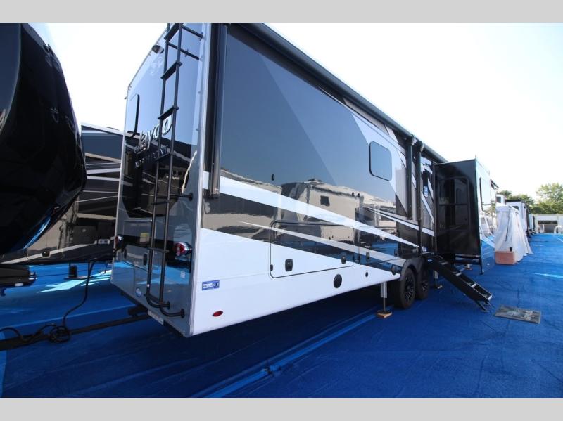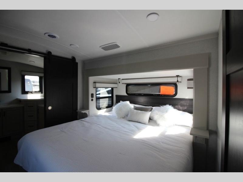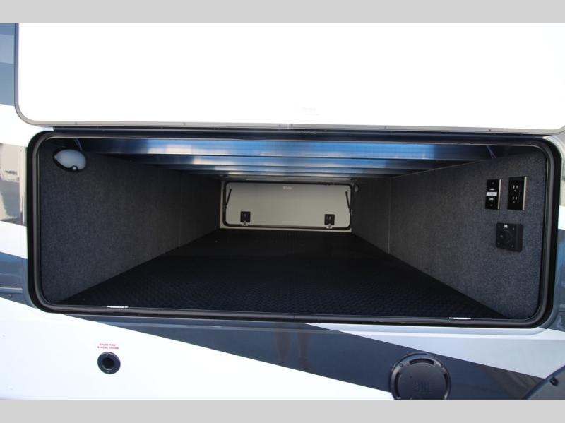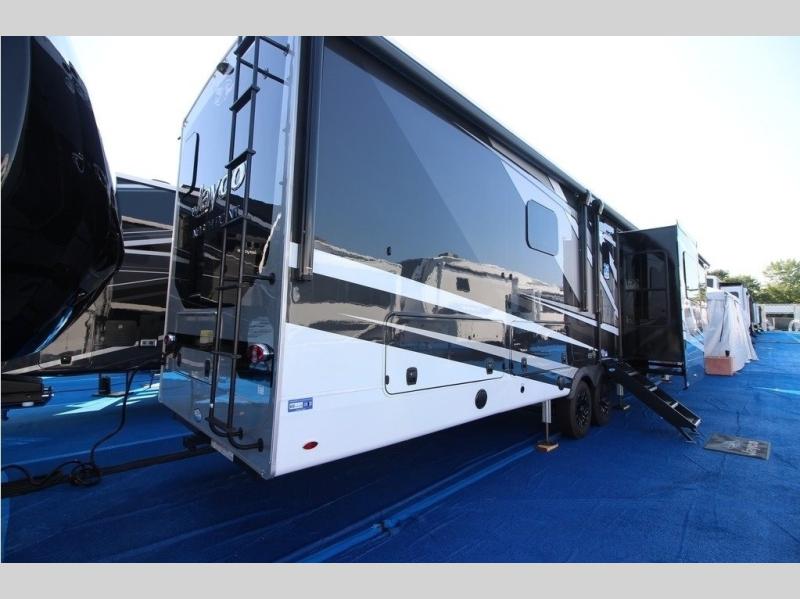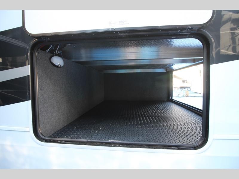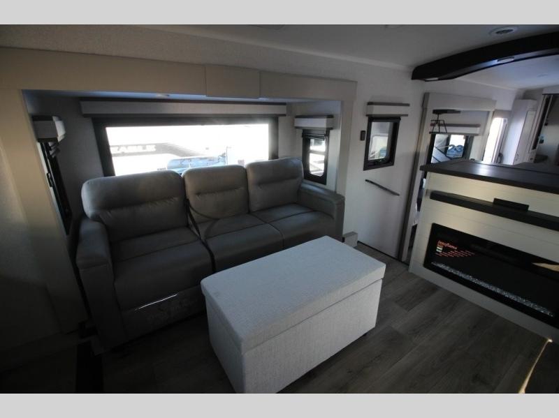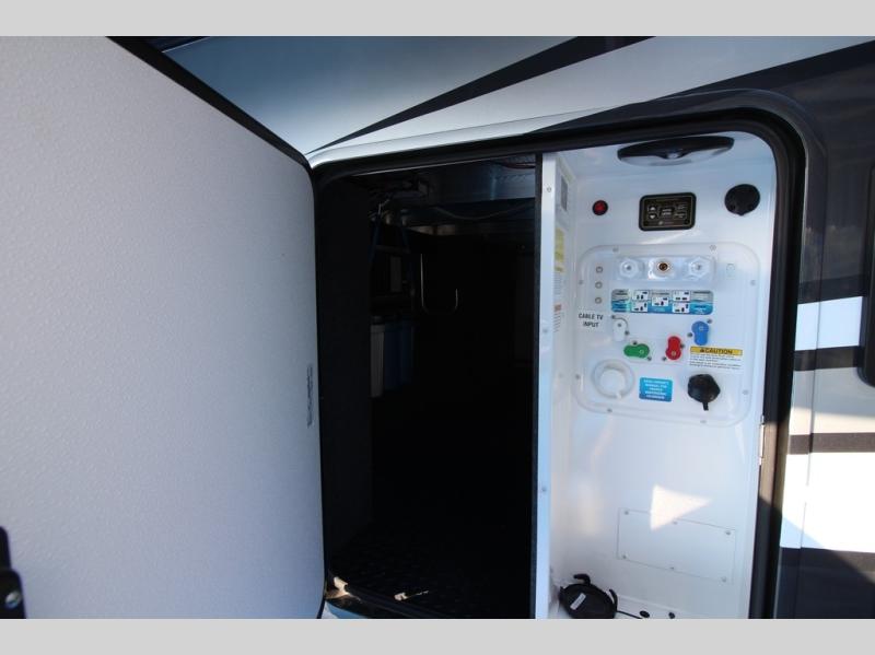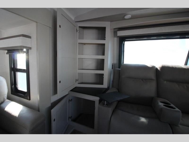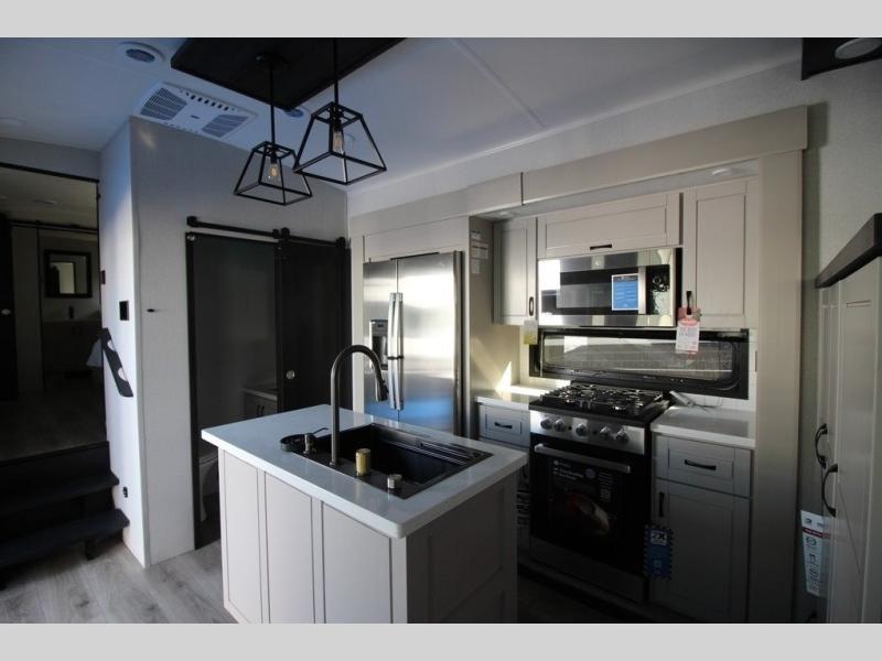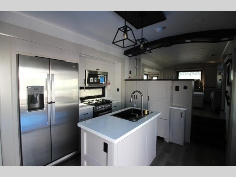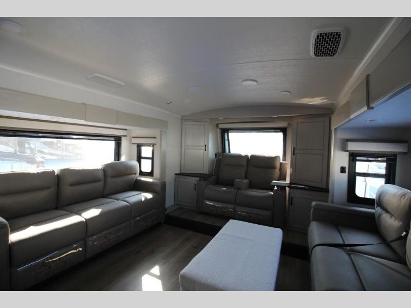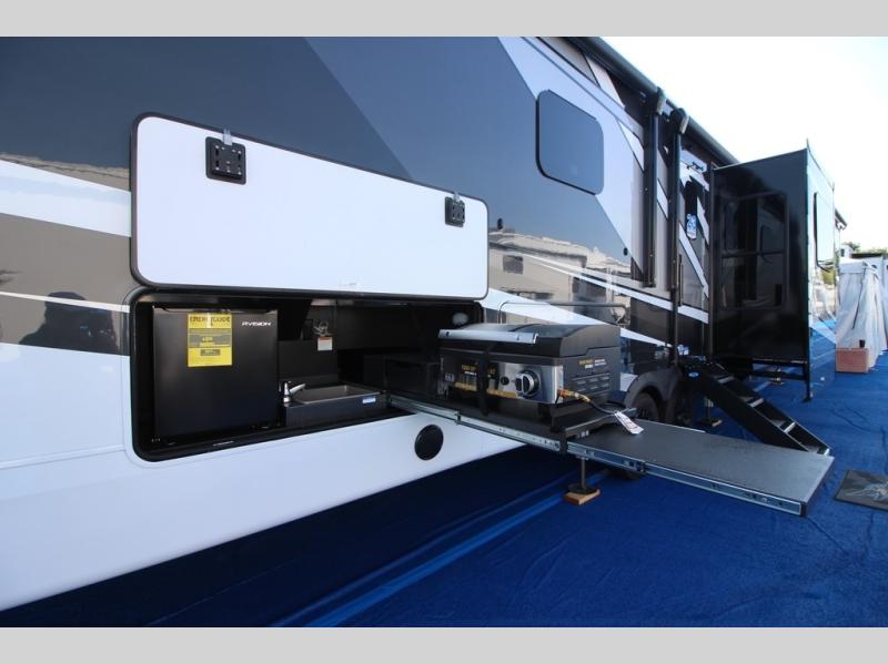 Entertainment can be found throughout this fifth wheel from the front living area with a 50" Smart LED HDTV with fully digital HDMI output and home entertainment system with subwoofer including a fireplace below that you can enjoy while relaxing on theater seats and two tri-fold sofas, a 32" TV in the middle kitchen and there is a bedroom 32" TV. You might even like to add the tailgate TV option along the exterior. Back inside the kitchen, the cook will love the center island, the pantry, the residential refrigerator, and the roll-top dinette. The half bath is a few steps away as an added convenience. The master bedroom includes a king bed slide, a bench, two wardrobes and a sliding door into the bathroom which offers two sinks, a space prepped for a washer/dryer option, and a walk-in shower. And don't forget about the exterior features such as the outside kitchen for more choices when making meals, the storage for your outdoor gear and chairs, and two awnings with integrated LED lighting.