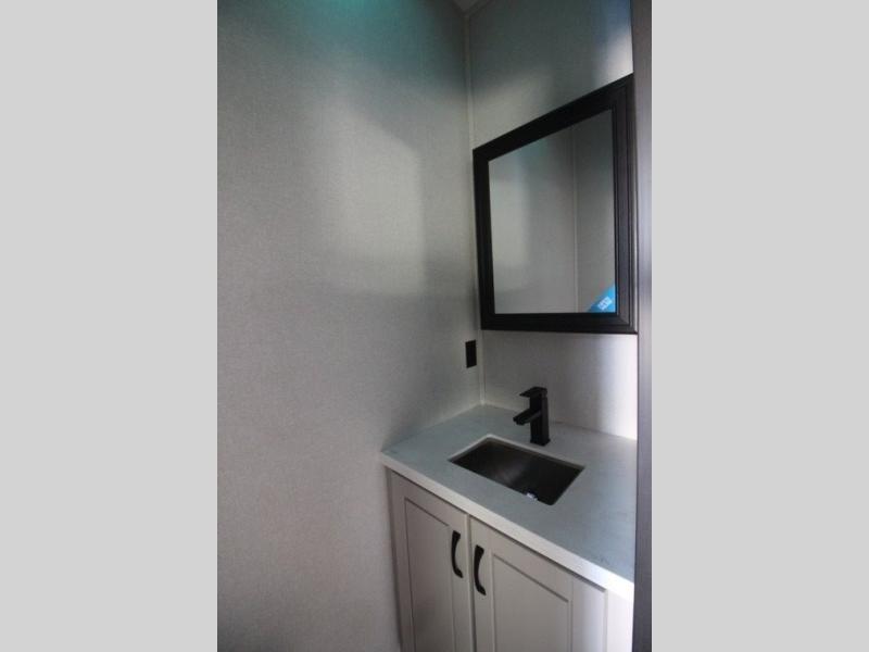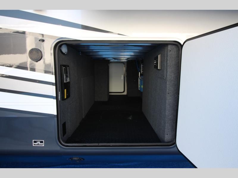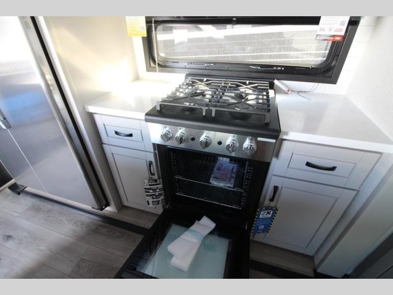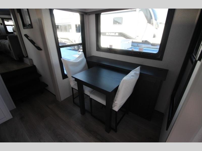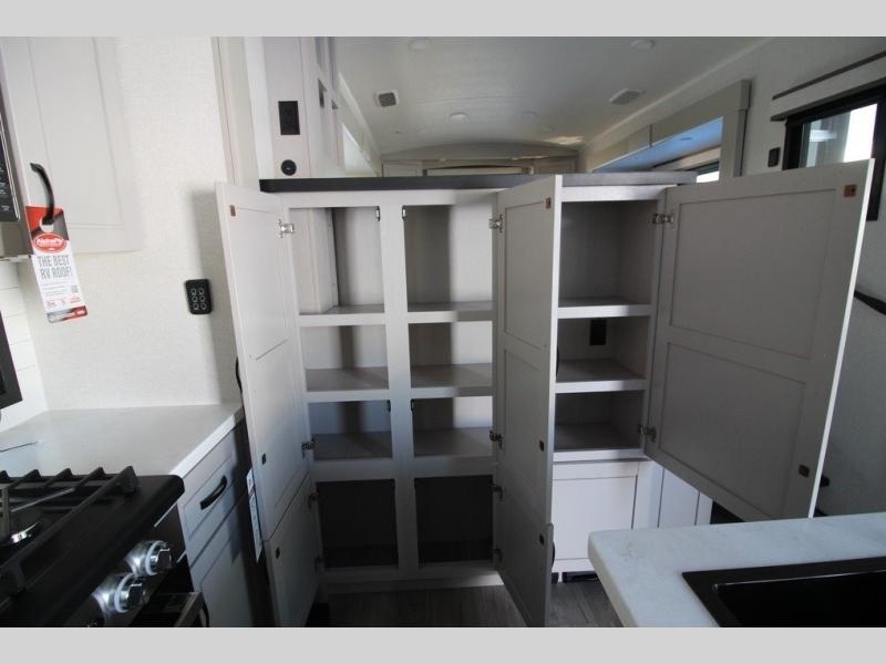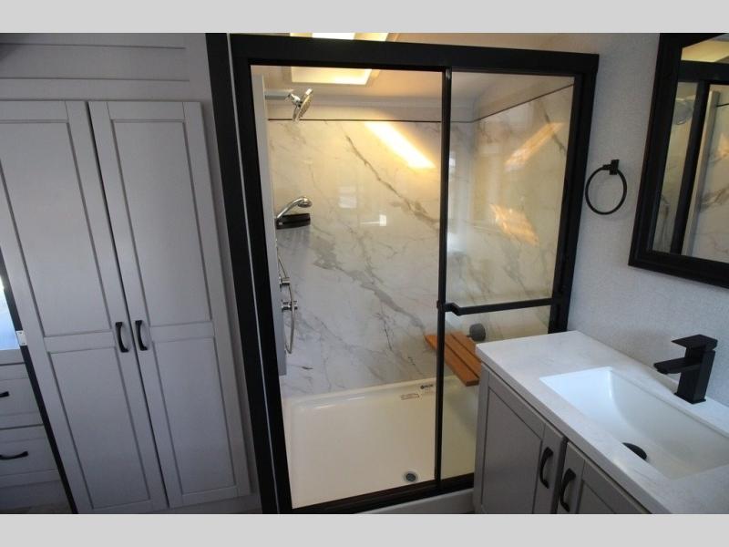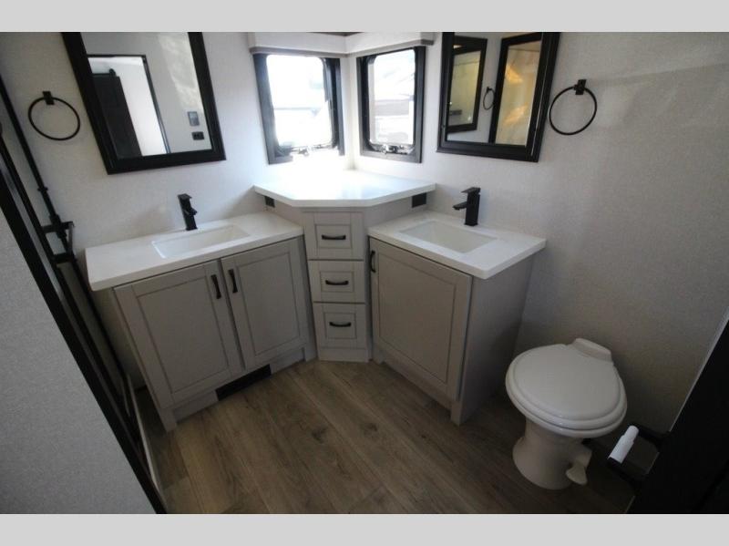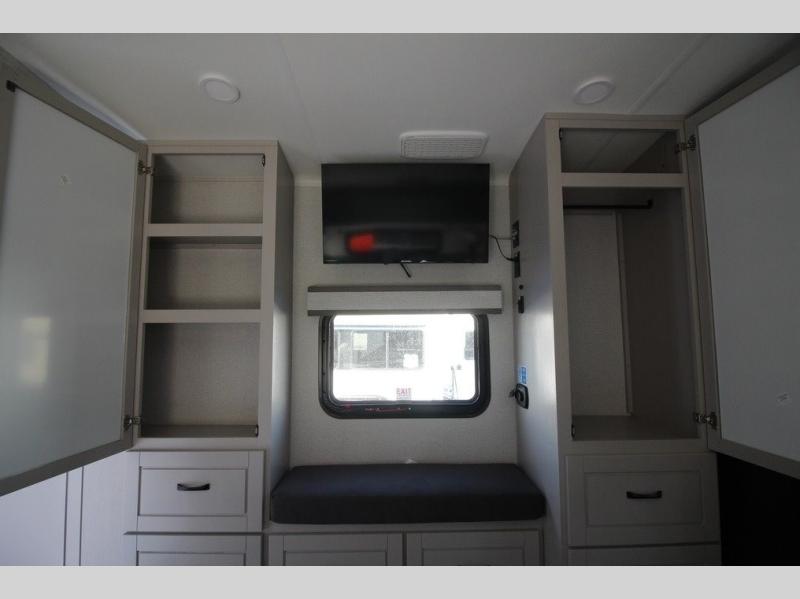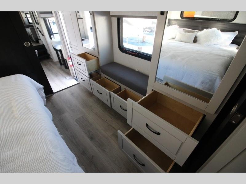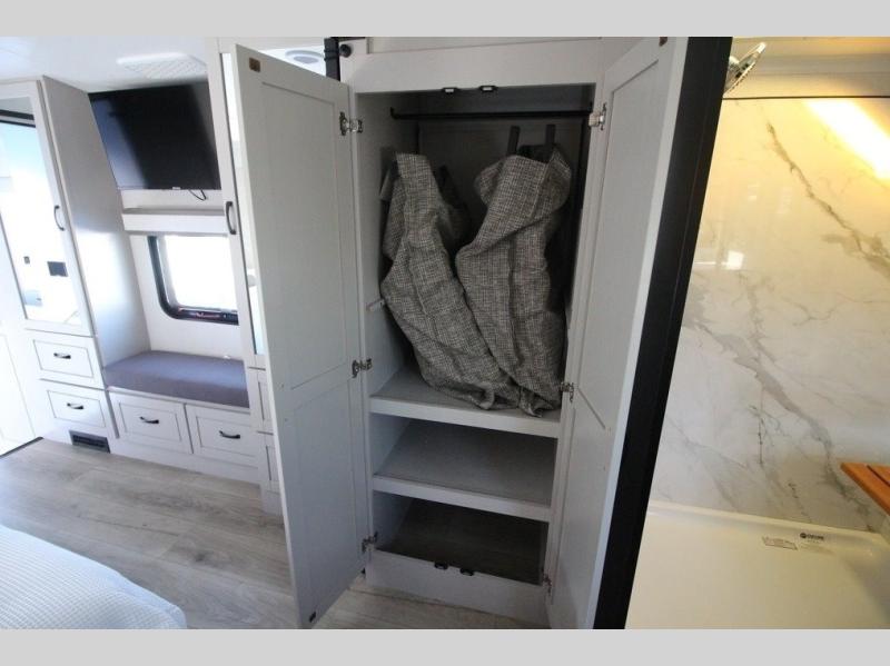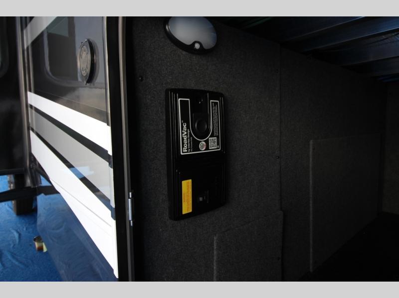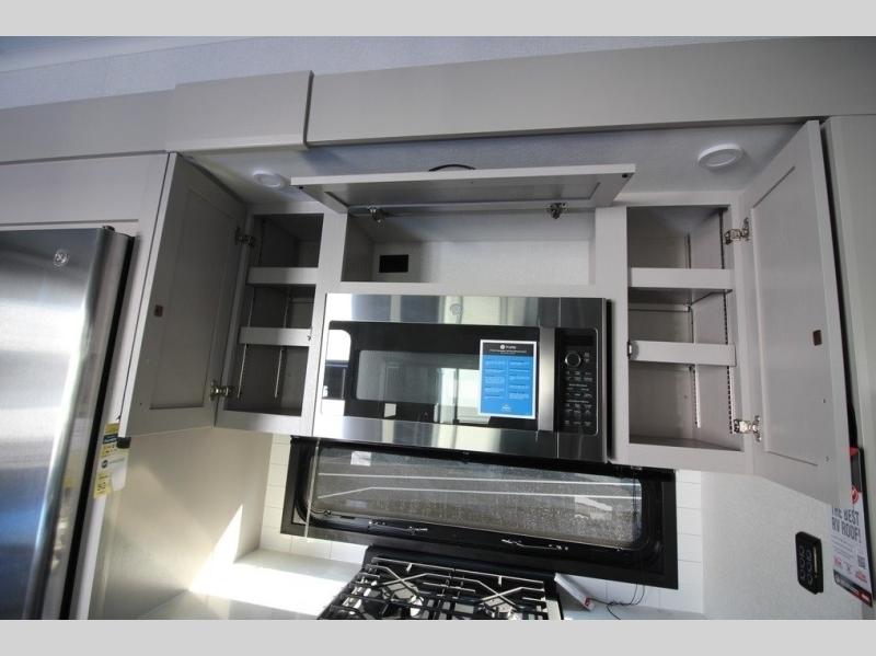 Entertainment can be found throughout this fifth wheel from the front living area with a 50" Smart LED HDTV with fully digital HDMI output and home entertainment system with subwoofer including a fireplace below that you can enjoy while relaxing on theater seats and two tri-fold sofas, a 32" TV in the middle kitchen and there is a bedroom 32" TV. You might even like to add the tailgate TV option along the exterior. Back inside the kitchen, the cook will love the center island, the pantry, the residential refrigerator, and the roll-top dinette. The half bath is a few steps away as an added convenience. The master bedroom includes a king bed slide, a bench, two wardrobes and a sliding door into the bathroom which offers two sinks, a space prepped for a washer/dryer option, and a walk-in shower. And don't forget about the exterior features such as the outside kitchen for more choices when making meals, the storage for your outdoor gear and chairs, and two awnings with integrated LED lighting.