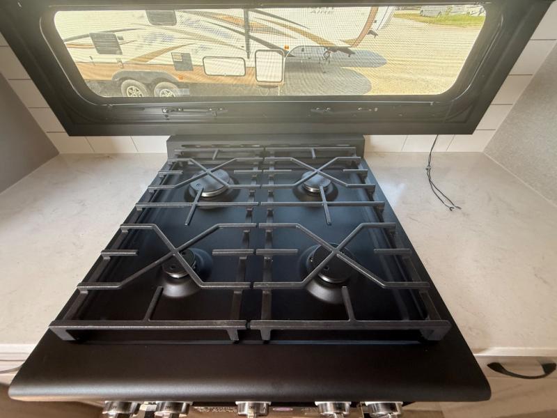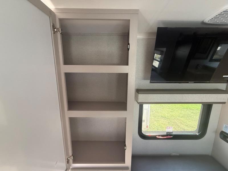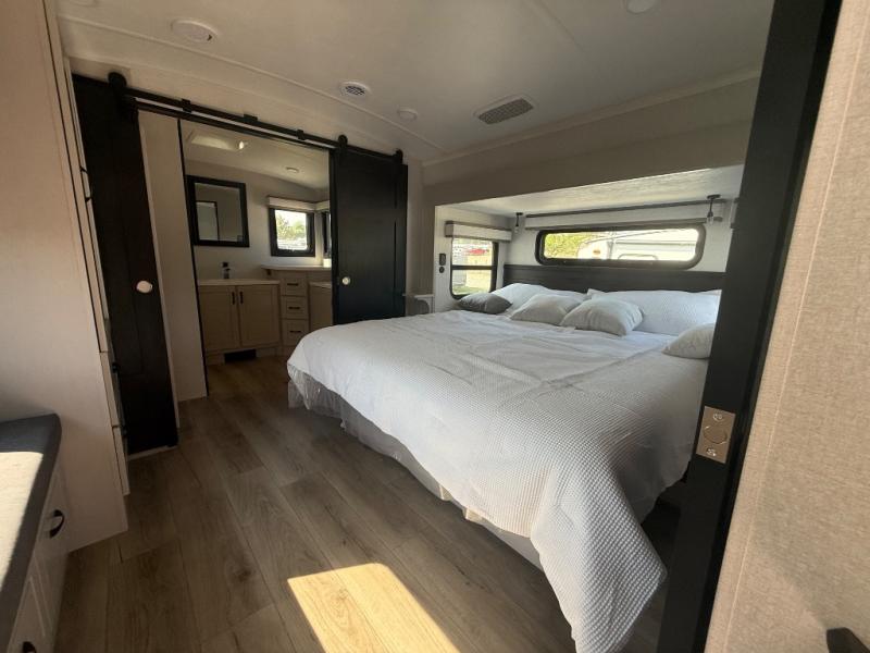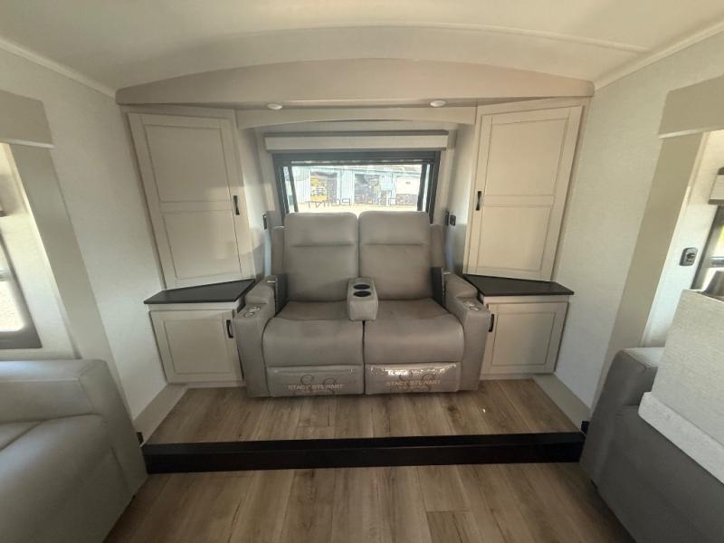 Entertainment can be found throughout this fifth wheel from the front living area with a 50" Smart LED HDTV with fully digital HDMI output and home entertainment system with subwoofer including a fireplace below that you can enjoy while relaxing on theater seats and two tri-fold sofas, a 32" TV in the middle kitchen and there is a bedroom 32" TV. You might even like to add the tailgate TV option along the exterior. Back inside the kitchen, the cook will love the center island, the pantry, the residential refrigerator, and the roll-top dinette. The half bath is a few steps away as an added convenience. The master bedroom includes a king bed slide, a bench, two wardrobes and a sliding door into the bathroom which offers two sinks, a space prepped for a washer/dryer option, and a walk-in shower. And don't forget about the exterior features such as the outside kitchen for more choices when making meals, the storage for your outdoor gear and chairs, and two awnings with integrated LED lighting.