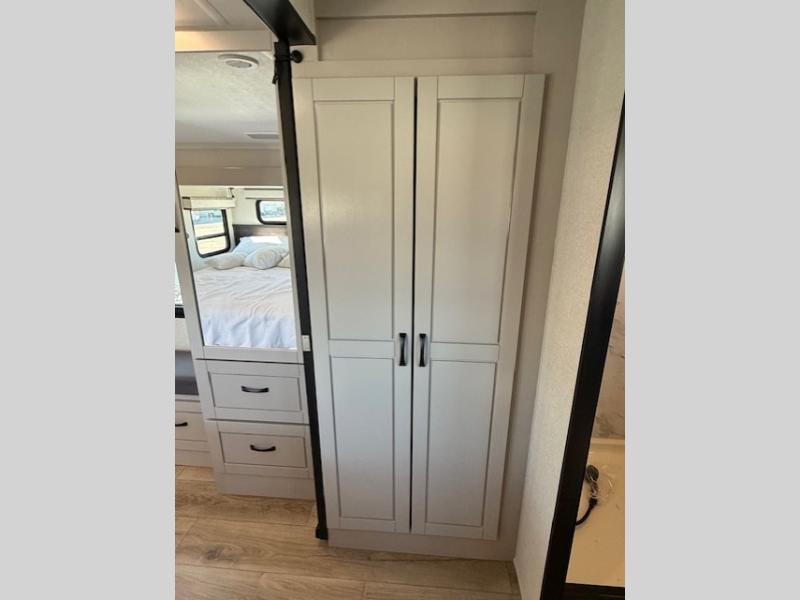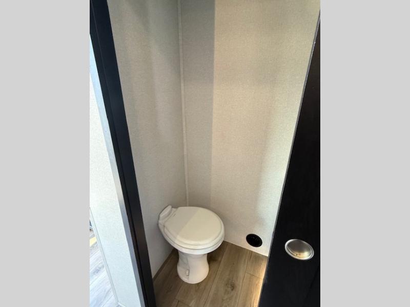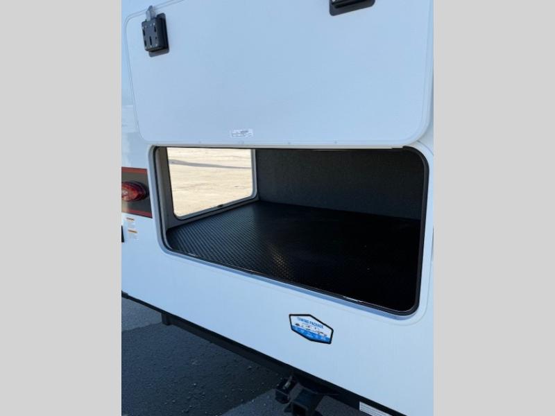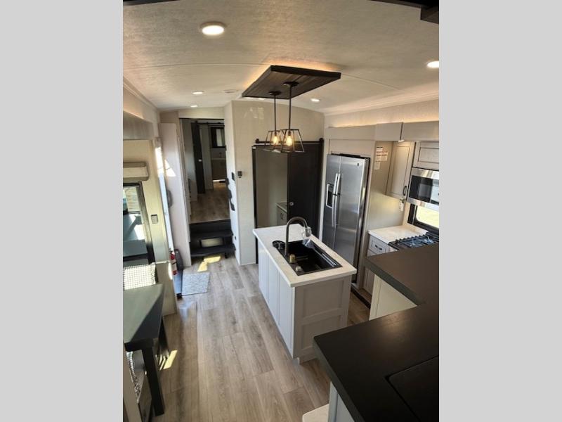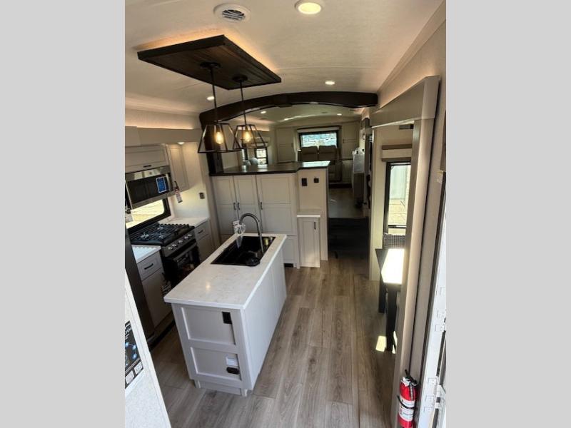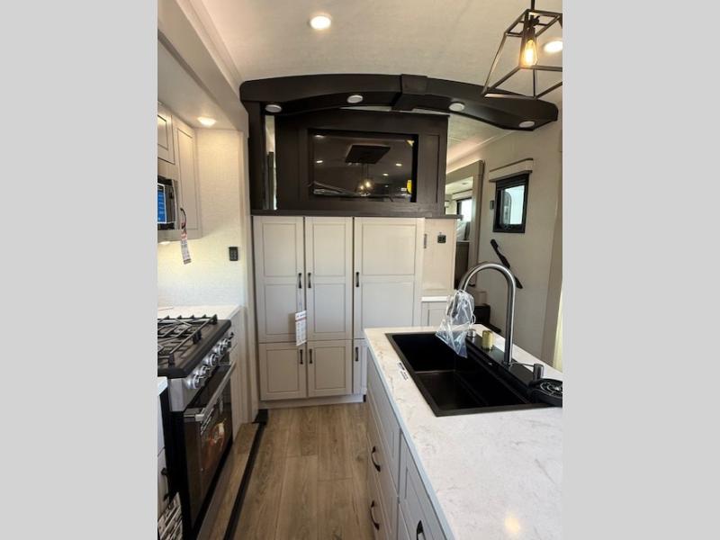 Entertainment can be found throughout this fifth wheel from the front living area with a 50" Smart LED HDTV with fully digital HDMI output and home entertainment system with subwoofer including a fireplace below that you can enjoy while relaxing on theater seats and two tri-fold sofas, a 32" TV in the middle kitchen and there is a bedroom 32" TV. You might even like to add the tailgate TV option along the exterior. Back inside the kitchen, the cook will love the center island, the pantry, the residential refrigerator, and the roll-top dinette. The half bath is a few steps away as an added convenience. The master bedroom includes a king bed slide, a bench, two wardrobes and a sliding door into the bathroom which offers two sinks, a space prepped for a washer/dryer option, and a walk-in shower. And don't forget about the exterior features such as the outside kitchen for more choices when making meals, the storage for your outdoor gear and chairs, and two awnings with integrated LED lighting.