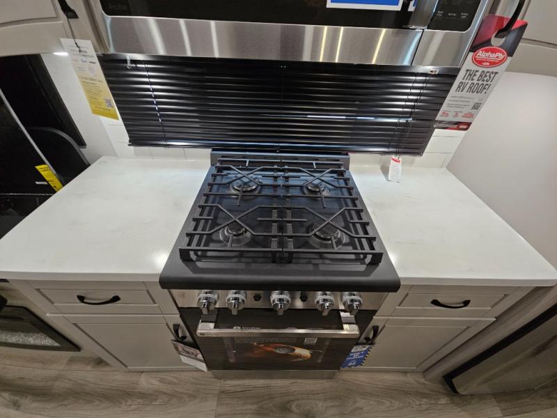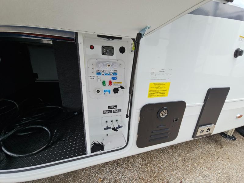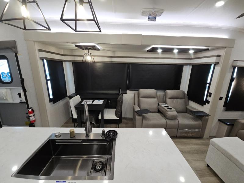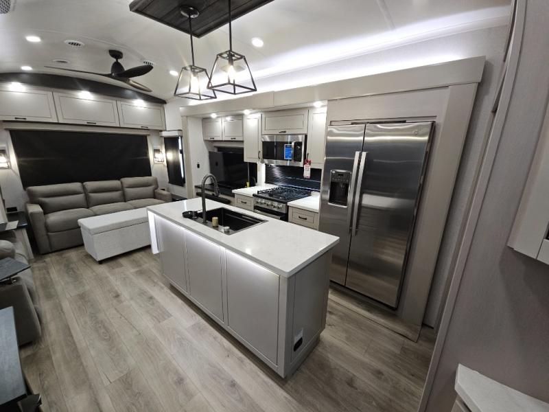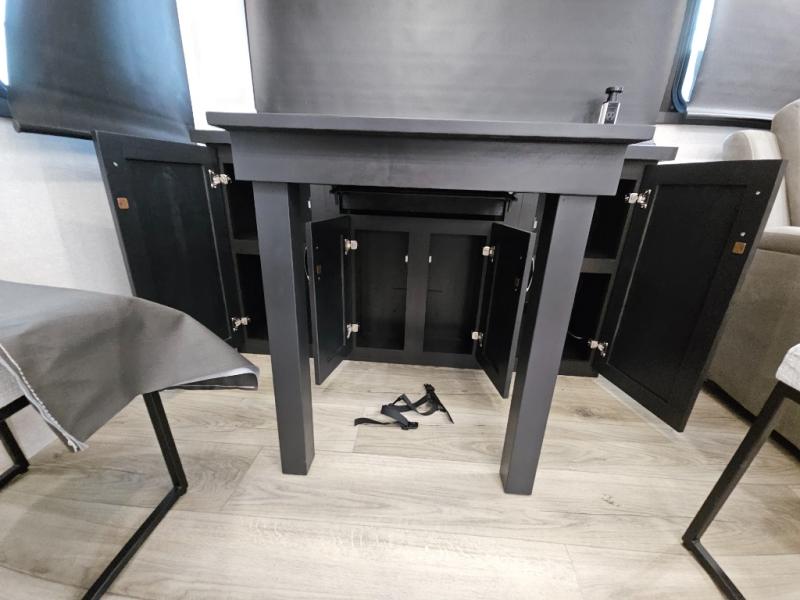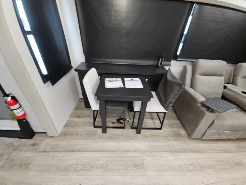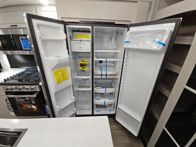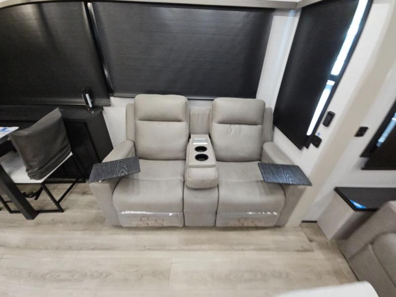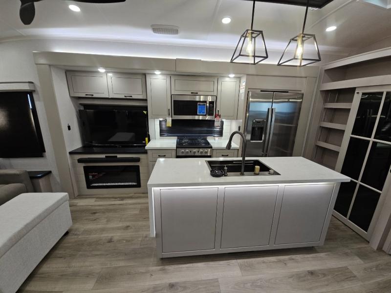 Finding the perfect RV park or campground is all you have to do, then you can load up and hit the road whether you are a full-timer or weekend warrior. The two electric awnings and the three slides are easy to set up and close, and you will have lots of interior and exterior storage to bring everything you might need. The kitchen offers a residential refrigerator and 24" stove, a 30" residential microwave, a kitchen island, a pantry and a pull-out countertop. You can relax on the tri-fold sofa and the theater seats while watching your shows on the 50" Smart LED HDTV with fully digital HDMI output and home entertainment system with subwoofer plus there is a fireplace below. Dine at the roll-top dinette table, or you can work from here as well. The front bedroom offers a king bed slide and a flip-top dresser with 32" TV, plus access to a spacious private front bath including a walk-in closet, washer/dryer prep, and more.