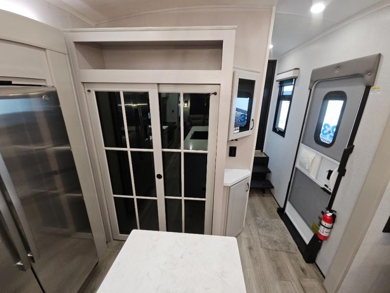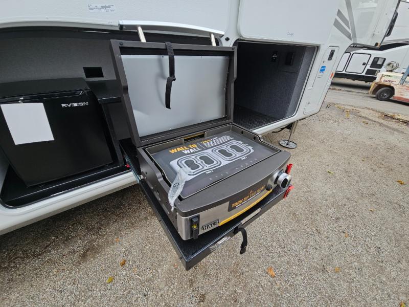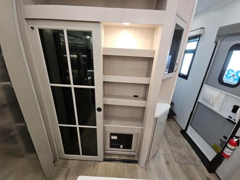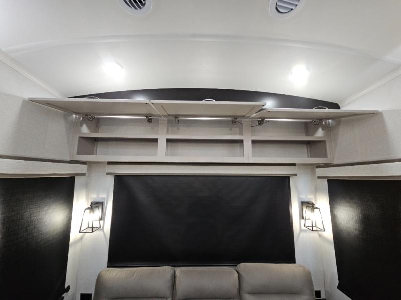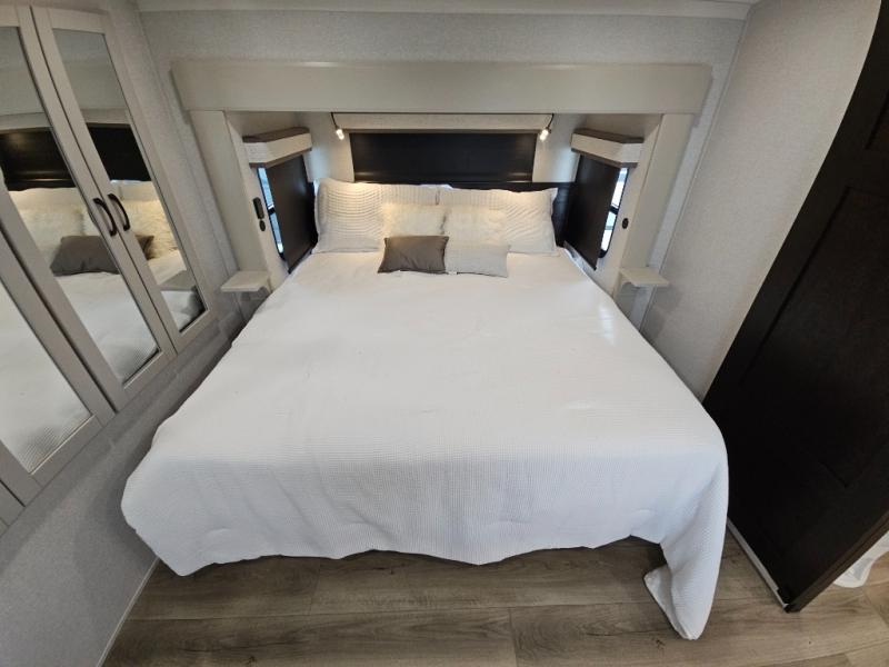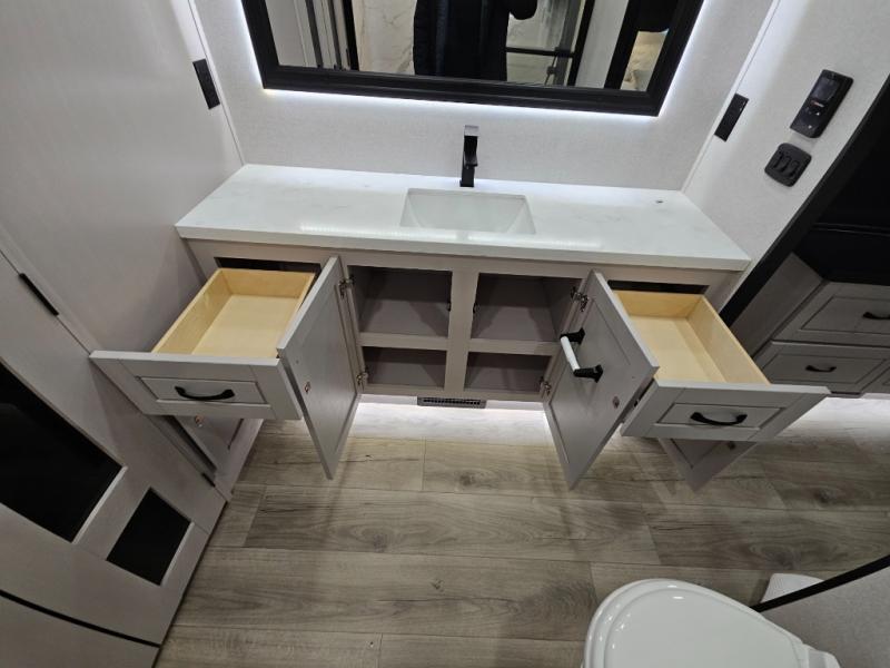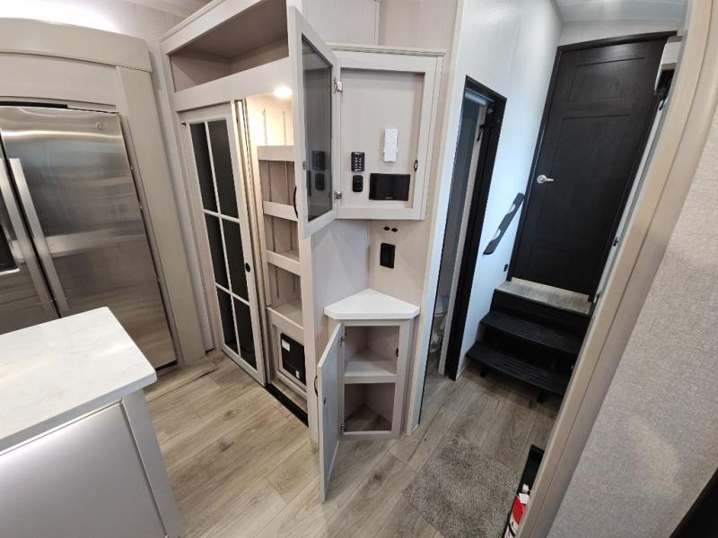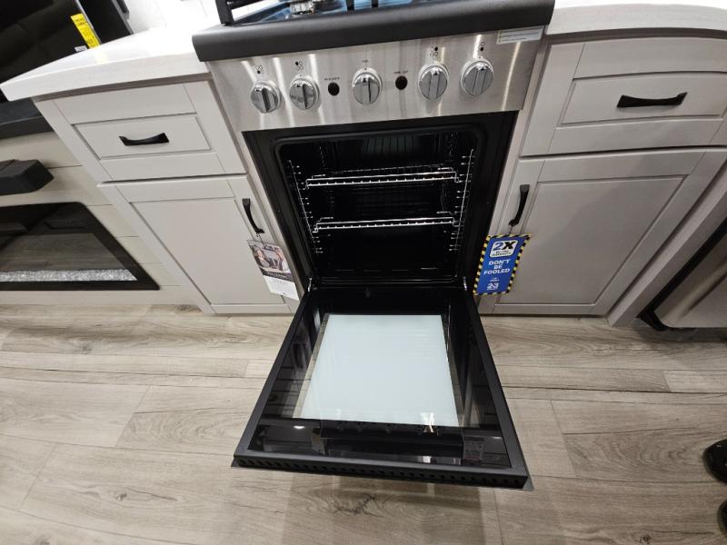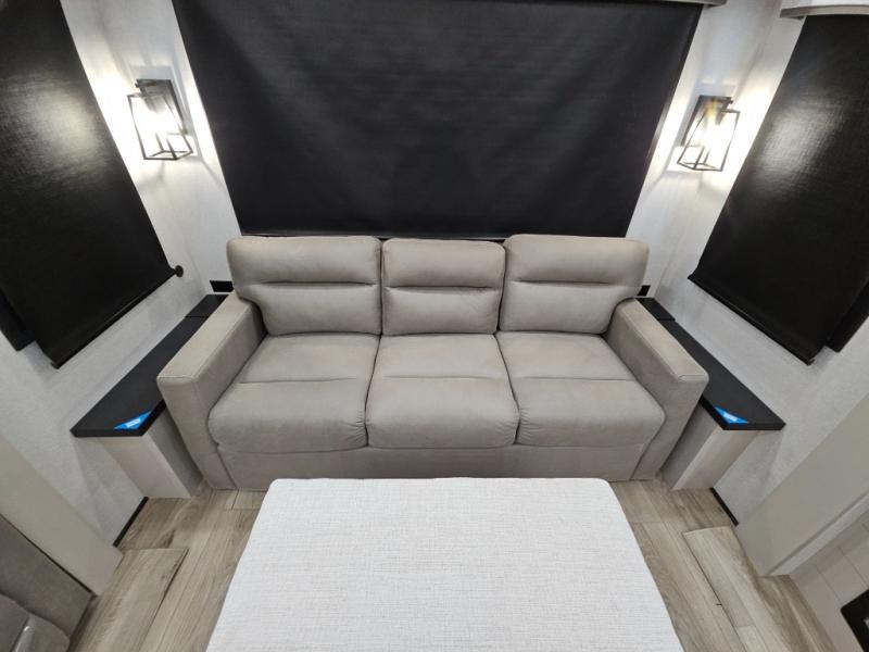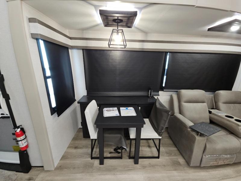 Finding the perfect RV park or campground is all you have to do, then you can load up and hit the road whether you are a full-timer or weekend warrior. The two electric awnings and the three slides are easy to set up and close, and you will have lots of interior and exterior storage to bring everything you might need. The kitchen offers a residential refrigerator and 24" stove, a 30" residential microwave, a kitchen island, a pantry and a pull-out countertop. You can relax on the tri-fold sofa and the theater seats while watching your shows on the 50" Smart LED HDTV with fully digital HDMI output and home entertainment system with subwoofer plus there is a fireplace below. Dine at the roll-top dinette table, or you can work from here as well. The front bedroom offers a king bed slide and a flip-top dresser with 32" TV, plus access to a spacious private front bath including a walk-in closet, washer/dryer prep, and more.