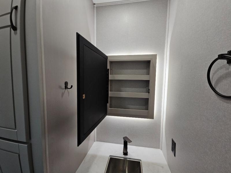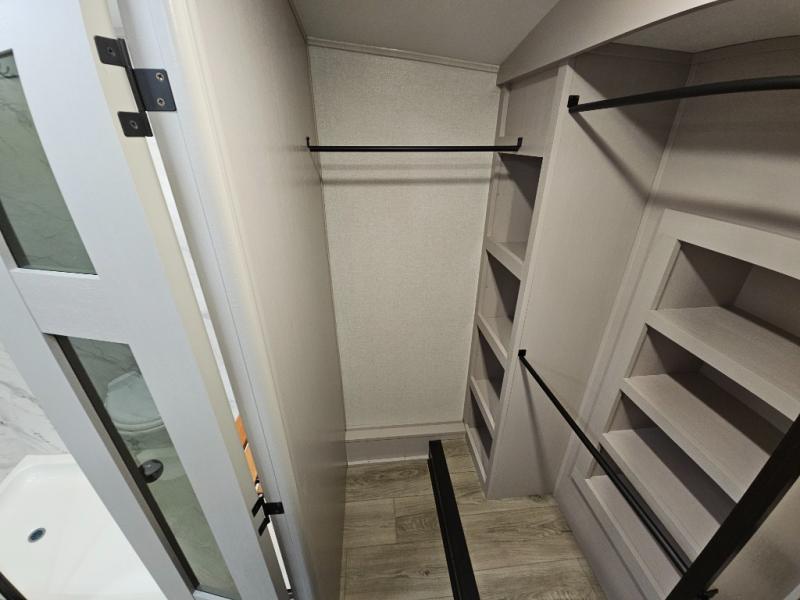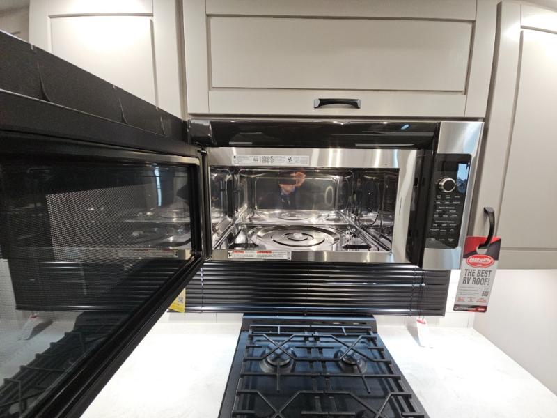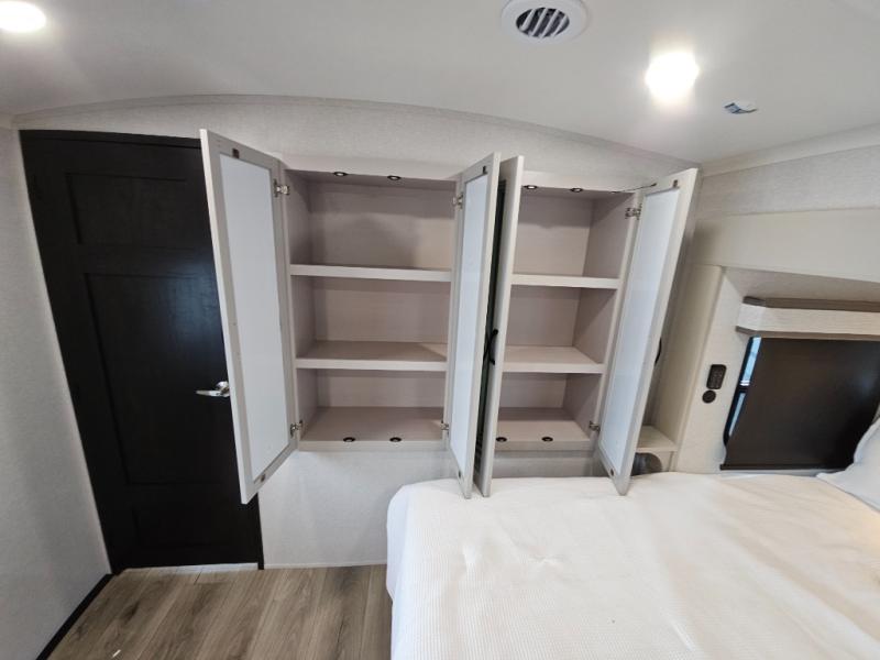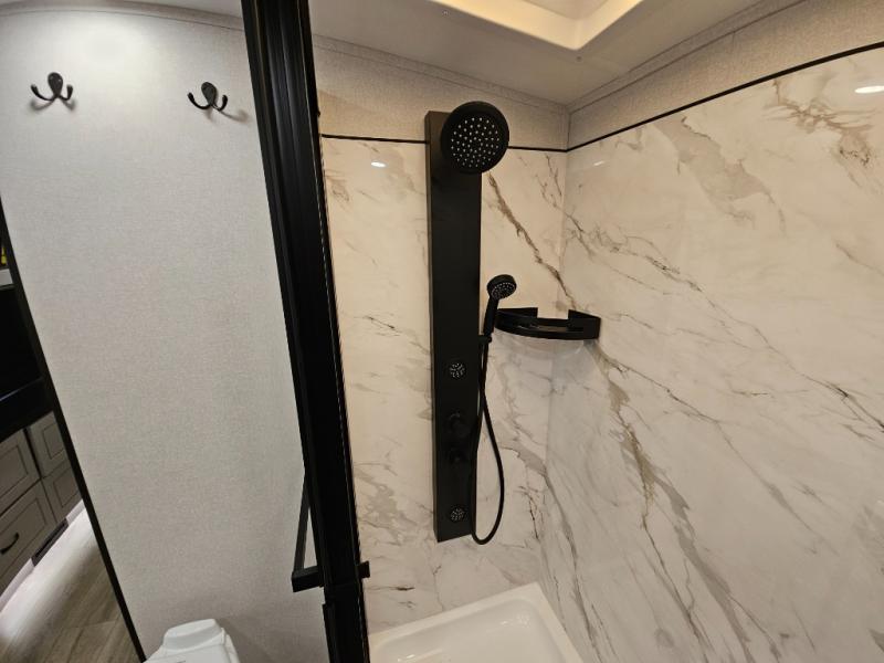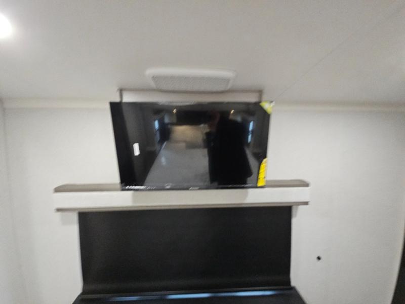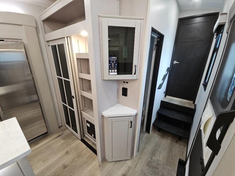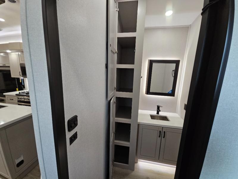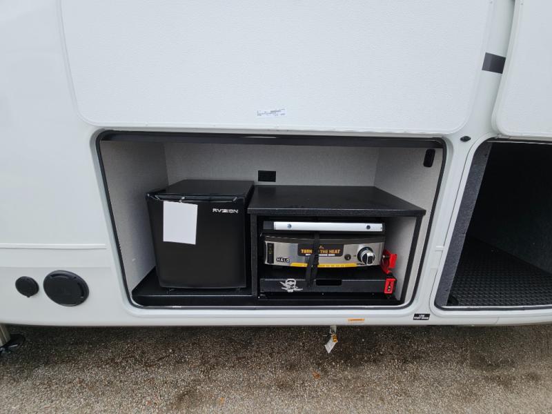 Finding the perfect RV park or campground is all you have to do, then you can load up and hit the road whether you are a full-timer or weekend warrior. The two electric awnings and the three slides are easy to set up and close, and you will have lots of interior and exterior storage to bring everything you might need. The kitchen offers a residential refrigerator and 24" stove, a 30" residential microwave, a kitchen island, a pantry and a pull-out countertop. You can relax on the tri-fold sofa and the theater seats while watching your shows on the 50" Smart LED HDTV with fully digital HDMI output and home entertainment system with subwoofer plus there is a fireplace below. Dine at the roll-top dinette table, or you can work from here as well. The front bedroom offers a king bed slide and a flip-top dresser with 32" TV, plus access to a spacious private front bath including a walk-in closet, washer/dryer prep, and more.