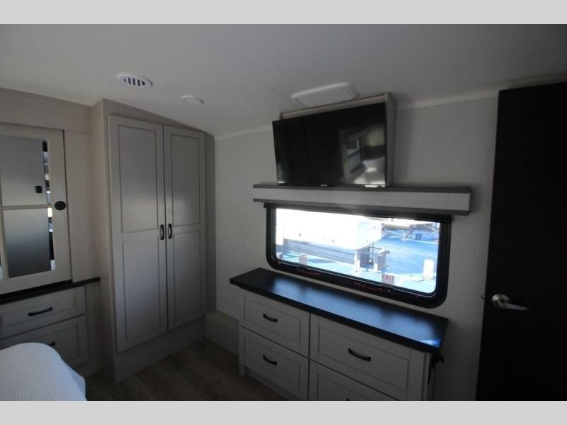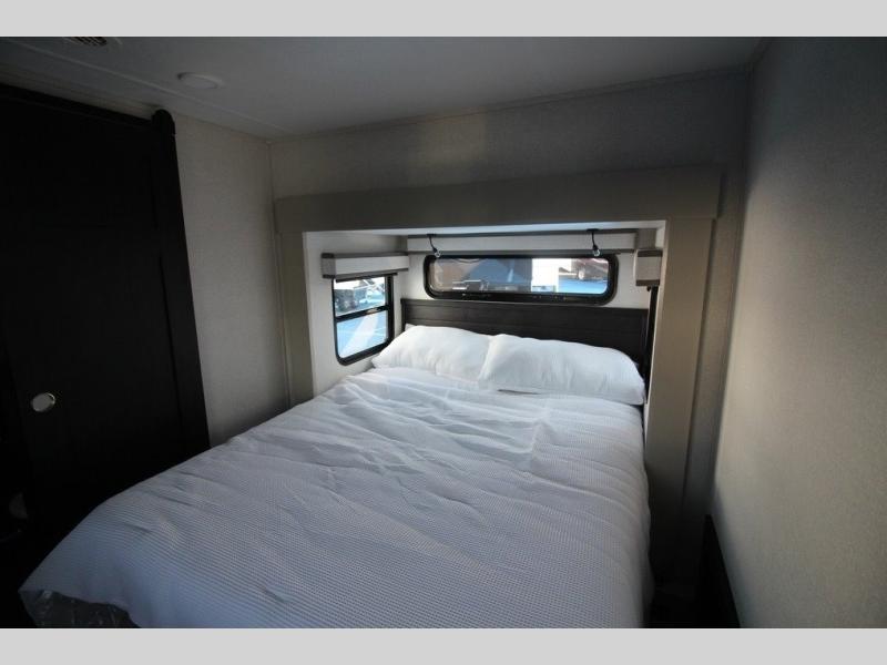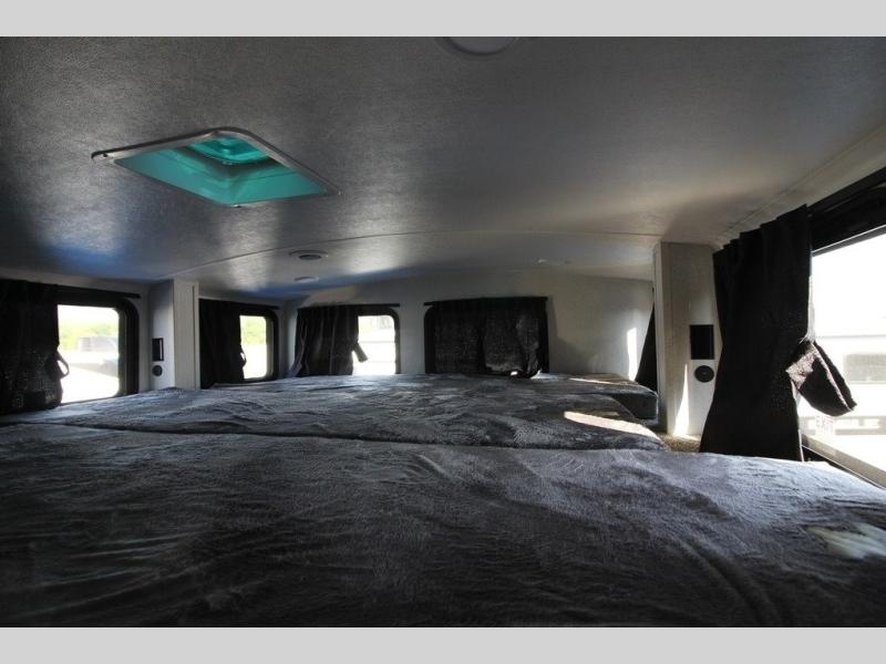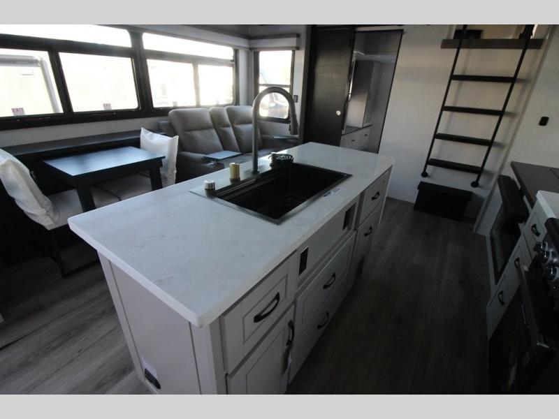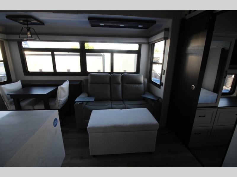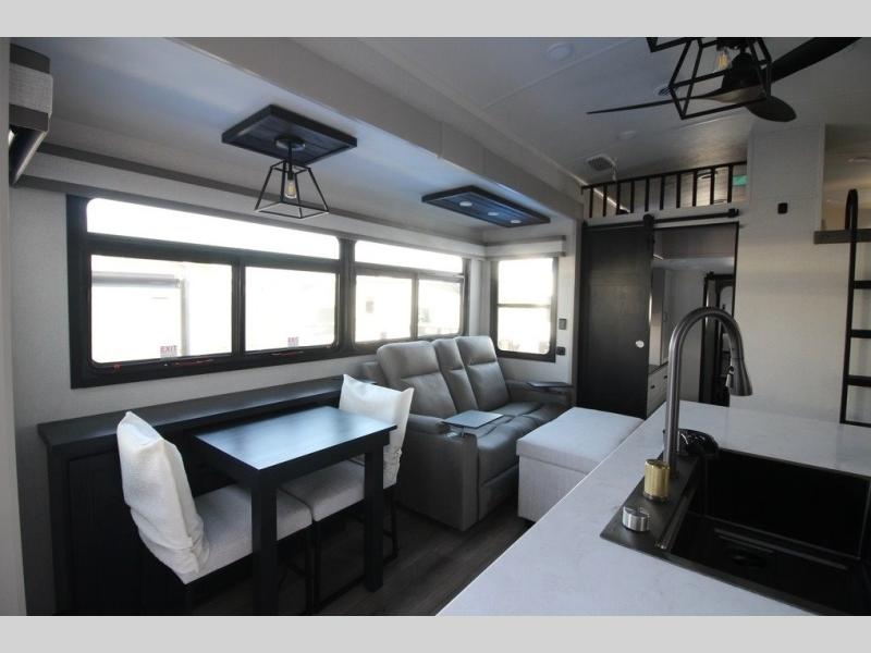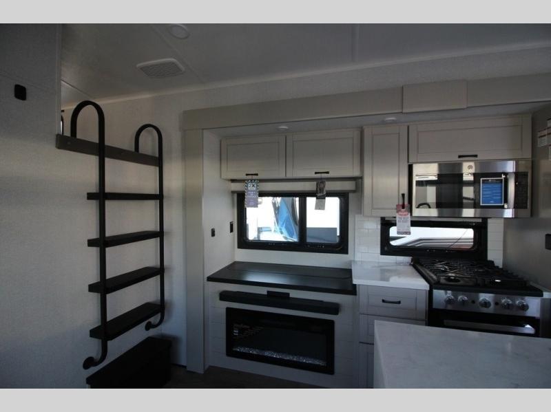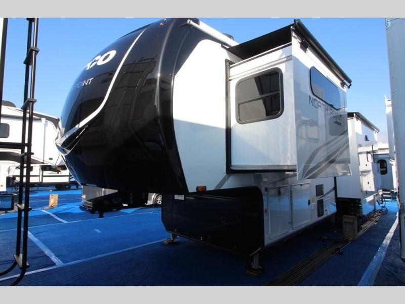 With two bedrooms plus a loft, there aren't many fifth wheels that can sleep as many people in as much comfort as this Jayco North Point! Up front is a private bedroom suite with a king bed and next to the bedroom is a full bathroom, while towards the rear you'll find a second bedroom with a queen bed. This bedroom also has an adjacent bathroom, conveniently all the way to the rear so it has its own entry door to the outside. There's also a loft with three bed mats which will be perfect for kids. In the center of it all you'll find a great living space, with a fully equipped kitchen and plenty of room for everyone to hang out. Relax in the theater seats across from the entertainment center, which features a 50" Smart LED HDTV and a fireplace for cozy evenings.