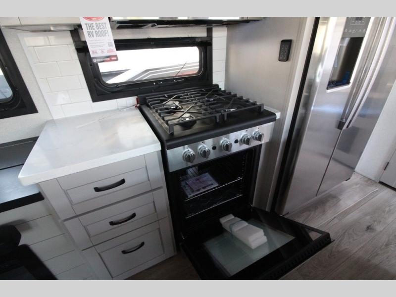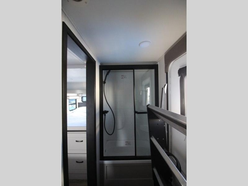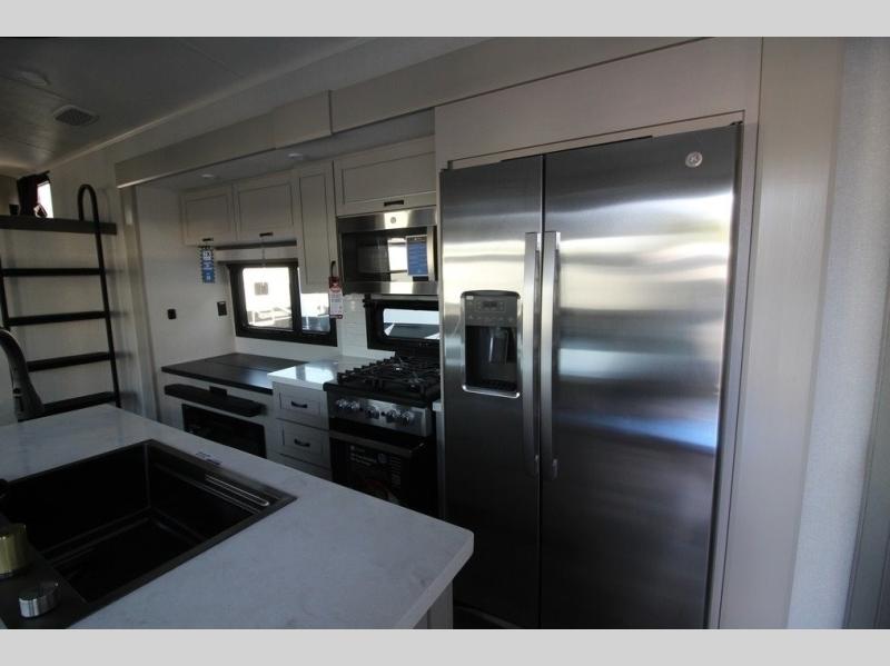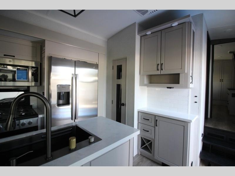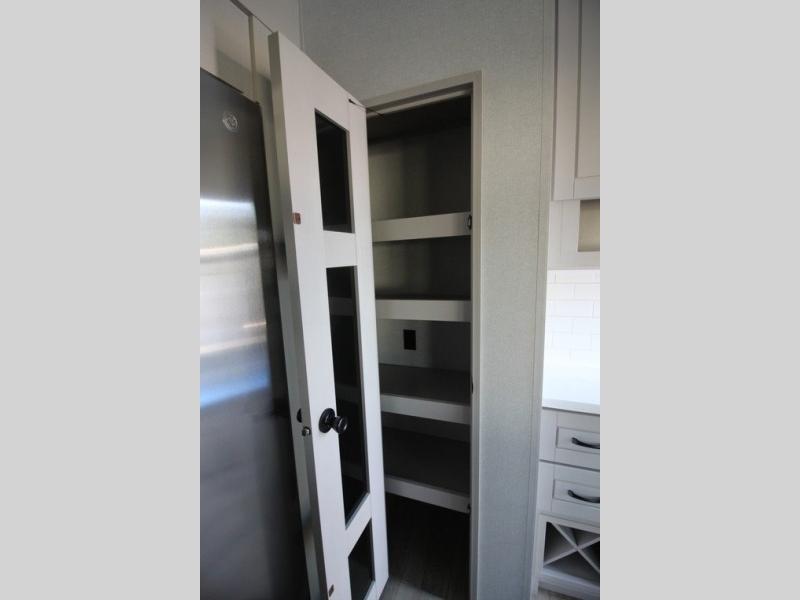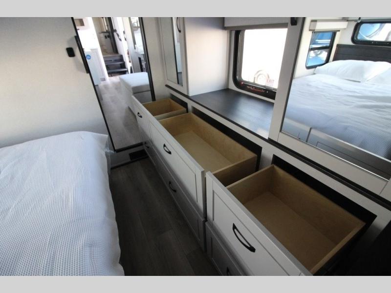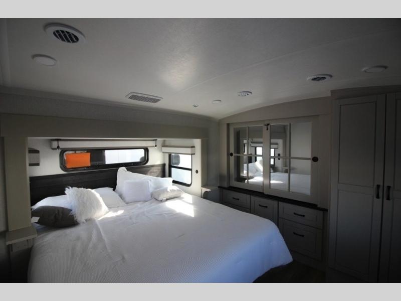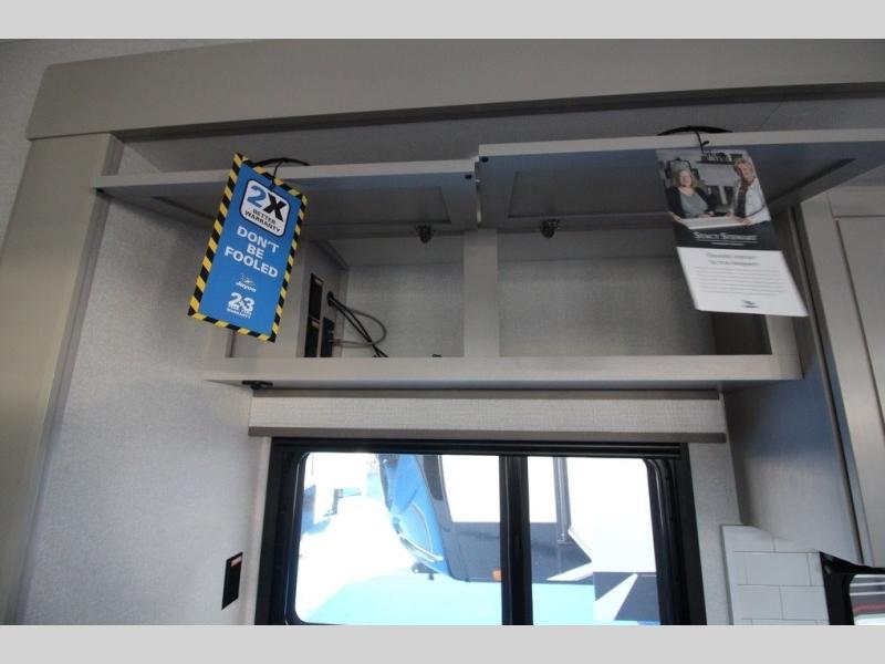 With two bedrooms plus a loft, there aren't many fifth wheels that can sleep as many people in as much comfort as this Jayco North Point! Up front is a private bedroom suite with a king bed and next to the bedroom is a full bathroom, while towards the rear you'll find a second bedroom with a queen bed. This bedroom also has an adjacent bathroom, conveniently all the way to the rear so it has its own entry door to the outside. There's also a loft with three bed mats which will be perfect for kids. In the center of it all you'll find a great living space, with a fully equipped kitchen and plenty of room for everyone to hang out. Relax in the theater seats across from the entertainment center, which features a 50" Smart LED HDTV and a fireplace for cozy evenings.