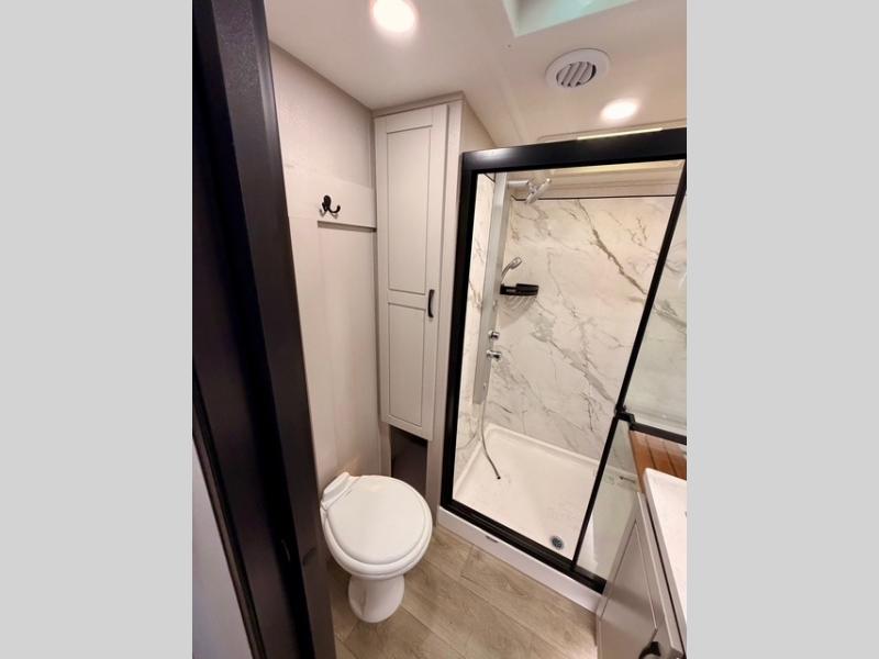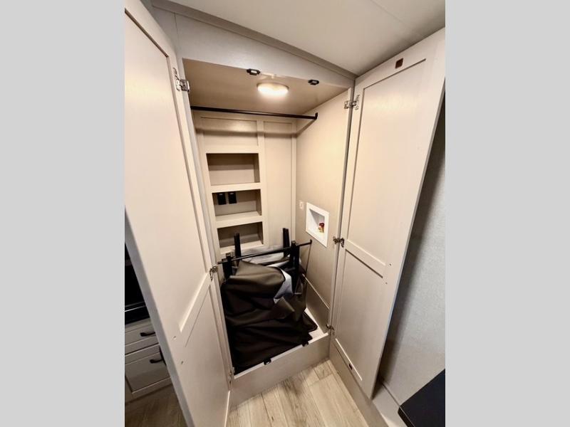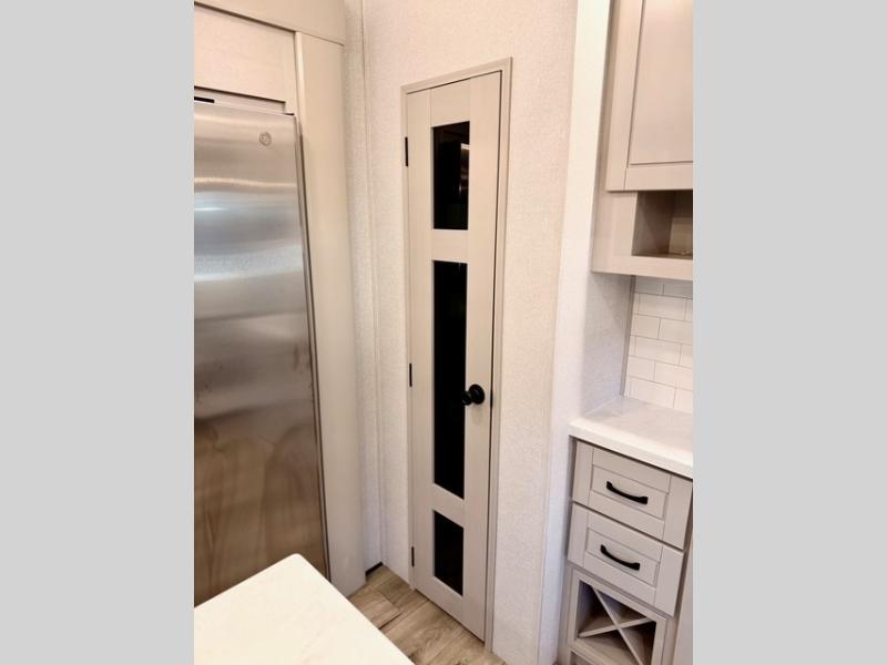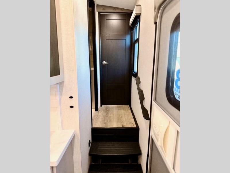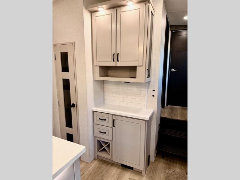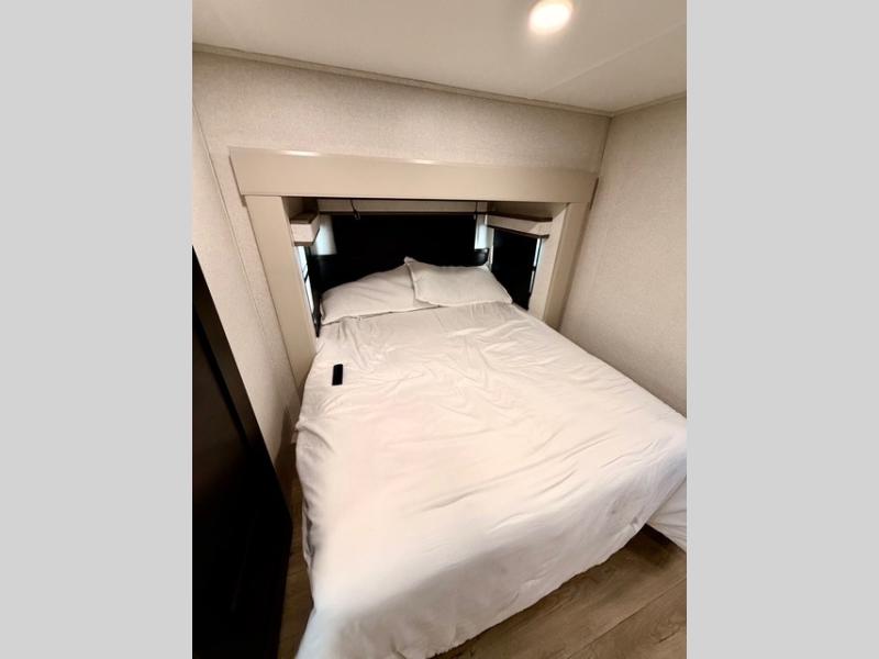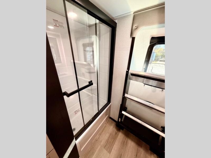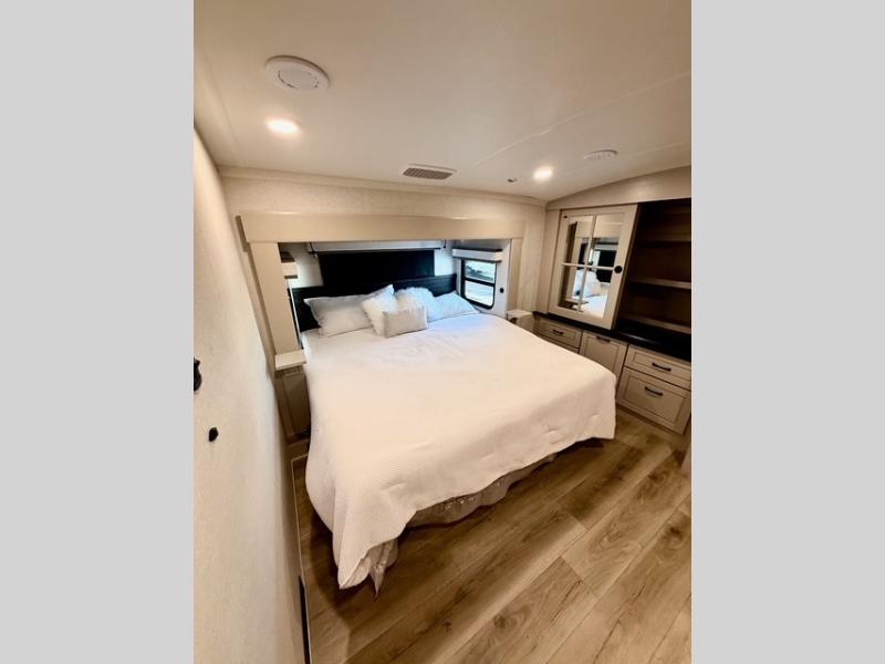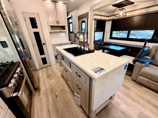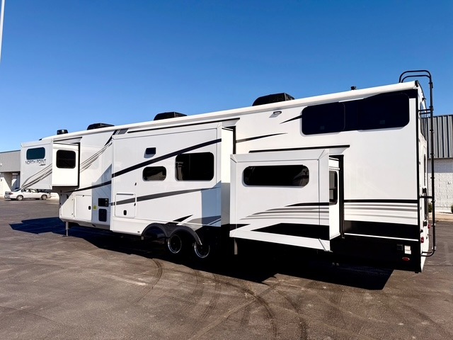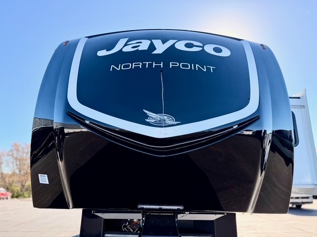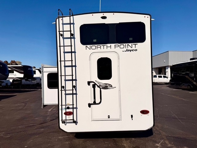 Jayco builds the North Point fifth wheels with strength and durability in mind. Each unit has a custom frame designed to support its weight and layout, Stronghold VBL™ aluminum-framed, vacuum-bonded laminated walls, and the Magnum Truss™ XL6™ roof system with an Alpha roof membrane, one of the strongest tested roofs in the industry. The 5-Star Handling Package includes Uniroyal tires, a MORryde rubber pin box, Dexter axles with Nev-R-Adjust brakes, MORryde CRE-3000 rubberized suspension, wet bolt fasteners, and bronze bushings for a smooth and reliable towing experience. The interior features handcrafted glazed hardwood doors and drawers, vinyl flooring throughout, integrated under-mount sinks, and high-end finishes throughout, offering comfort, style, and convenience for every member of the family.