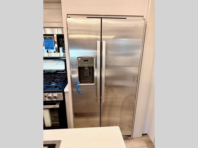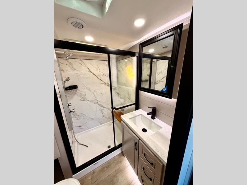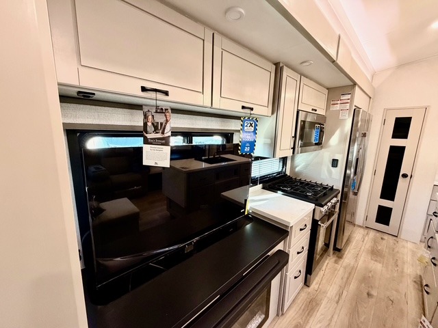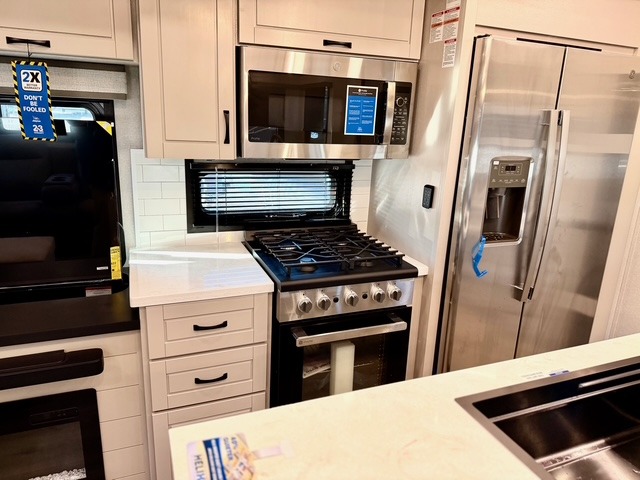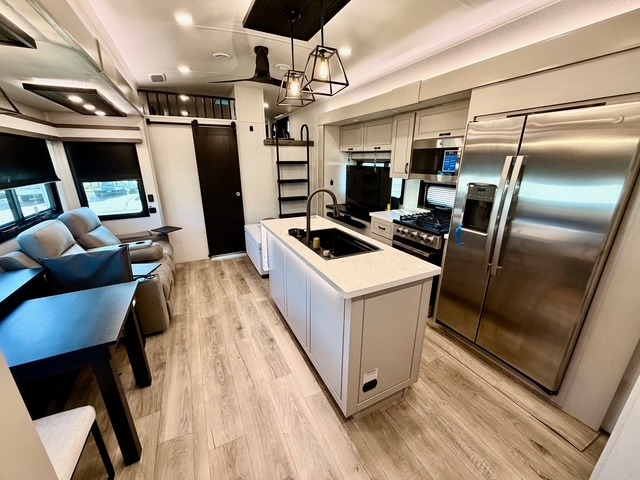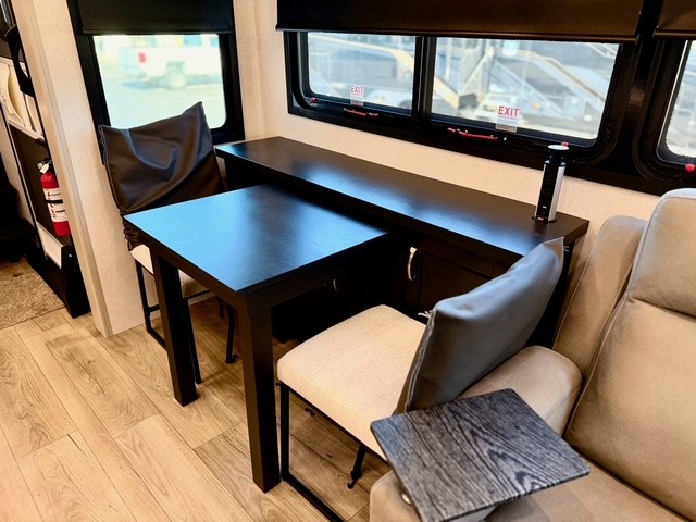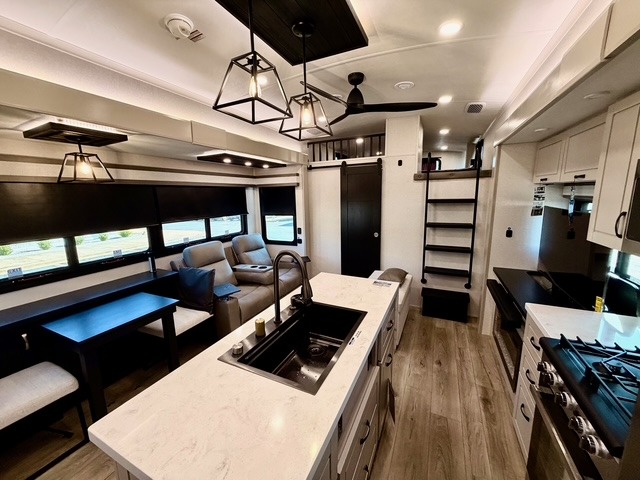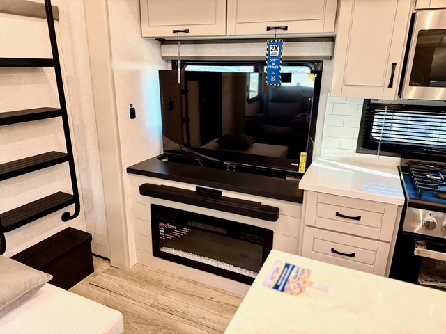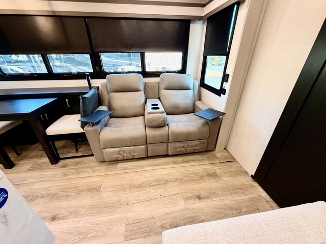 The central living area is designed for comfort and entertainment. The fully equipped kitchen includes a large kitchen island, residential appliances, ample counter space, and plenty of storage for all your cooking essentials. Relax in the theater seats or on one of the sofas while enjoying the 50" Smart LED HDTV and fireplace for cozy evenings. The dinette provides additional seating for meals or board games, and the open layout ensures everyone can gather together. Outside, the North Point 390CKDS features a fully equipped exterior kitchen for outdoor cooking, as well as two 16’ power awnings with integrated LED lighting for shaded outdoor living space and entertaining.