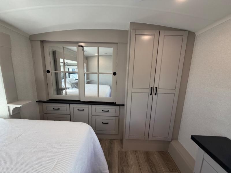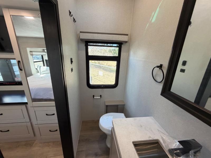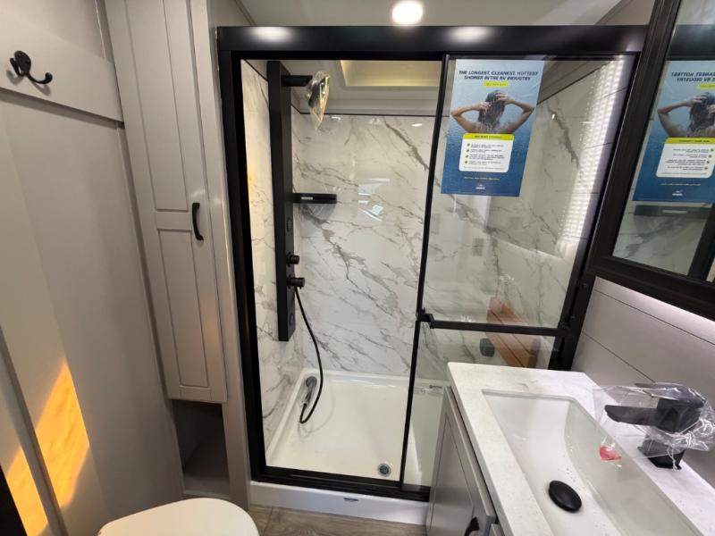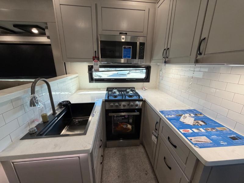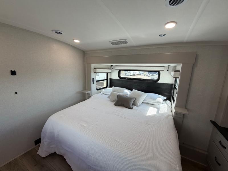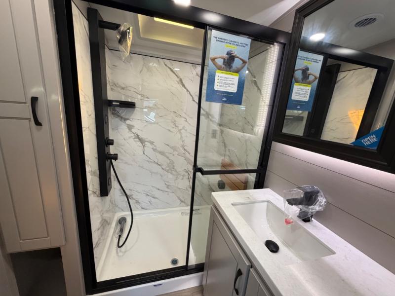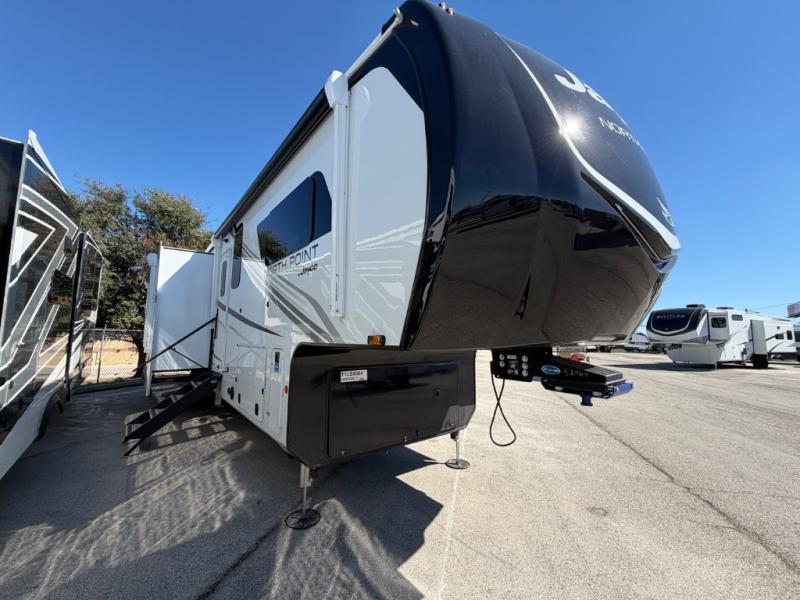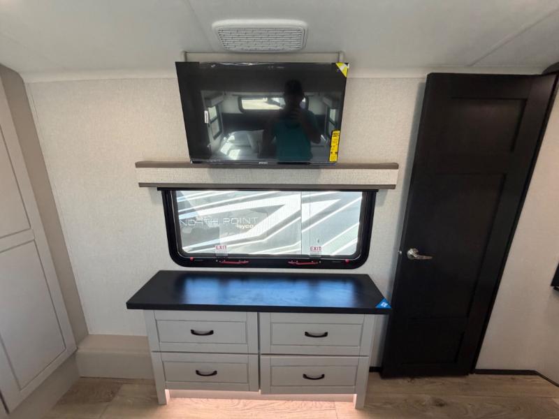 With any North Point fifth wheel by Jayco you begin with a strong foundation with a custom frame, designed and sized specifically to best support each unit. Constructed with Stronghold VBL™ aluminum framed, vacuum bond laminated walls and the Magnum Truss™ XL6™ roof system with an Alpha roof membrane system, which is the strongest tested roof in the industry. The 5-Star Handling package is included with H-rated tires with TPMS, a MORryde rubber pin box, Dexter axles with Nev-R-Adjust brakes, MORryde CRE-3000 rubberized suspension and wet bolt fasteners and bronze bushings. The interior has handcrafted hardwood glazed doors and drawers, vinyl flooring throughout, an integrated under-mount sink in the main bathroom, plus so much more you just have to see one to believe it all!