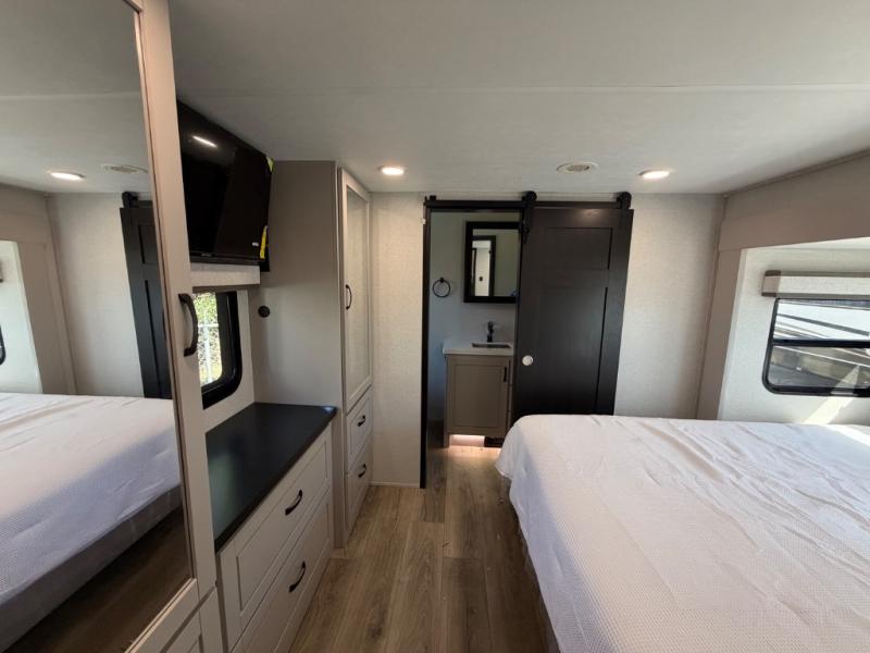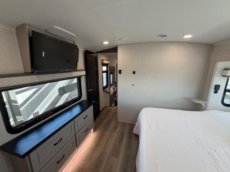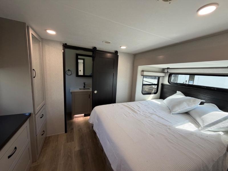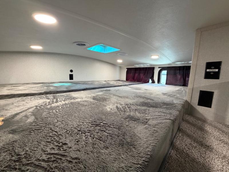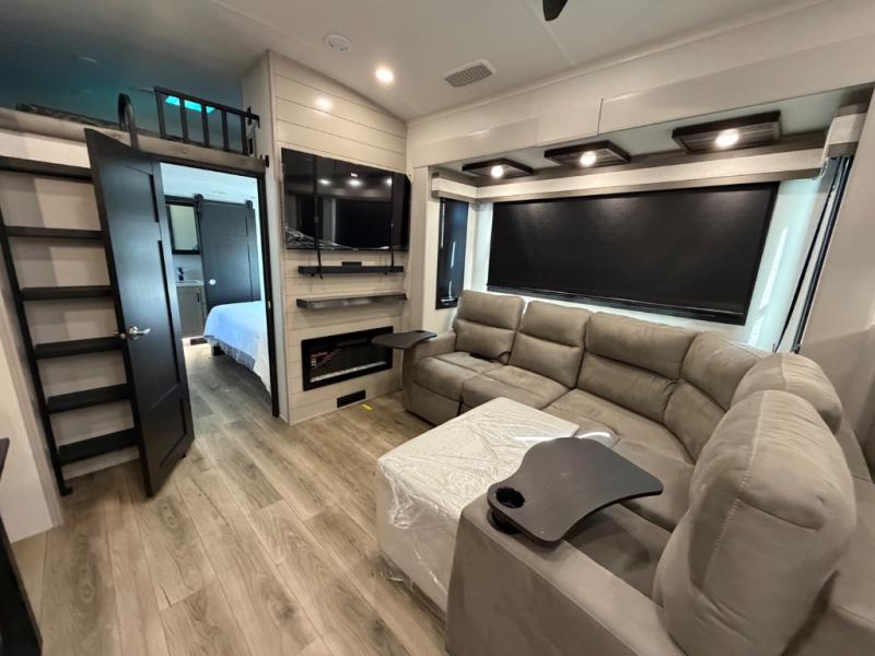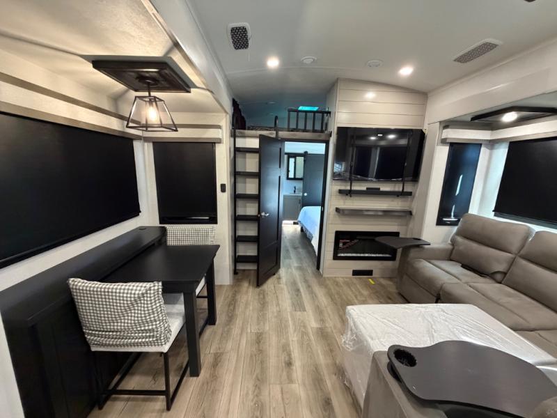 With two bedrooms plus a loft, there aren't many fifth wheels that can sleep as many people in as much comfort as this Jayco North Point! Up front is a private bedroom suite with a king bed and next to the bedroom is a full bathroom, while towards the rear you'll find a second bedroom with a queen bed. This bedroom also has an adjacent bathroom, conveniently all the way to the rear so it has its own entry door to the outside. There's also a loft with two bed mats which will be perfect for kids. In the center of it all you'll find a great living space, with a fully equipped kitchen and plenty of room for everyone to hang out. Relax in the L-shaped sofa across from the fireplace for cozy evenings.