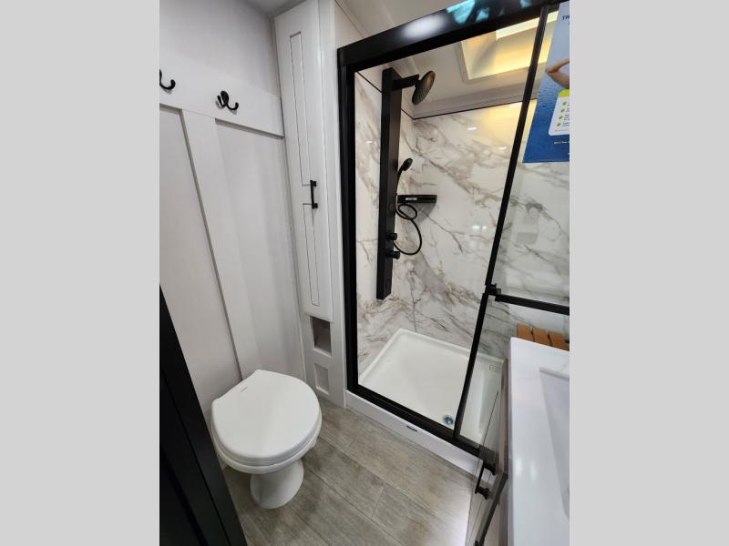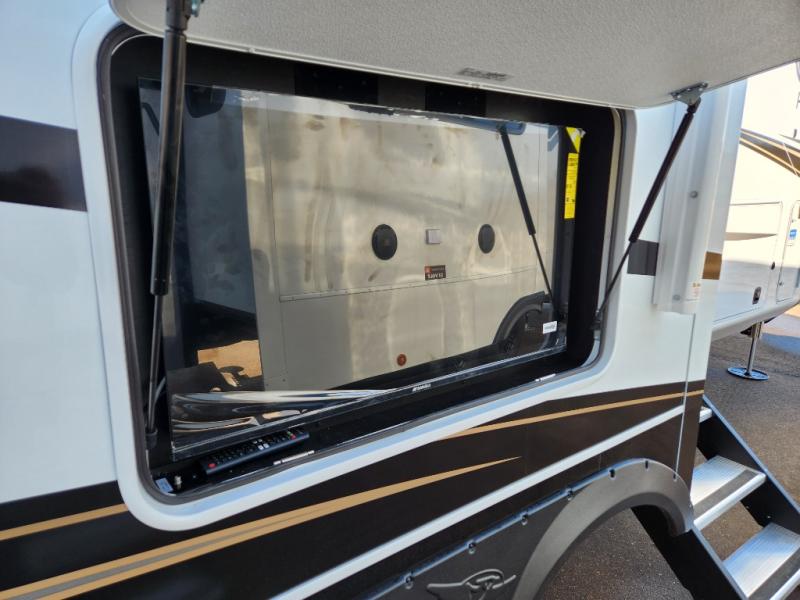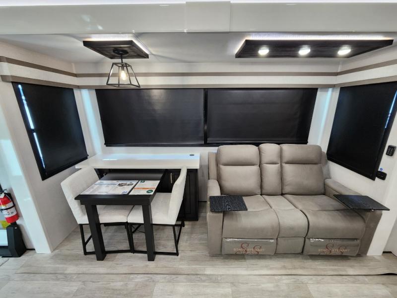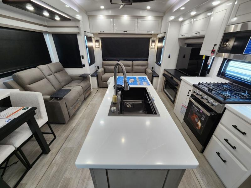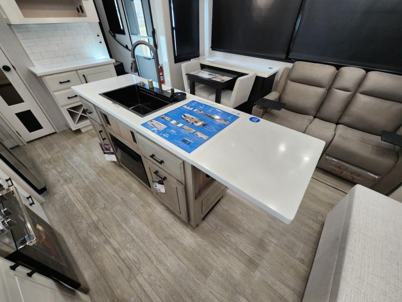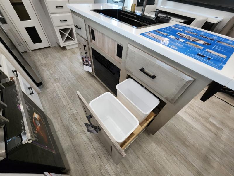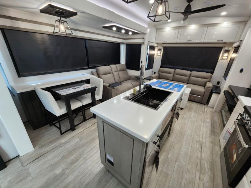 Each Pinnacle fifth wheel features Stronghold VBL lamination for the lightest, yet strongest construction in the RV industry. Add that to the Magnum Truss XL6 roof system and Climate Shield zero-degree tested weather protection and you'll be enjoying your fifth wheel for years to come. Some of the exterior conveniences you will appreciate are the Keyed-Alike lock system, the fully enclosed, universal docking center, and the 6-point hydraulic auto-leveling system for quick and easy set up. The 5 Star Handling Package will make towing a fifth wheel a walk in the park, and the two Whisper Quiet A/C units will keep you comfortable during the hot summer months. Inside, you'll enjoy the residential "Do it all" sink with pull-out kitchen faucet, glass rinse, and vegetable rinse, the handcrafted hardwood glazed cabinetry, the vinyl flooring throughout, plus many more comforts. There is even a central vacuum system, a wireless remote control system, USB ports throughout, plus many more conveniences to make each trip enjoyable.