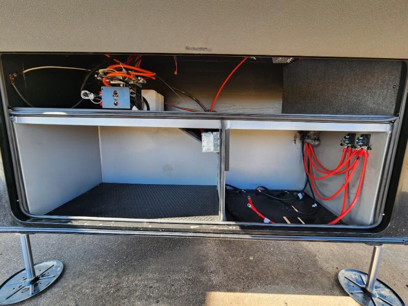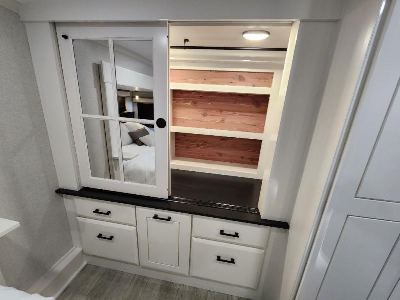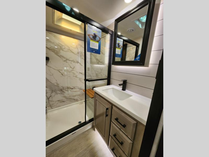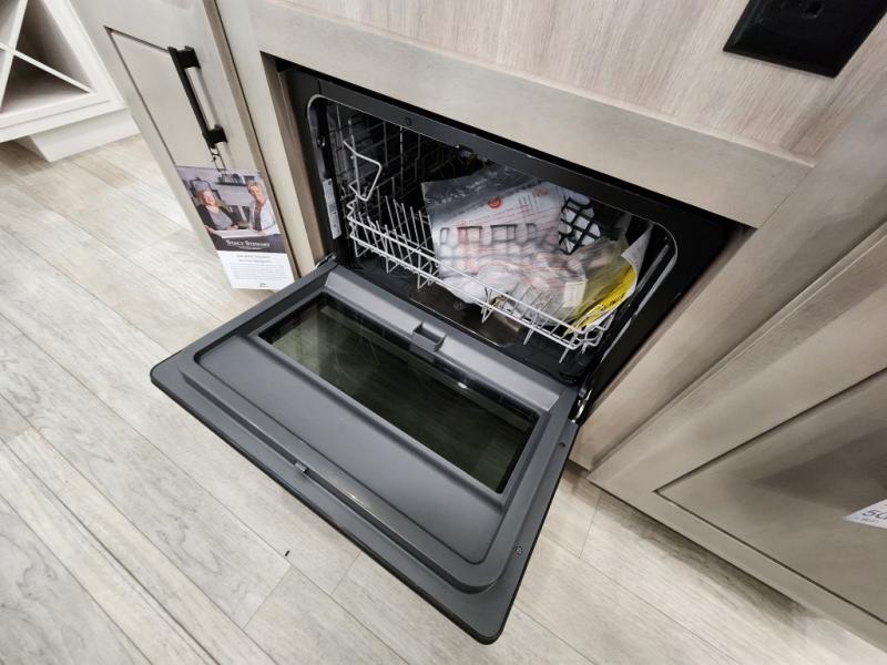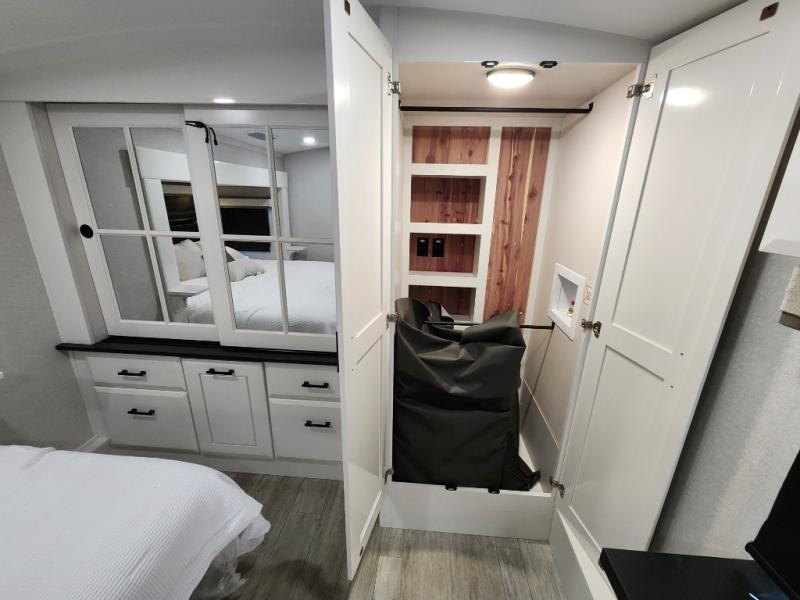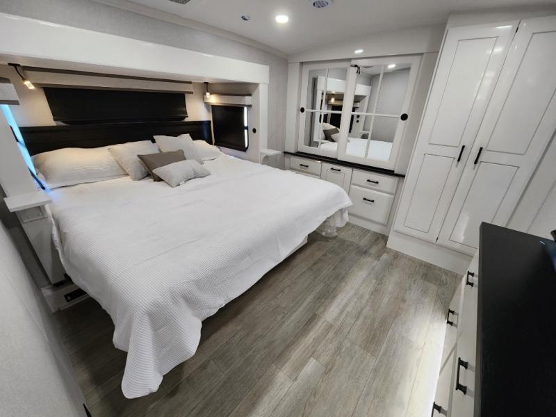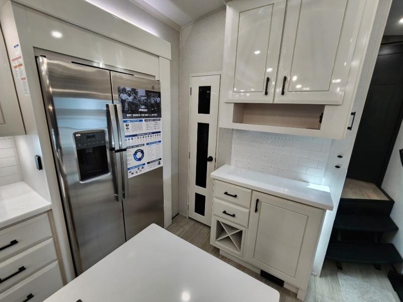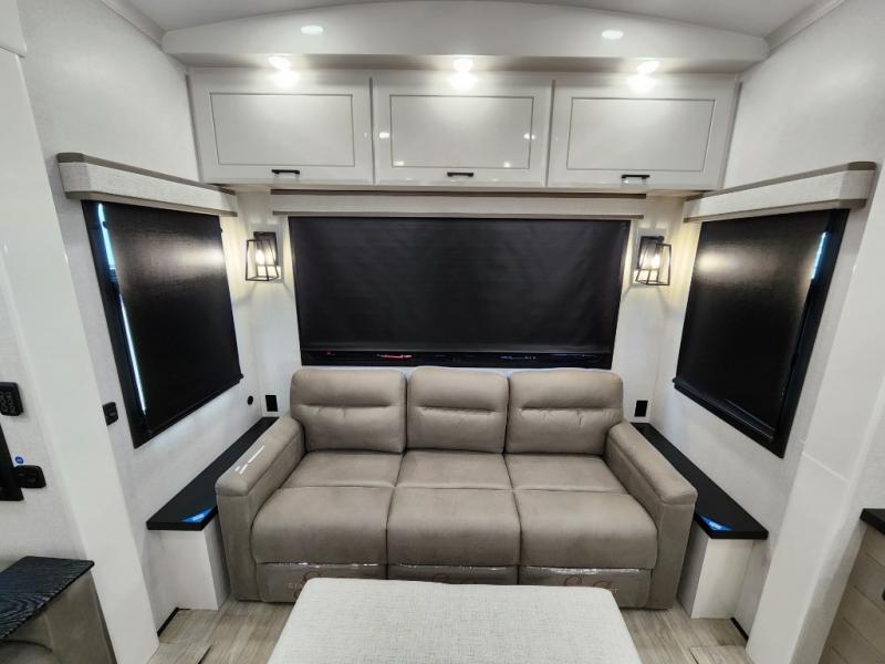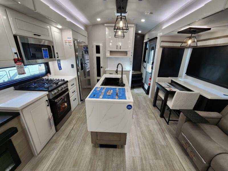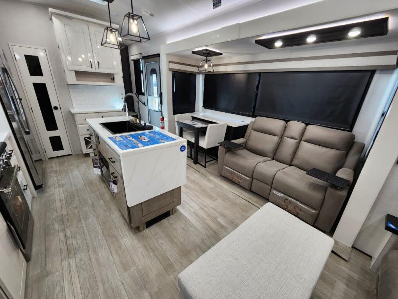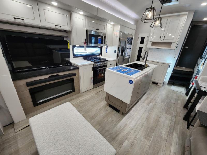 Trips to the lake are made comfortable in this triple slide out fifth wheel. Once you arrive at the campground, set up the two power awnings with LED lights, and there is an exterior TV for the big game. Head inside to relax on the theater seats directly across from the TV and fireplace, or play a game at the roll-top dinette. The chef of your group will love this kitchen with its residential refrigerator, kitchen island, and pantry, plus additional storage for canned goods or paper products. The full bath will allow you to stay clean throughout your trip, and you'll find a residential style backsplash in the bath, plus a walk-in shower. Nothing says luxury like your own king bed slide out in the front bedroom, a large front closet with hamper and drawers for wrinkle-free clothes, and a flip-up dresser featuring a 32" TV!