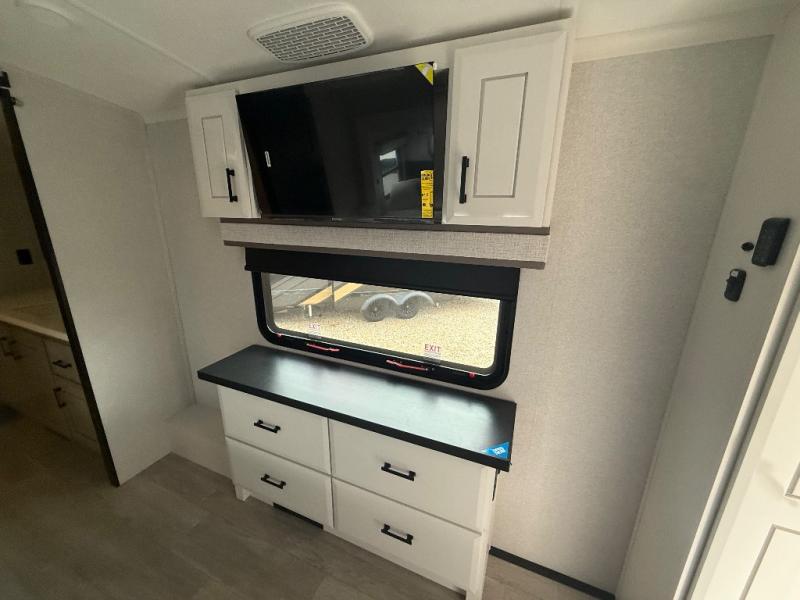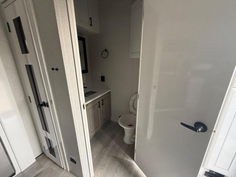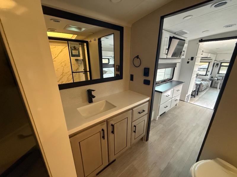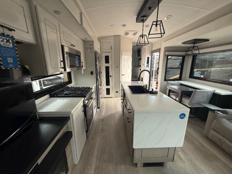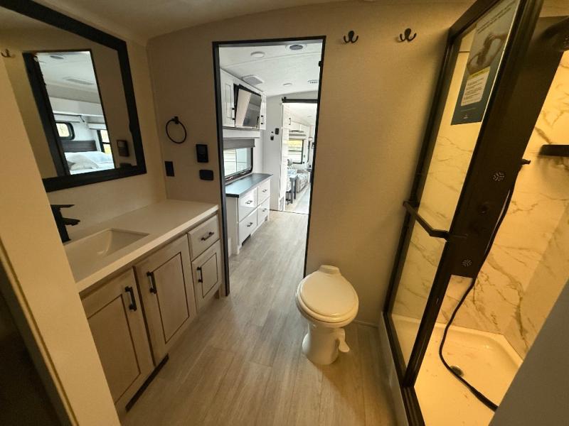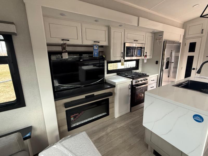 You can't go wrong with this fifth wheel that can sleep four! You will love how much space you have in the main living area thanks to the dual opposing slides, and there is a kitchen island here with a pull-out extension for added prep space. The convenient half bath is right off of the kitchen for quick restroom breaks, and you'll find a shoe garage and a wardrobe just as you enter the unit to keep the RV tidy. Head to the master bedroom for a rest on the king bed slide out, or you may want to watch a show on the 32" bedroom TV. The front master bath may be your favorite feature of this unit. Here, you'll find dual bath sinks, a walk-in shower with a seat, plus a spacious walk-in closet for your clothes. And don't overlook the exterior with its two power awnings, 32" exterior TV, and a Jayport with LP quick connect for your outdoor grill.