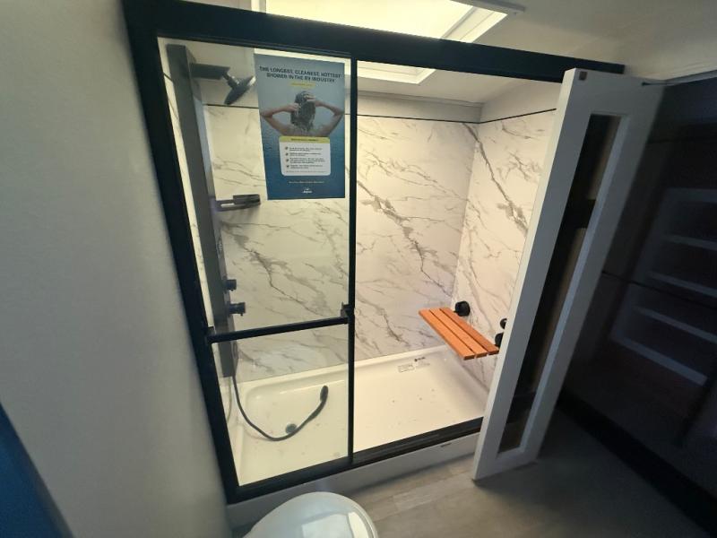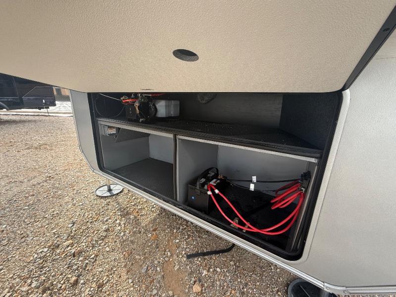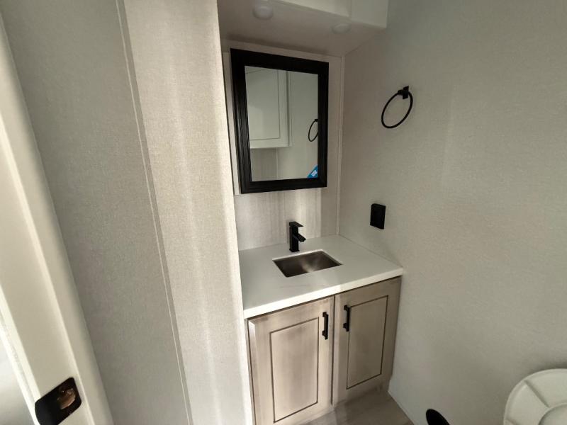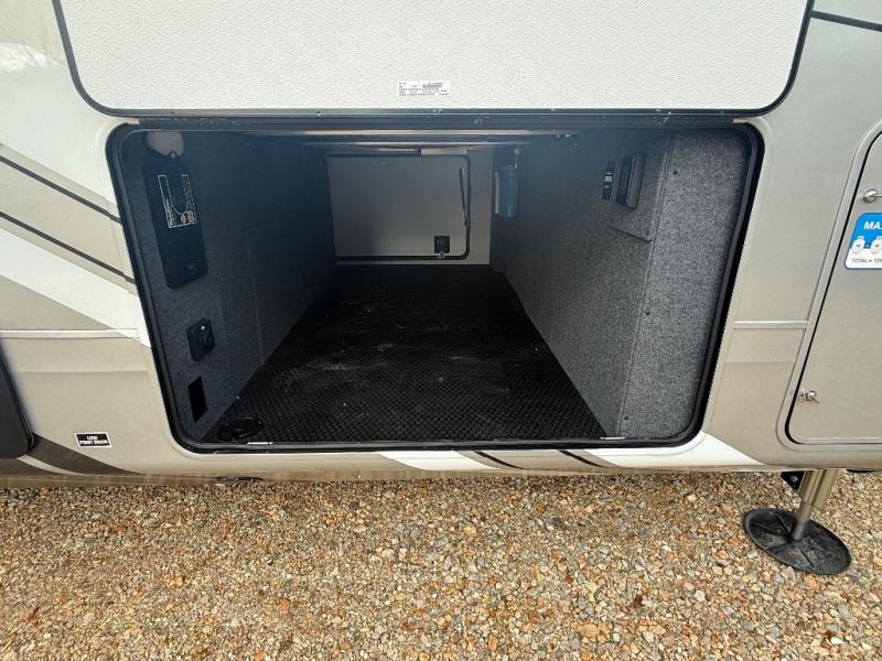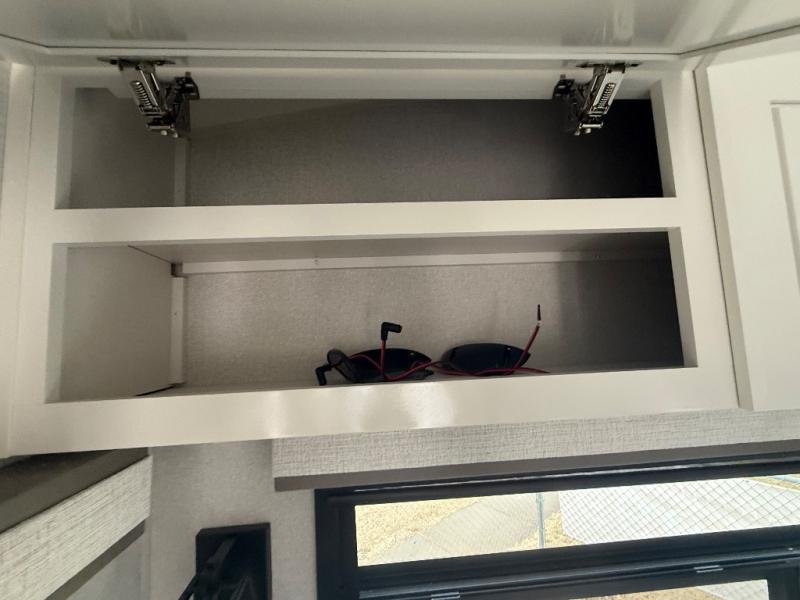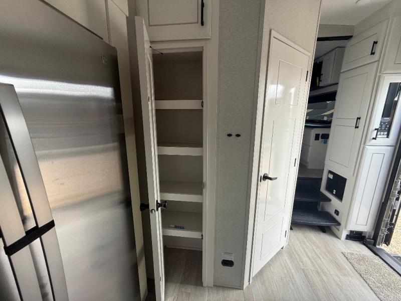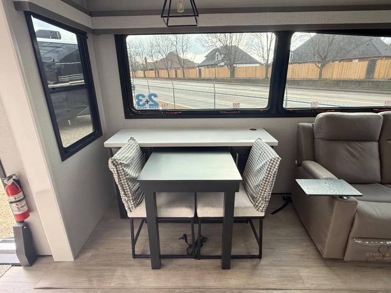 You can't go wrong with this fifth wheel that can sleep four! You will love how much space you have in the main living area thanks to the dual opposing slides, and there is a kitchen island here with a pull-out extension for added prep space. The convenient half bath is right off of the kitchen for quick restroom breaks, and you'll find a shoe garage and a wardrobe just as you enter the unit to keep the RV tidy. Head to the master bedroom for a rest on the king bed slide out, or you may want to watch a show on the 32" bedroom TV. The front master bath may be your favorite feature of this unit. Here, you'll find dual bath sinks, a walk-in shower with a seat, plus a spacious walk-in closet for your clothes. And don't overlook the exterior with its two power awnings, 32" exterior TV, and a Jayport with LP quick connect for your outdoor grill.