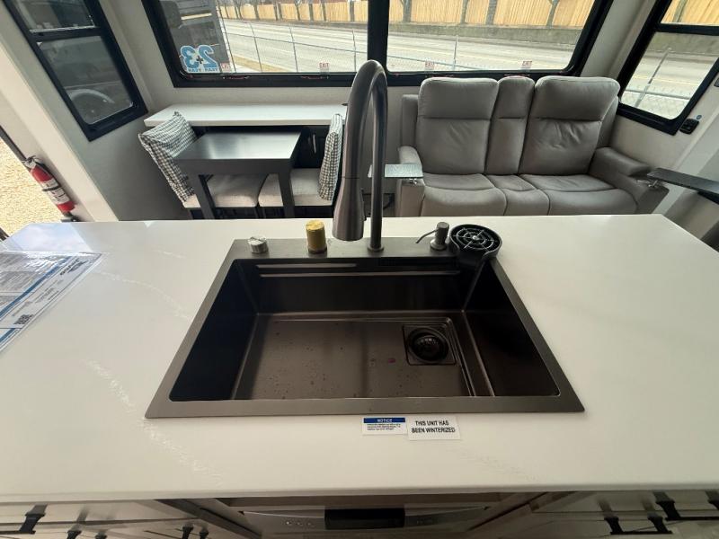 Each Pinnacle fifth wheel features Stronghold VBL lamination for the lightest, yet strongest construction in the RV industry. Add that to the Magnum Truss XL6 roof system and Climate Shield zero-degree tested weather protection and you'll be enjoying your fifth wheel for years to come. Some of the exterior conveniences you will appreciate are the Keyed-Alike lock system, the fully enclosed, universal docking center, and the 6-point hydraulic auto-leveling system for quick and easy set up. The 5 Star Handling Package will make towing a fifth wheel a walk in the park, and the two Whisper Quiet A/C units will keep you comfortable during the hot summer months. Inside, you'll enjoy the residential "Do it all" sink with pull-out kitchen faucet, glass rinse, and vegetable rinse, the handcrafted hardwood glazed cabinetry, the vinyl flooring throughout, plus many more comforts. There is even a central vacuum system, a wireless remote control system, USB ports throughout, plus many more conveniences to make each trip enjoyable.