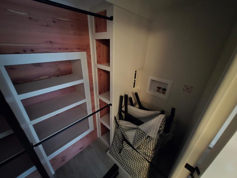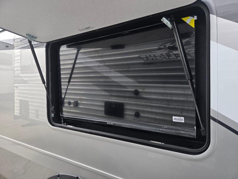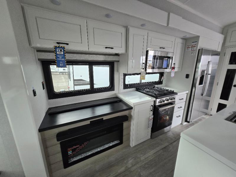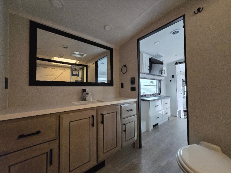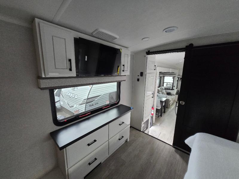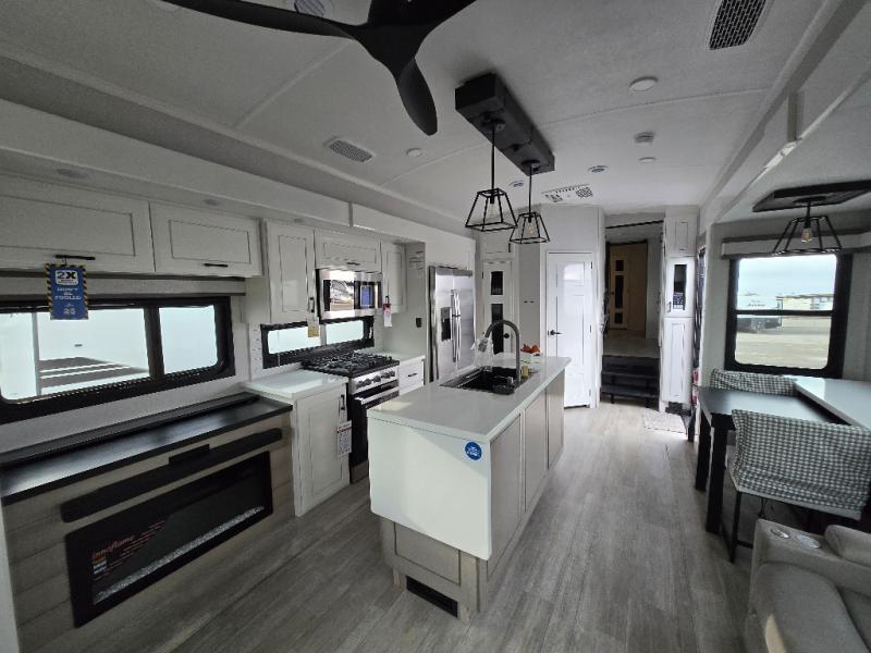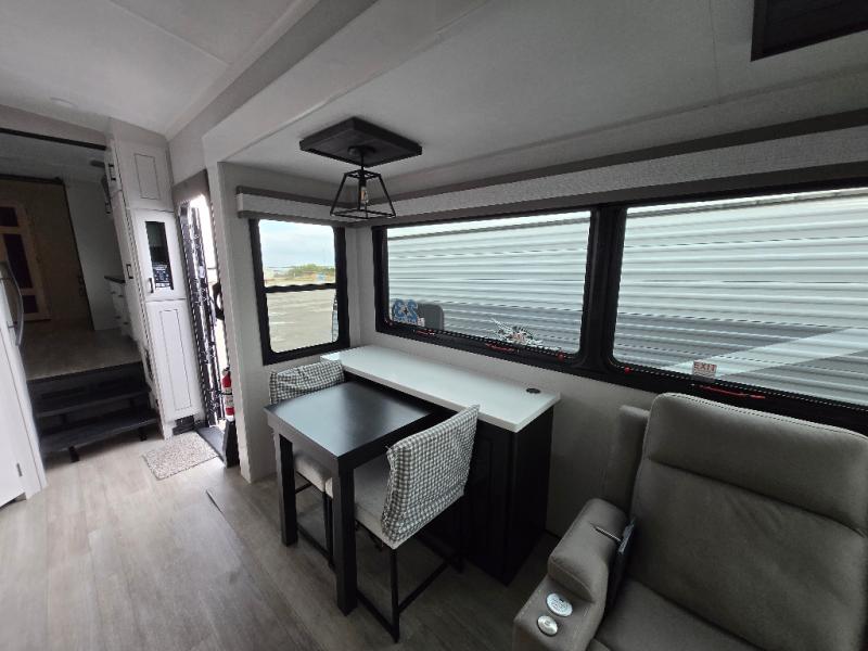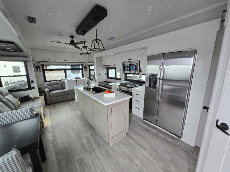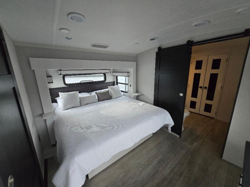 You can't go wrong with this fifth wheel that can sleep four! You will love how much space you have in the main living area thanks to the dual opposing slides, and there is a kitchen island here with a pull-out extension for added prep space. The convenient half bath is right off of the kitchen for quick restroom breaks, and you'll find a shoe garage and a wardrobe just as you enter the unit to keep the RV tidy. Head to the master bedroom for a rest on the king bed slide out, or you may want to watch a show on the 32" bedroom TV. The front master bath may be your favorite feature of this unit. Here, you'll find dual bath sinks, a walk-in shower with a seat, plus a spacious walk-in closet for your clothes. And don't overlook the exterior with its two power awnings, 32" exterior TV, and a Jayport with LP quick connect for your outdoor grill.
