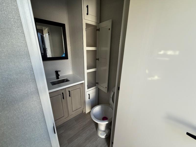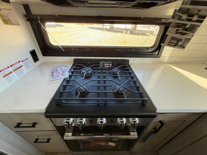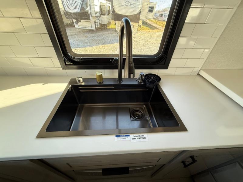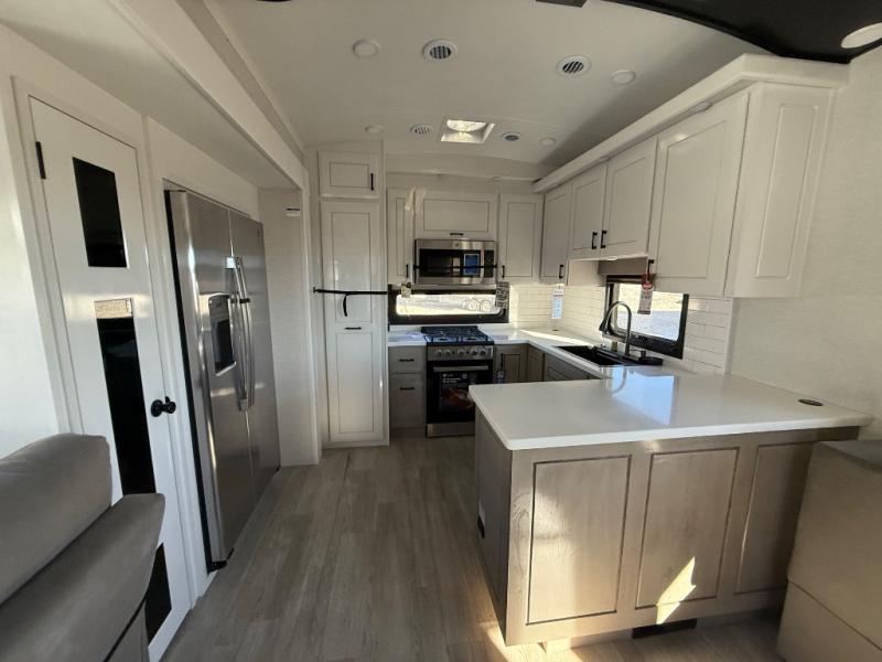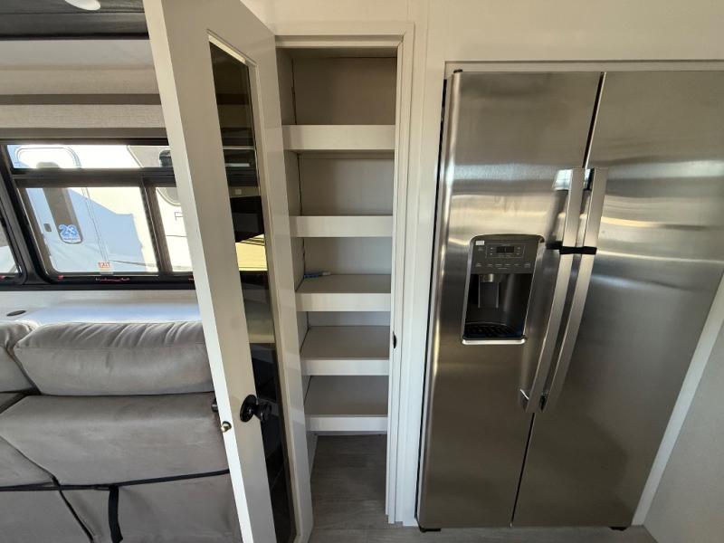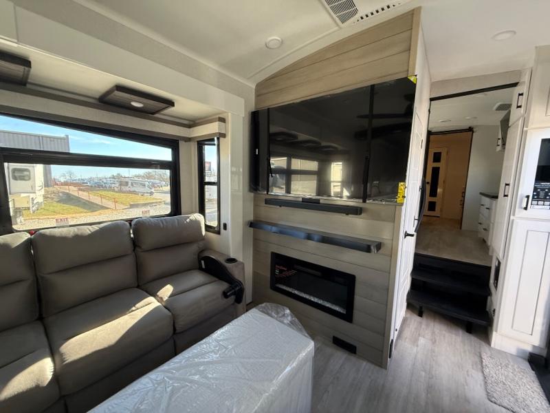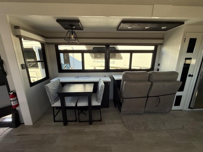 Triples slides, a desk/coffee bar, fireplace, and a huge master bath in front all indicate the kind of vacation you will experience in this Pinnacle Fifth Wheel! As you enter, a convenient half bath is located straight ahead. Slightly to your left, a nice seating area for gathering with family or friends to relax and watch TV, enjoy the fireplace while reading a book or watching a movie, and the dining table with chairs. The dinette slide also houses a 21 cu. ft. residential refrigerator and pantry. The rear kitchen features a u-shaped counter, all the appliances you need to cook like at home, even a pull-out butcher block space for chopping up your veggies. Back through and up the steps to your right in front, the master bedroom will make you feel like royalty with its king bed, plus luxurious full rear bath. A huge vanity with dual bath sinks will allow you both to get ready at the same time, plus there is a walk-in shower with a seat for added convenience. Speaking of walk-in, you will also love the spacious walk-in closet that includes washer/dryer prep.