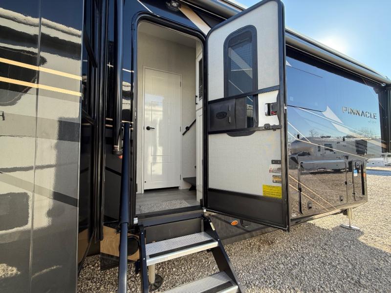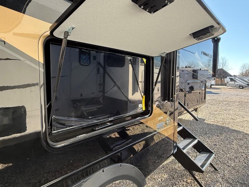 Each Pinnacle fifth wheel features Stronghold VBL lamination for the lightest, yet strongest construction in the RV industry. Add that to the Magnum Truss XL6 roof system and Climate Shield zero-degree tested weather protection and you'll be enjoying your fifth wheel for years to come. Some of the exterior conveniences you will appreciate are the Keyed-Alike lock system, the fully enclosed, universal docking center, and the 6-point hydraulic auto-leveling system for quick and easy set up. The 5 Star Handling Package will make towing a fifth wheel a walk in the park, and the two Whisper Quiet A/C units will keep you comfortable during the hot summer months. Inside, you'll enjoy the residential "Do it all" sink with pull-out kitchen faucet, glass rinse, and vegetable rinse, the handcrafted hardwood glazed cabinetry, the vinyl flooring throughout, plus many more comforts. There is even a central vacuum system, a wireless remote control system, USB ports throughout, plus many more conveniences to make each trip enjoyable.