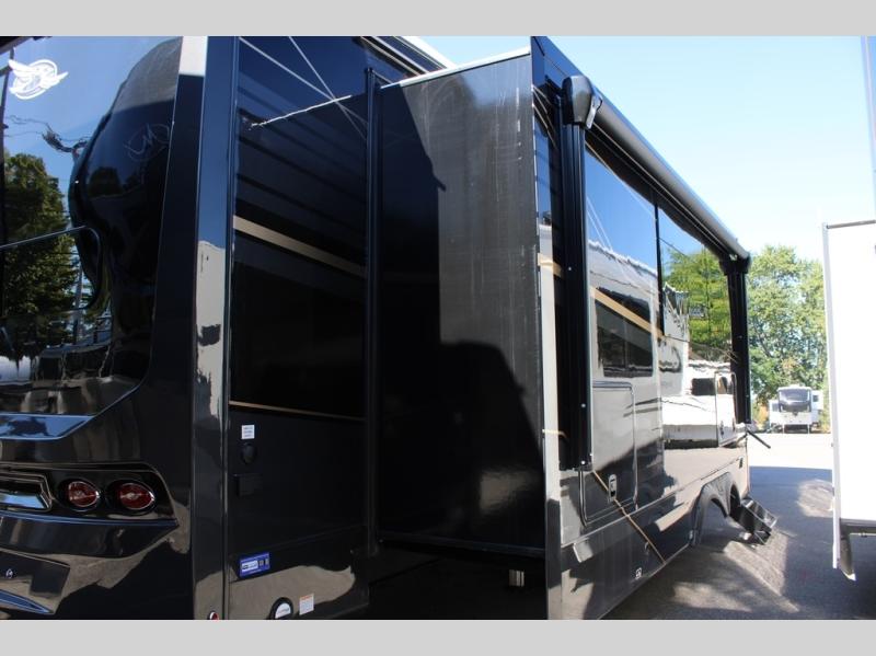 Triples slides, a desk/coffee bar, fireplace, and a huge master bath in front all indicate the kind of vacation you will experience in this Pinnacle Fifth Wheel! As you enter, a convenient half bath is located straight ahead. Slightly to your left, a nice seating area for gathering with family or friends to relax and watch TV, enjoy the fireplace while reading a book or watching a movie, and the dining table with chairs. The dinette slide also houses a 21 cu. ft. residential refrigerator and pantry. The rear kitchen features a u-shaped counter, all the appliances you need to cook like at home, even a pull-out butcher block space for chopping up your veggies. Back through and up the steps to your right in front, the master bedroom will make you feel like royalty with its king bed, plus luxurious full rear bath. A huge vanity with dual bath sinks will allow you both to get ready at the same time, plus there is a walk-in shower with a seat for added convenience. Speaking of walk-in, you will also love the spacious walk-in closet that includes washer/dryer prep.