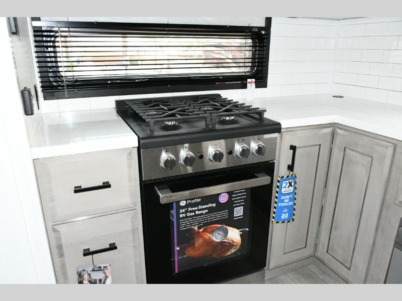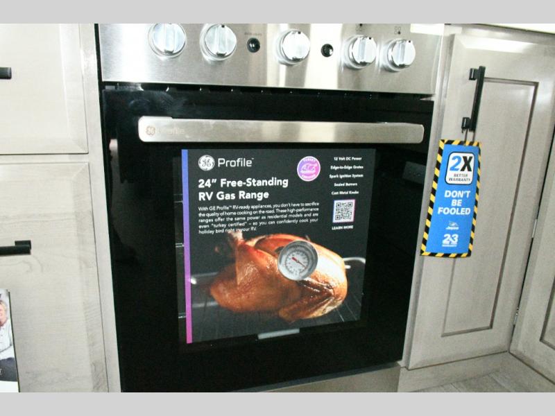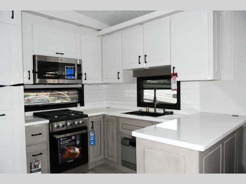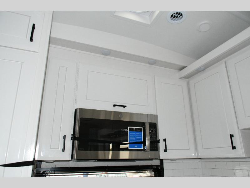 Rear Kitchen Layout – U-shaped counter with all the appliances you need to cook like at home, including a pull-out butcher block for meal prep. Ample cabinetry and a 21 cu. ft. residential refrigerator make storage and organization effortless.