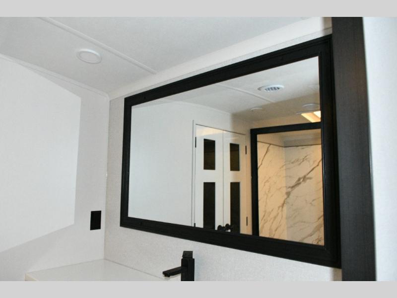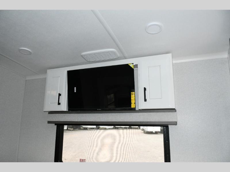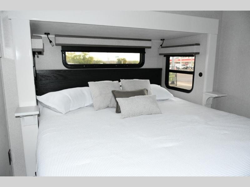 King Bed Slide Out – Retreat to a spacious master bedroom featuring a king bed slide, overhead storage, and panoramic windows for natural light.