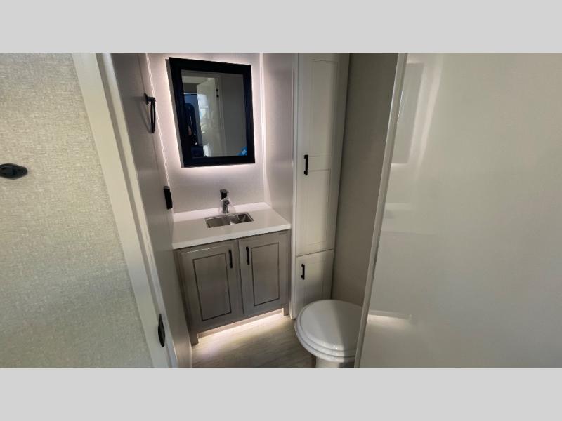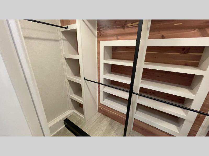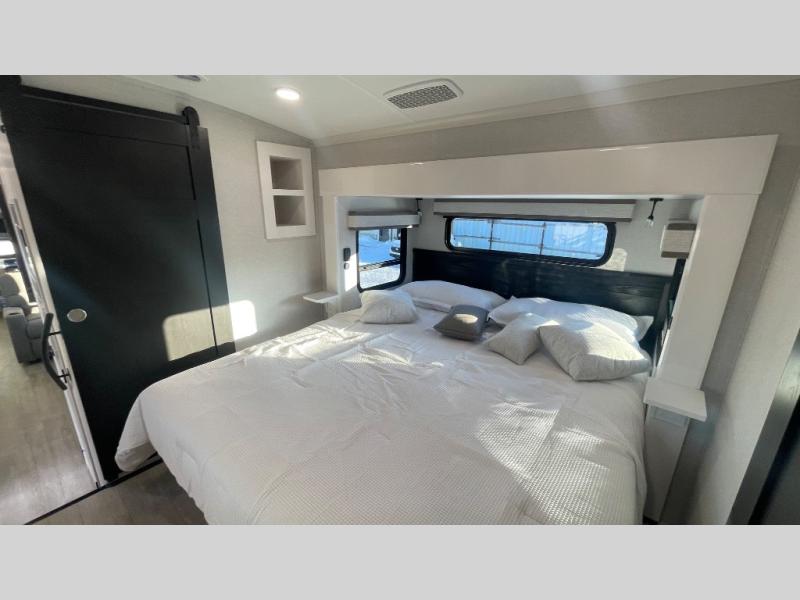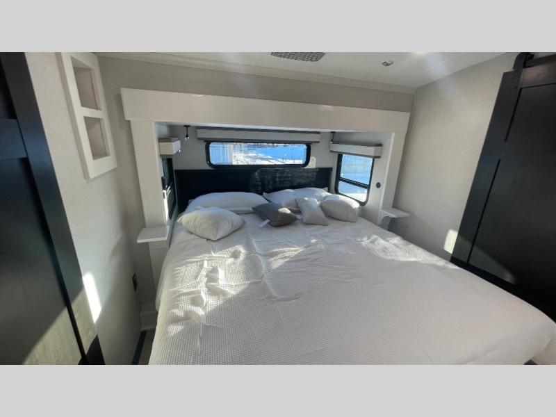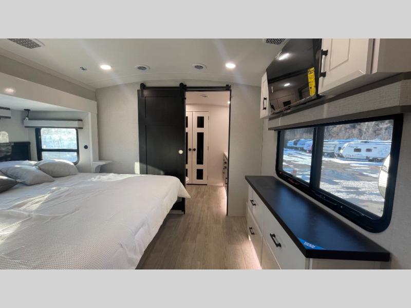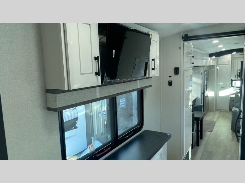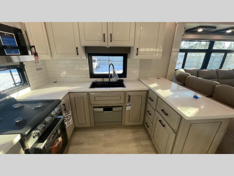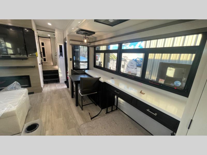 Triples slides, a desk/coffee bar, fireplace, and a huge master bath in front all indicate the kind of vacation you will experience in this Pinnacle Fifth Wheel! As you enter, a convenient half bath is located straight ahead. Slightly to your left, a nice seating area for gathering with family or friends to relax and watch TV, enjoy the fireplace while reading a book or watching a movie, and the dining table with chairs. The dinette slide also houses a 21 cu. ft. residential refrigerator and pantry. The rear kitchen features a u-shaped counter, all the appliances you need to cook like at home, even a pull-out butcher block space for chopping up your veggies. Back through and up the steps to your right in front, the master bedroom will make you feel like royalty with its king bed, plus luxurious full rear bath. A huge vanity with dual bath sinks will allow you both to get ready at the same time, plus there is a walk-in shower with a seat for added convenience. Speaking of walk-in, you will also love the spacious walk-in closet that includes washer/dryer prep.