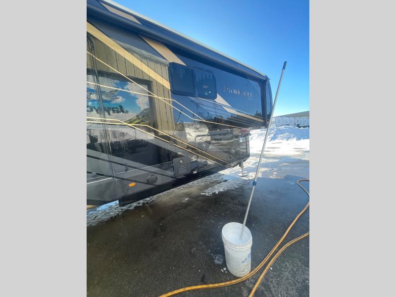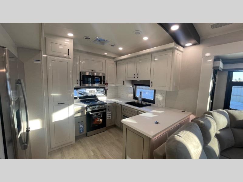 Each Pinnacle fifth wheel features Stronghold VBL lamination for the lightest, yet strongest construction in the RV industry. Add that to the Magnum Truss XL6 roof system and Climate Shield zero-degree tested weather protection and you'll be enjoying your fifth wheel for years to come. Some of the exterior conveniences you will appreciate are the Keyed-Alike lock system, the fully enclosed, universal docking center, and the 6-point hydraulic auto-leveling system for quick and easy set up. The 5 Star Handling Package will make towing a fifth wheel a walk in the park, and the two Whisper Quiet A/C units will keep you comfortable during the hot summer months. Inside, you'll enjoy the residential "Do it all" sink with pull-out kitchen faucet, glass rinse, and vegetable rinse, the handcrafted hardwood glazed cabinetry, the vinyl flooring throughout, plus many more comforts. There is even a central vacuum system, a wireless remote control system, USB ports throughout, plus many more conveniences to make each trip enjoyable.