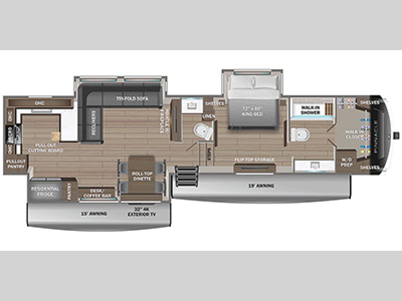 Triples slides, a desk/coffee bar, fireplace, and a huge master bath in front all indicate the kind of vacation you will experience in this Pinnacle Fifth Wheel! As you enter, a convenient half bath is located straight ahead. Slightly to your left, a nice seating area for gathering with family or friends to relax and watch TV, enjoy the fireplace while reading a book or watching a movie, and the dining table with chairs. The dinette slide also houses a 21 cu. ft. residential refrigerator and pantry. The rear kitchen features a u-shaped counter, all the appliances you need to cook like at home, even a pull-out butcher block space for chopping up your veggies. Back through and up the steps to your right in front, the master bedroom will make you feel like royalty with its king bed, plus luxurious full rear bath. A huge vanity with dual bath sinks will allow you both to get ready at the same time, plus there is a walk-in shower with a seat for added convenience. Speaking of walk-in, you will also love the spacious walk-in closet that includes washer/dryer prep.