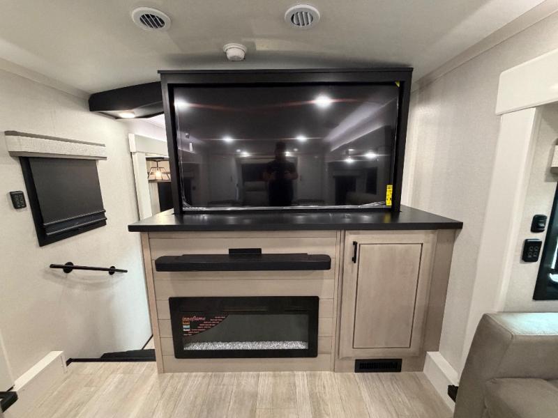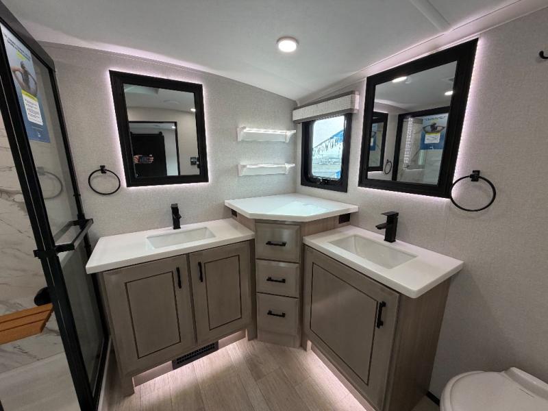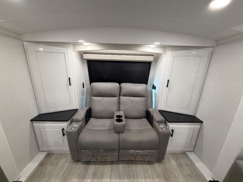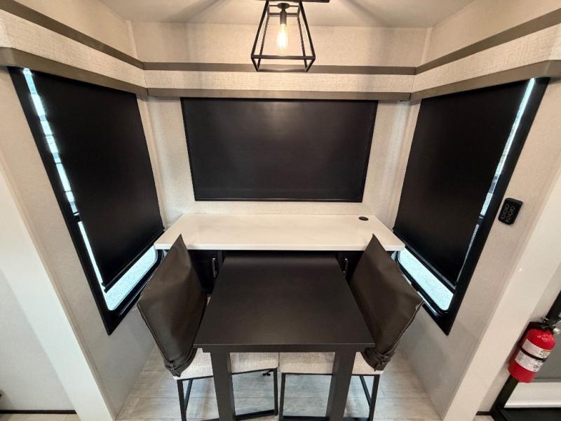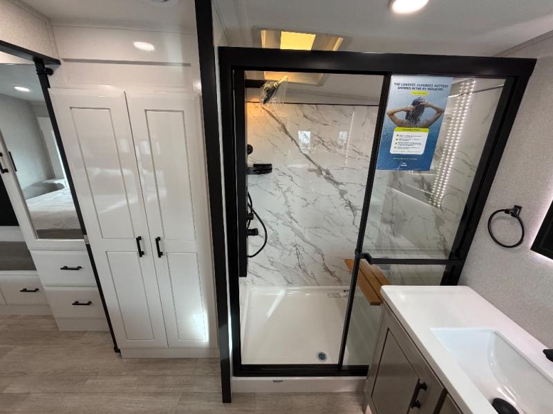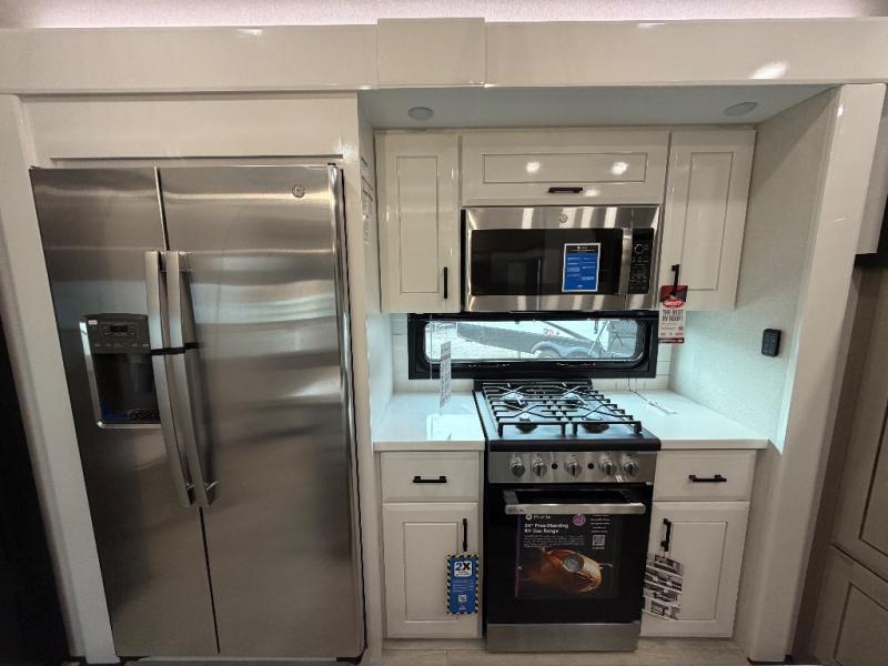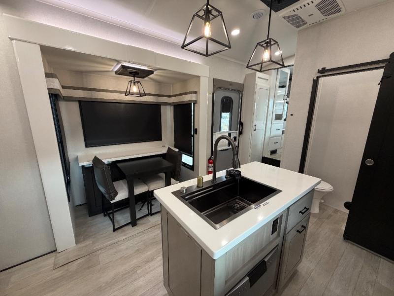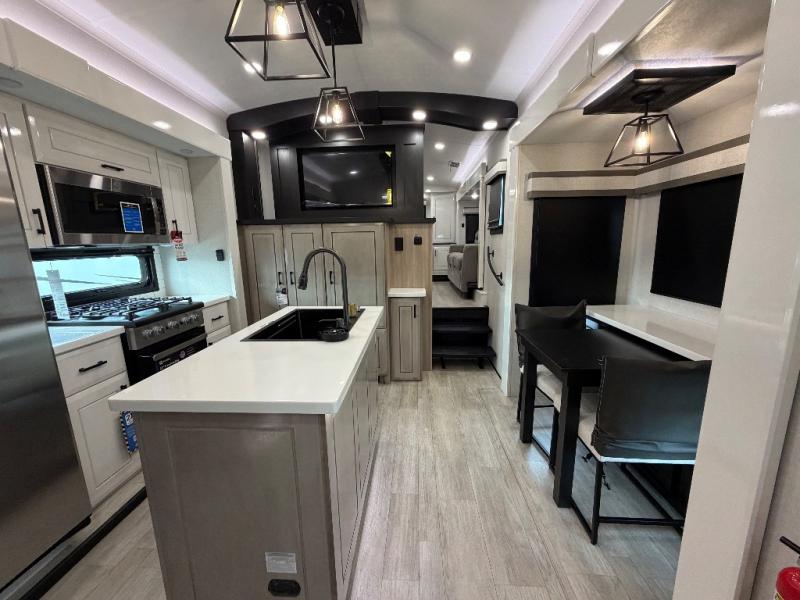 At the front of this fifth wheel, a spacious living area welcomes you with a theater seat and dual opposing slides that hold two tri-fold sofas, perfect for gathering the whole crew after a day of adventure and easily converted into extra sleeping space when needed. A 65" TV enhances cozy movie nights. Moving into the center, the kitchen opens up with its own slide-out, offering a 21-cu. ft. residential refrigerator, 30" convection microwave, 24" range, and plenty of overhead cabinets, along with a functional island equipped with a sink, pull-out cutting board, and generous prep space. A pantry sits conveniently nearby for dry goods, while a half bath across the way adds everyday convenience. Opposite the island, a roll-top dinette in another slide provides even more room to move around and the perfect spot for meals or board games. Toward the rear, the spacious bedroom features a 72" x 80" king bed in a slide for added walking space, along with a bench, a 32" TV, and dual wardrobes for clothing and essentials. At the very back, a luxurious full bathroom awaits, complete with double sinks for smooth morning routines and a 36" x 48" shower with a built-in seat for comfort and accessibility.