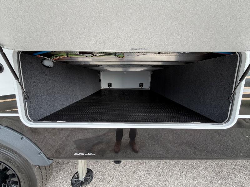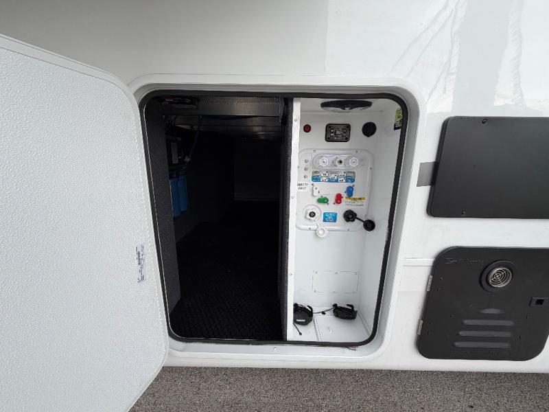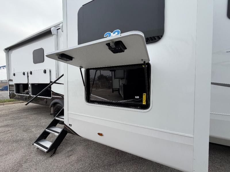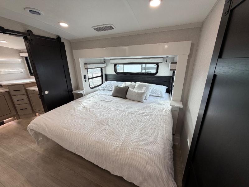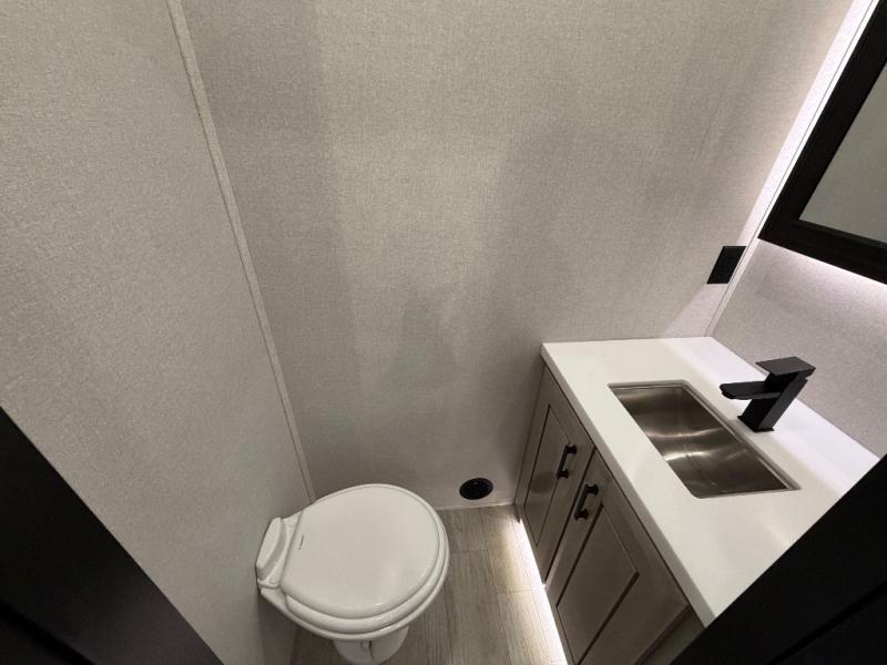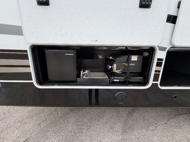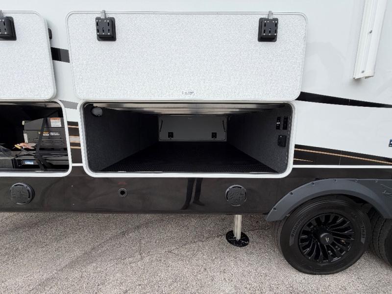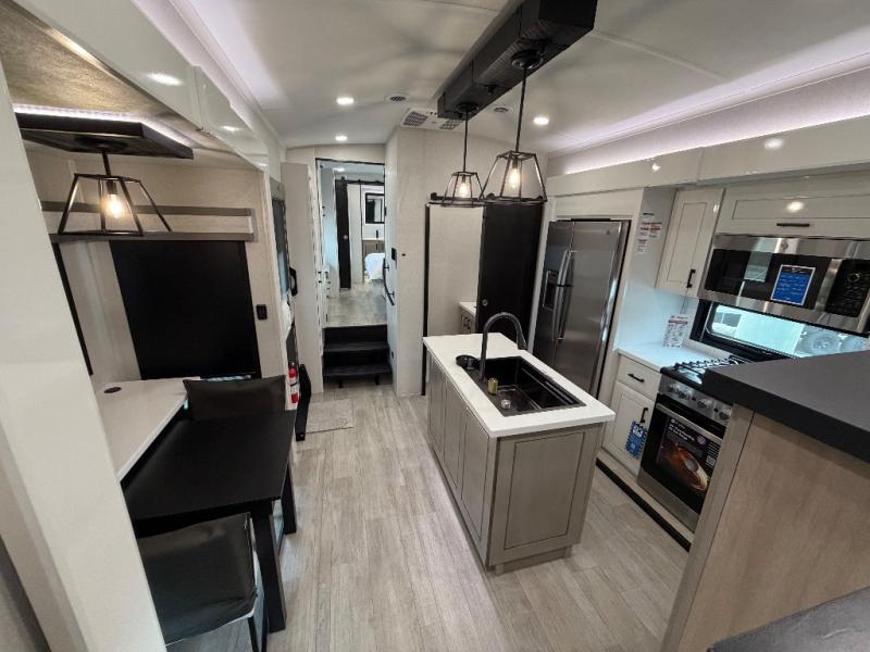 At the front of this fifth wheel, a spacious living area welcomes you with a theater seat and dual opposing slides that hold two tri-fold sofas, perfect for gathering the whole crew after a day of adventure and easily converted into extra sleeping space when needed. A 65" TV enhances cozy movie nights. Moving into the center, the kitchen opens up with its own slide-out, offering a 21-cu. ft. residential refrigerator, 30" convection microwave, 24" range, and plenty of overhead cabinets, along with a functional island equipped with a sink, pull-out cutting board, and generous prep space. A pantry sits conveniently nearby for dry goods, while a half bath across the way adds everyday convenience. Opposite the island, a roll-top dinette in another slide provides even more room to move around and the perfect spot for meals or board games. Toward the rear, the spacious bedroom features a 72" x 80" king bed in a slide for added walking space, along with a bench, a 32" TV, and dual wardrobes for clothing and essentials. At the very back, a luxurious full bathroom awaits, complete with double sinks for smooth morning routines and a 36" x 48" shower with a built-in seat for comfort and accessibility.