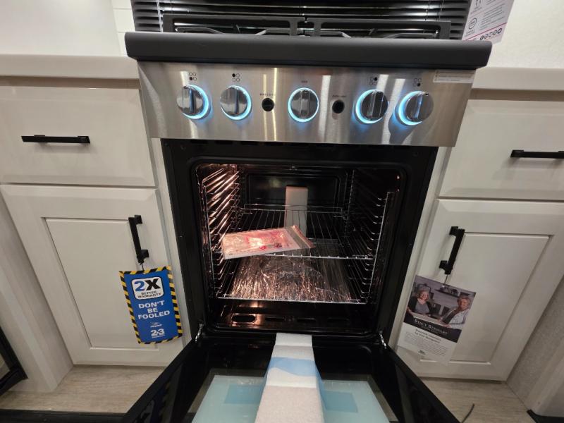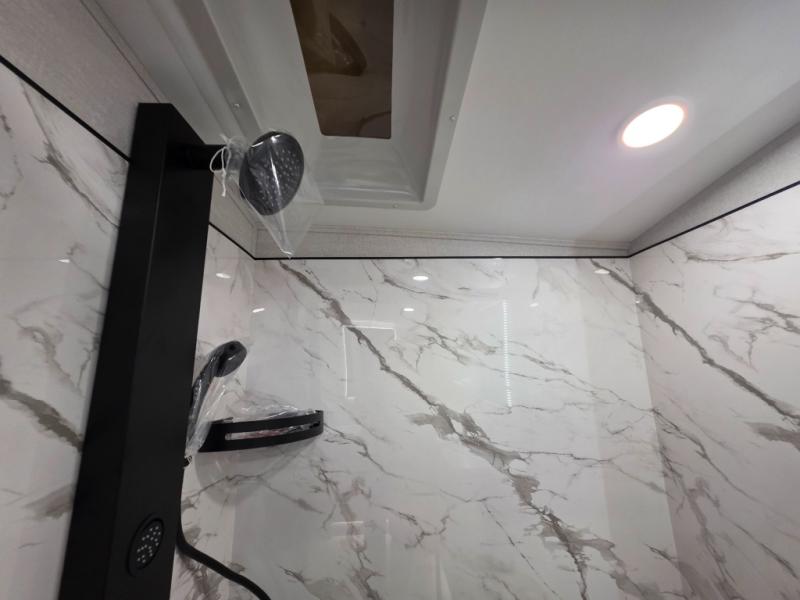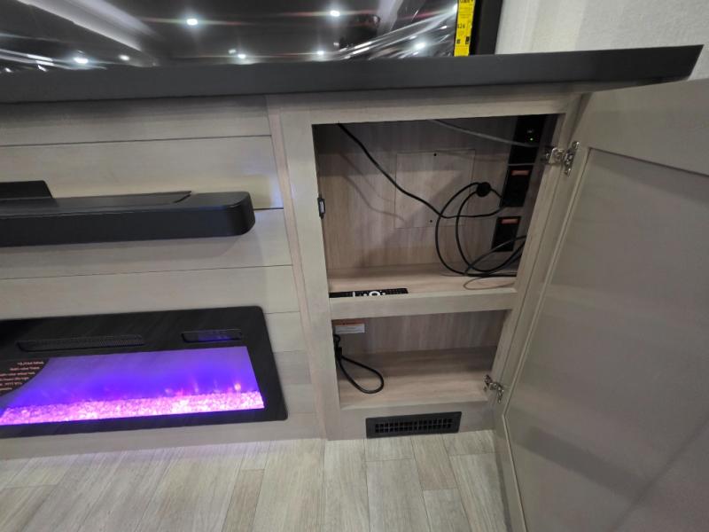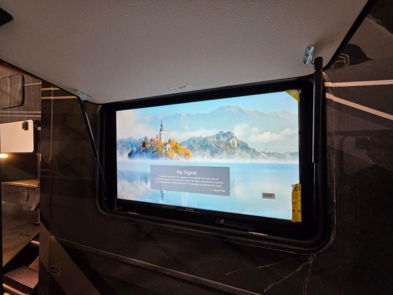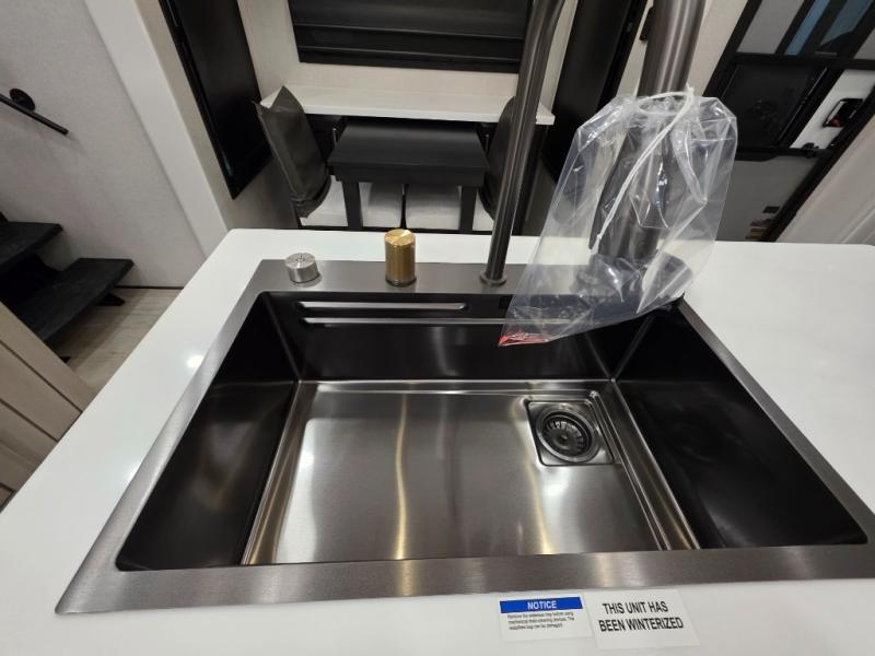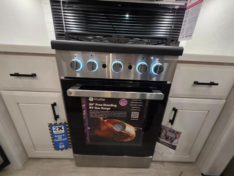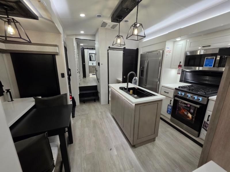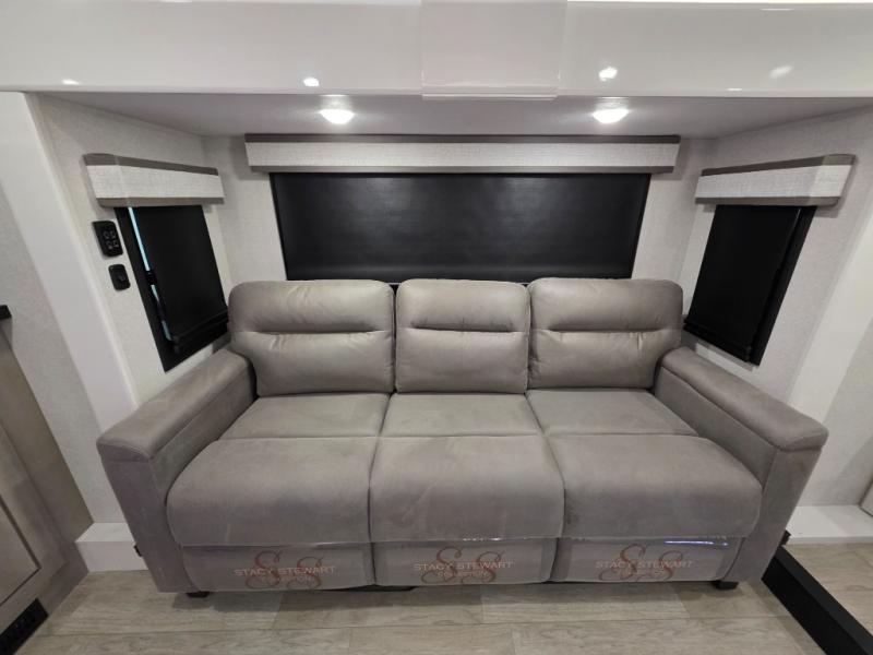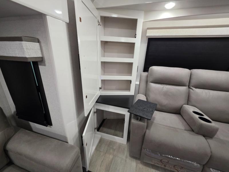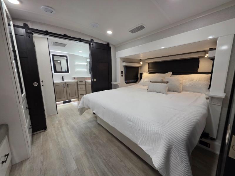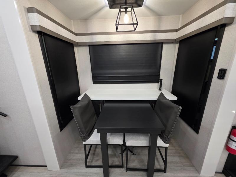 At the front of this fifth wheel, a spacious living area welcomes you with a theater seat and dual opposing slides that hold two tri-fold sofas, perfect for gathering the whole crew after a day of adventure and easily converted into extra sleeping space when needed. A 65" TV enhances cozy movie nights. Moving into the center, the kitchen opens up with its own slide-out, offering a 21-cu. ft. residential refrigerator, 30" convection microwave, 24" range, and plenty of overhead cabinets, along with a functional island equipped with a sink, pull-out cutting board, and generous prep space. A pantry sits conveniently nearby for dry goods, while a half bath across the way adds everyday convenience. Opposite the island, a roll-top dinette in another slide provides even more room to move around and the perfect spot for meals or board games. Toward the rear, the spacious bedroom features a 72" x 80" king bed in a slide for added walking space, along with a bench, a 32" TV, and dual wardrobes for clothing and essentials. At the very back, a luxurious full bathroom awaits, complete with double sinks for smooth morning routines and a 36" x 48" shower with a built-in seat for comfort and accessibility.