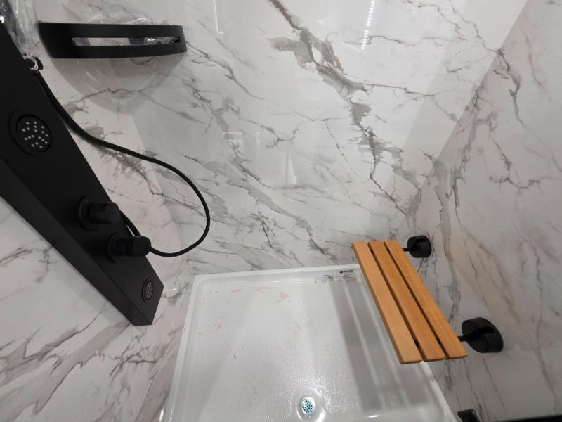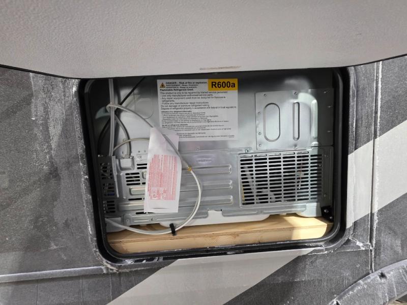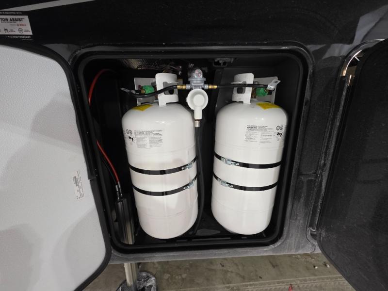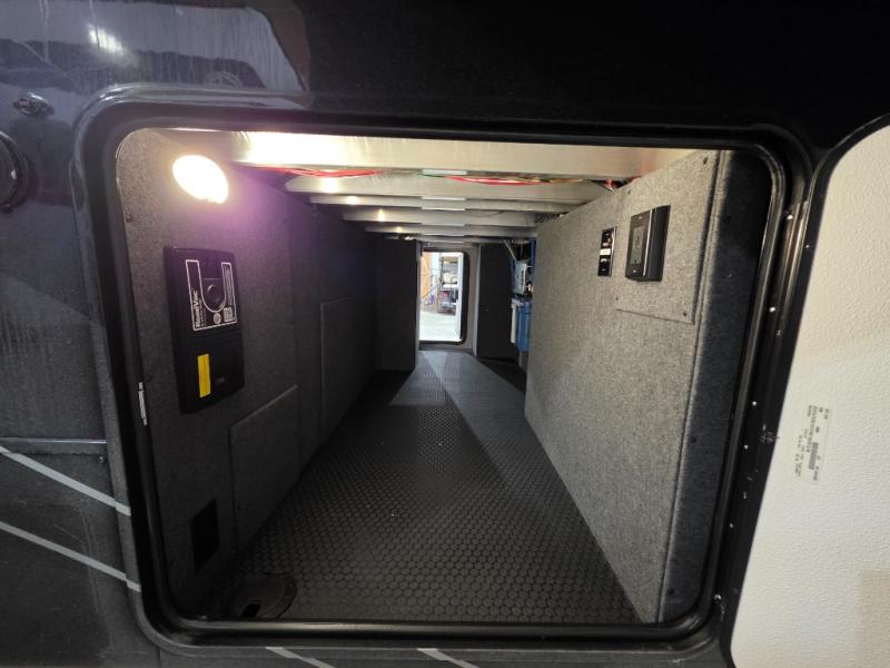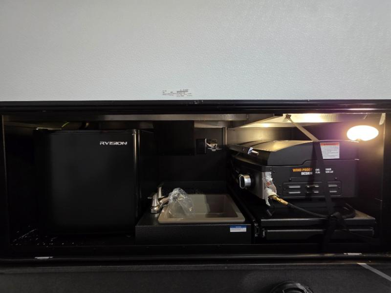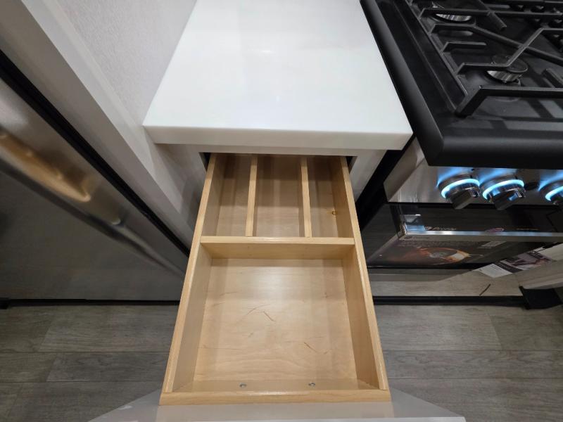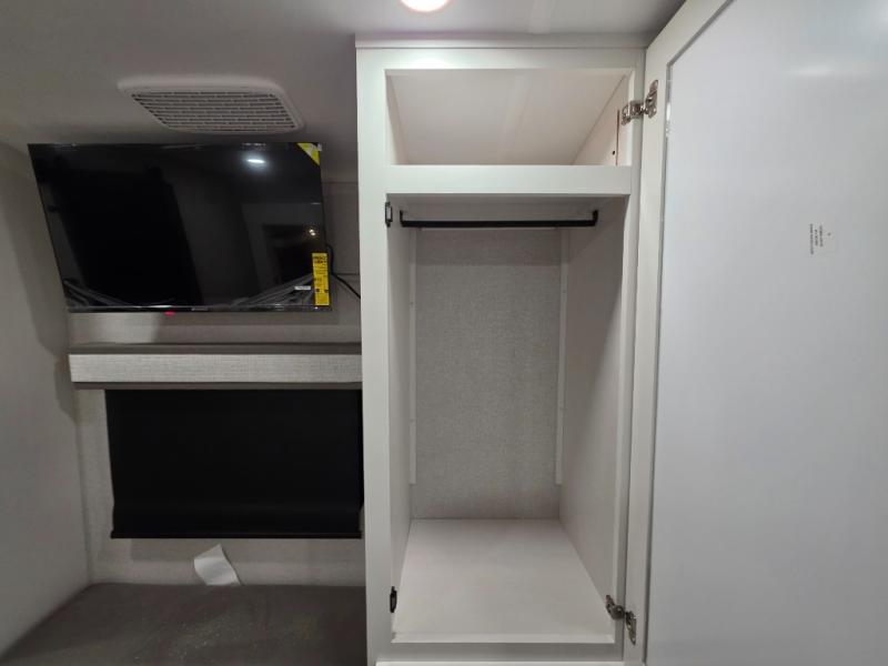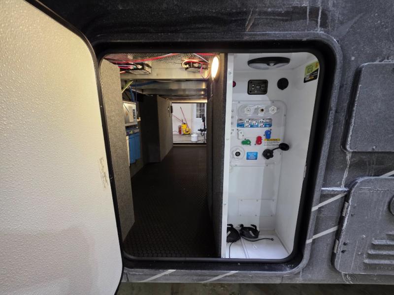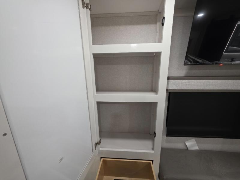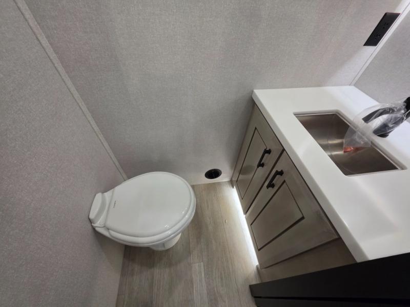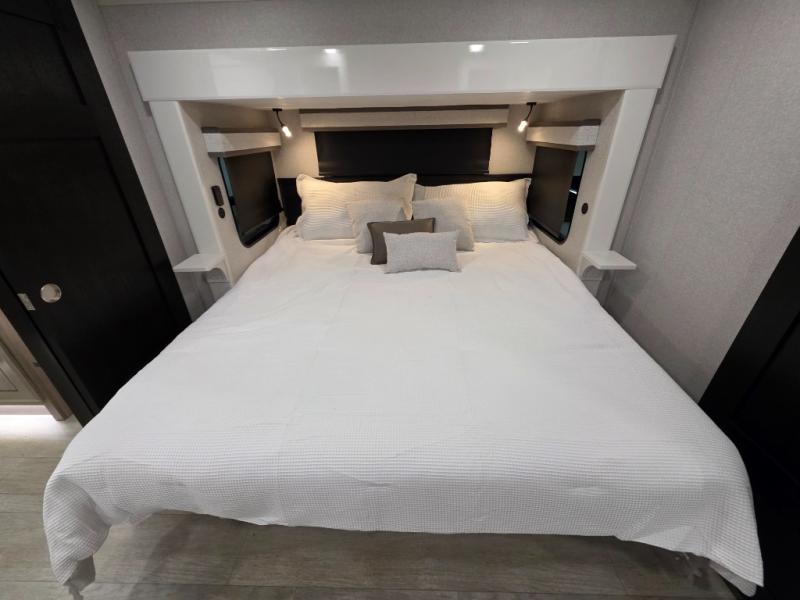At the front of this fifth wheel, a spacious living area welcomes you with a theater seat and dual opposing slides that hold two tri-fold sofas, perfect for gathering the whole crew after a day of adventure and easily converted into extra sleeping space when needed. A 65" TV enhances cozy movie nights. Moving into the center, the kitchen opens up with its own slide-out, offering a 21-cu. ft. residential refrigerator, 30" convection microwave, 24" range, and plenty of overhead cabinets, along with a functional island equipped with a sink, pull-out cutting board, and generous prep space. A pantry sits conveniently nearby for dry goods, while a half bath across the way adds everyday convenience. Opposite the island, a roll-top dinette in another slide provides even more room to move around and the perfect spot for meals or board games. Toward the rear, the spacious bedroom features a 72" x 80" king bed in a slide for added walking space, along with a bench, a 32" TV, and dual wardrobes for clothing and essentials. At the very back, a luxurious full bathroom awaits, complete with double sinks for smooth morning routines and a 36" x 48" shower with a built-in seat for comfort and accessibility.