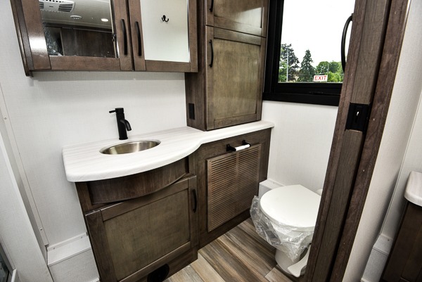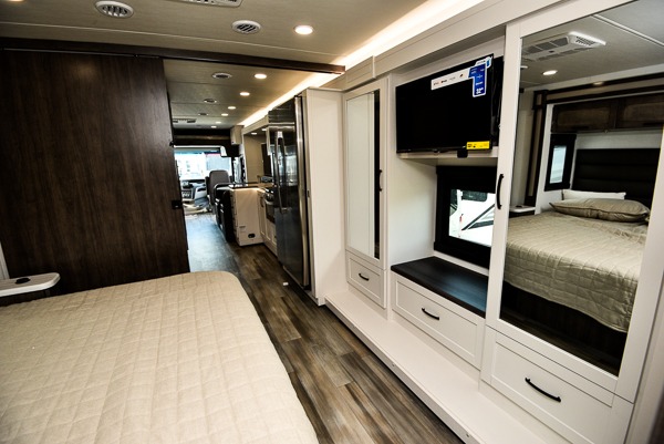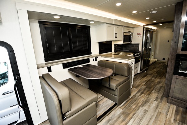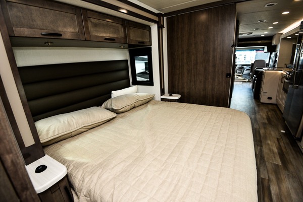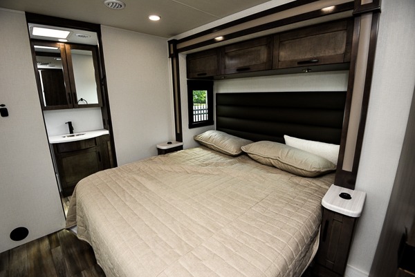Grab your luggage, your beach towel, your hiking boots, and your favorite people and head out to a new scenic destination in this Precept Class A gas motorhome! The first thing you'll notice about this coach is how spacious it is. With a full-wall slide, a bedroom slide, and a living room slide, you'll be able to live freely. The other thing that will catch your eye is the full bathroom in the back and the half bathroom in the middle. You'll easily be able to rest on the hide-a-bed sofa, theater sofa, and booth dinette after a tiresome day, and if you want to just go straight to bed, you can lie down on the king-size bed. You can also provide your group with some extra sleeping space by adding the optional drop-down overhead bunk above the cab.